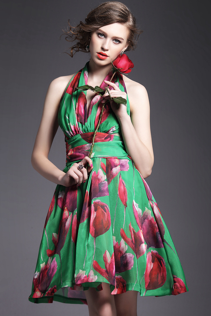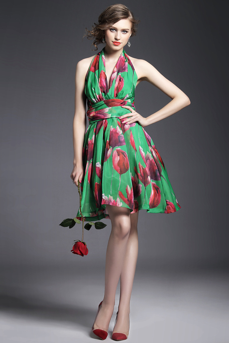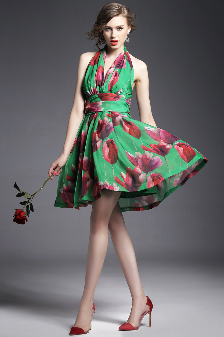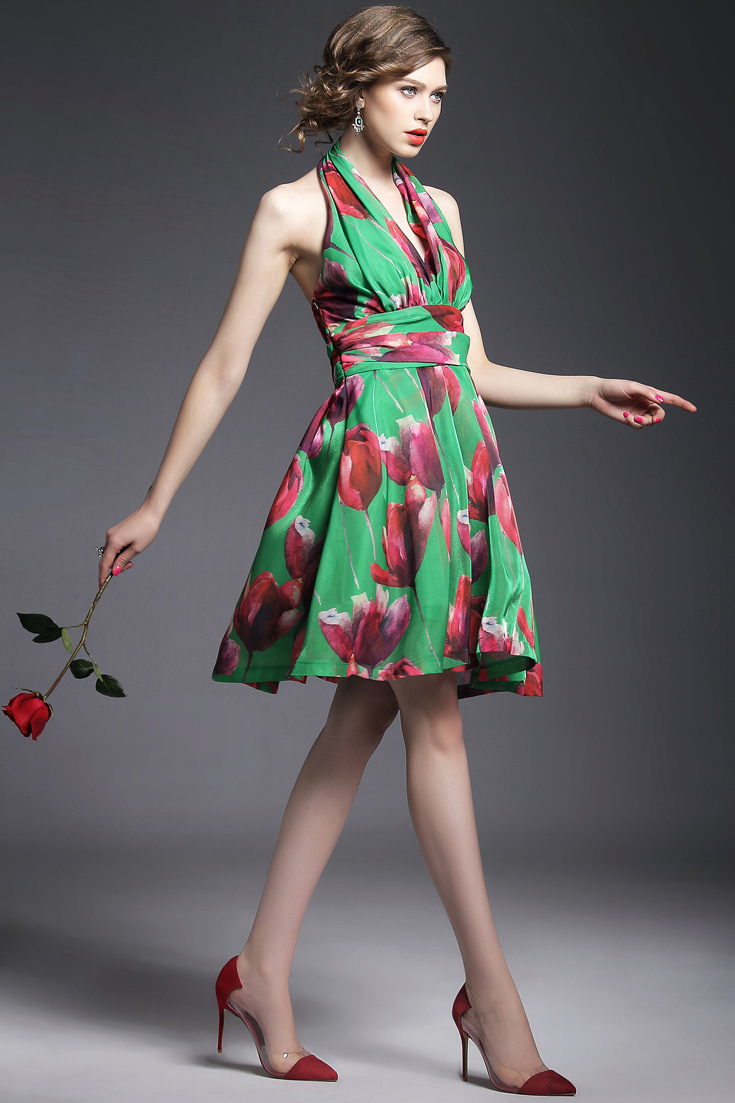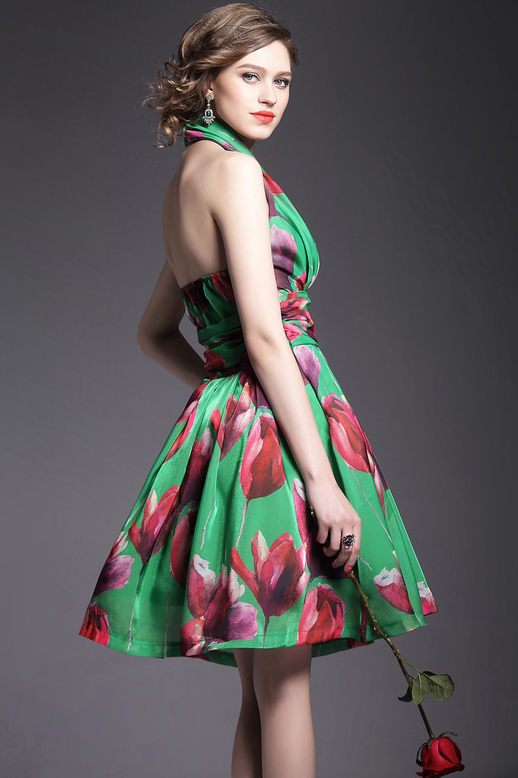 > 2015夏季女装 欧美高端印花束腰修身性感露背礼服蓬蓬裙子