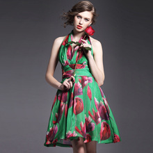 2015夏季女装 欧美高端印花束腰修身性感露背礼服蓬蓬裙子