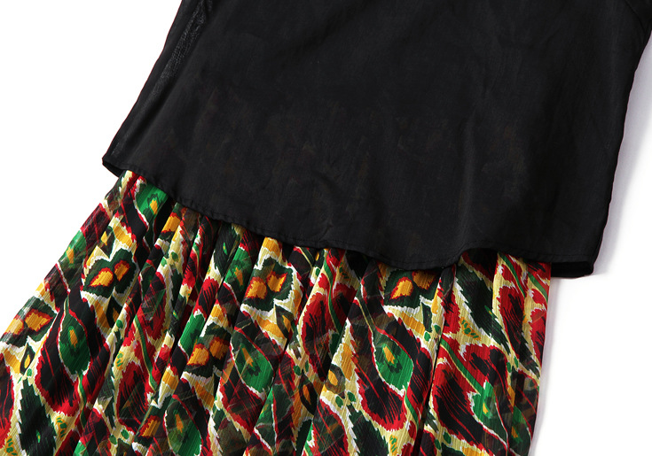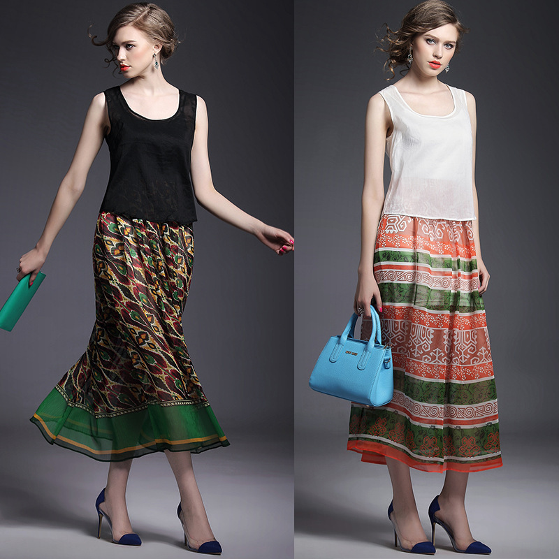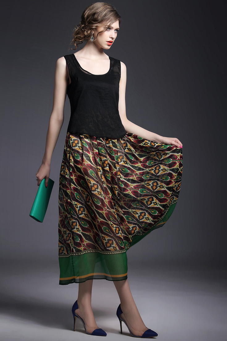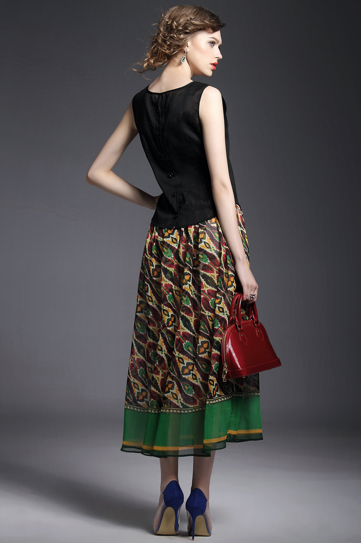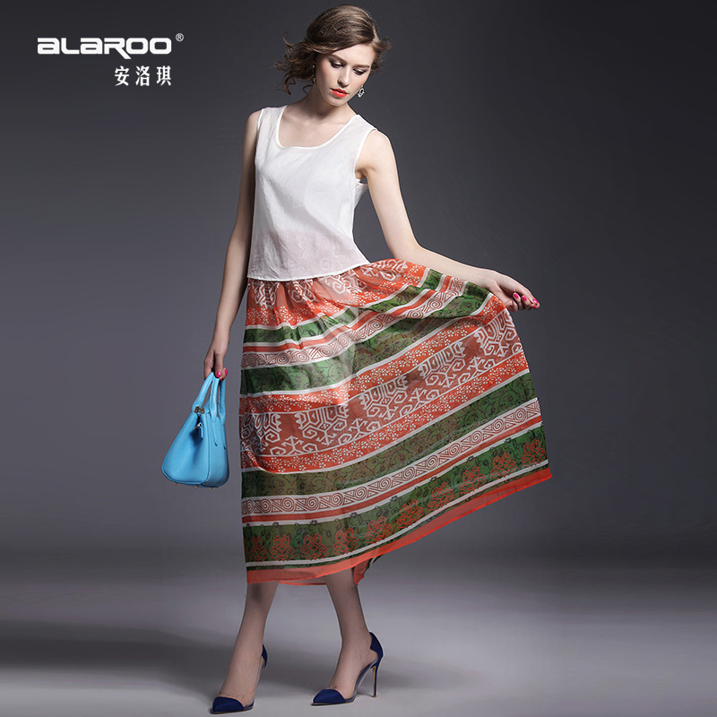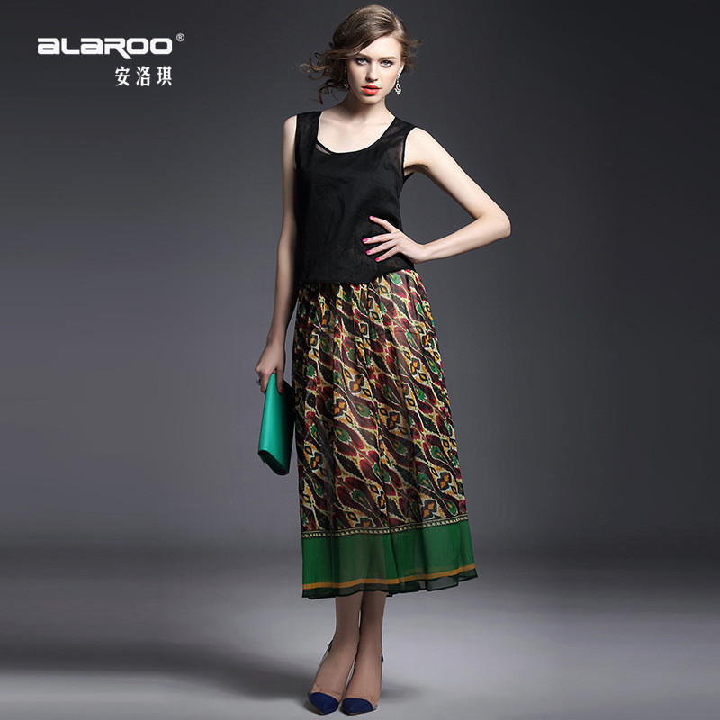 2015夏季女装 无袖纯色丝麻单排扣上衣+吊带印花真丝长裙两件套