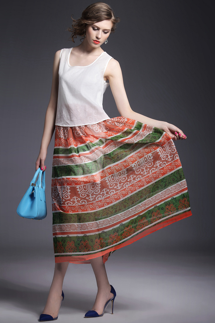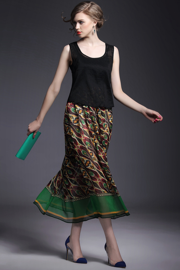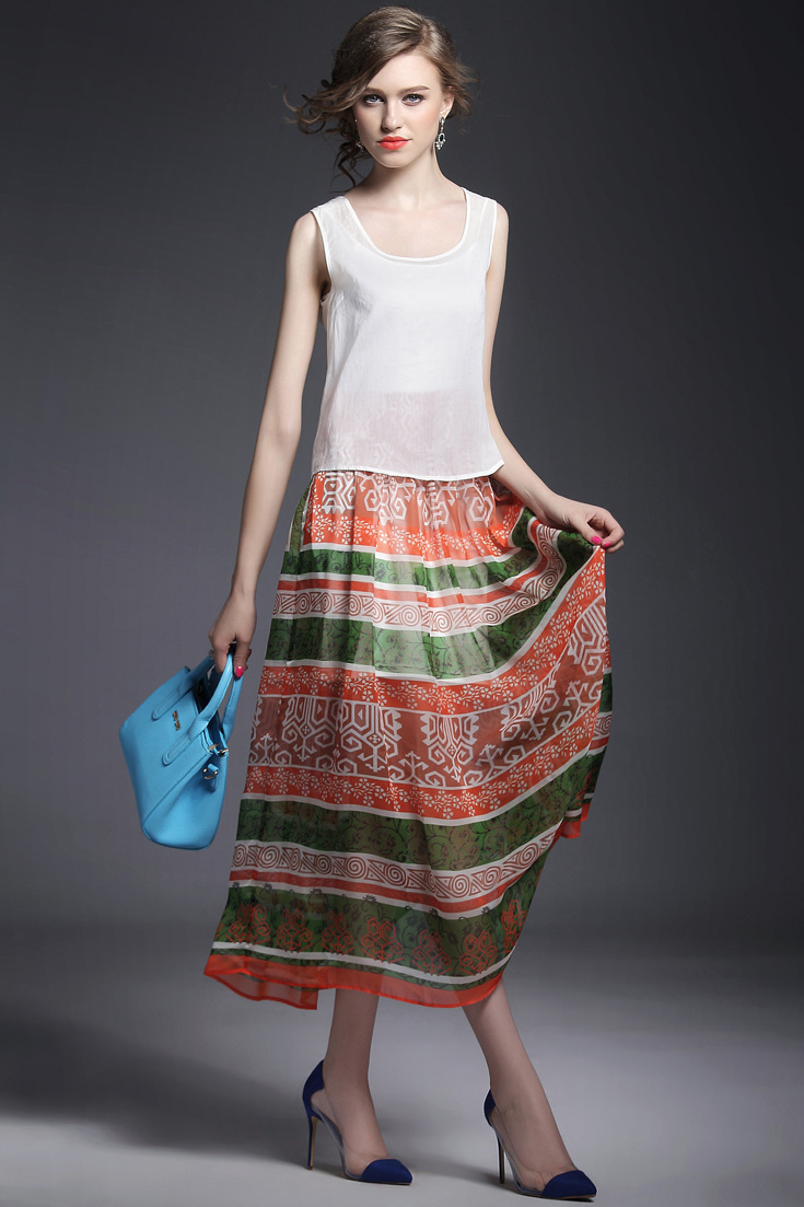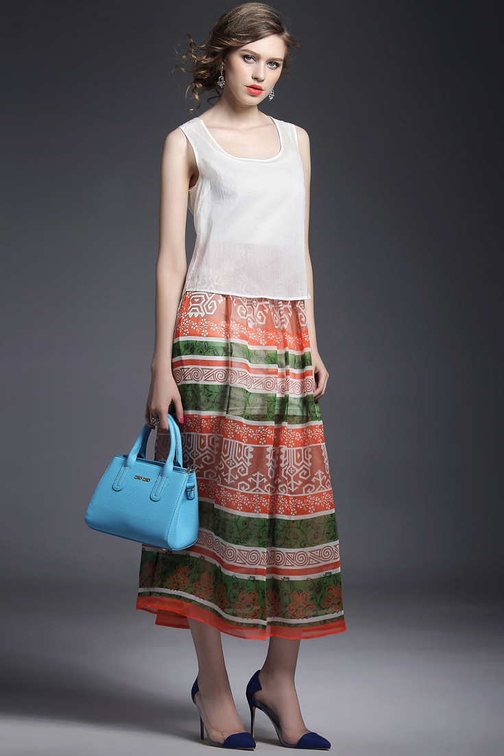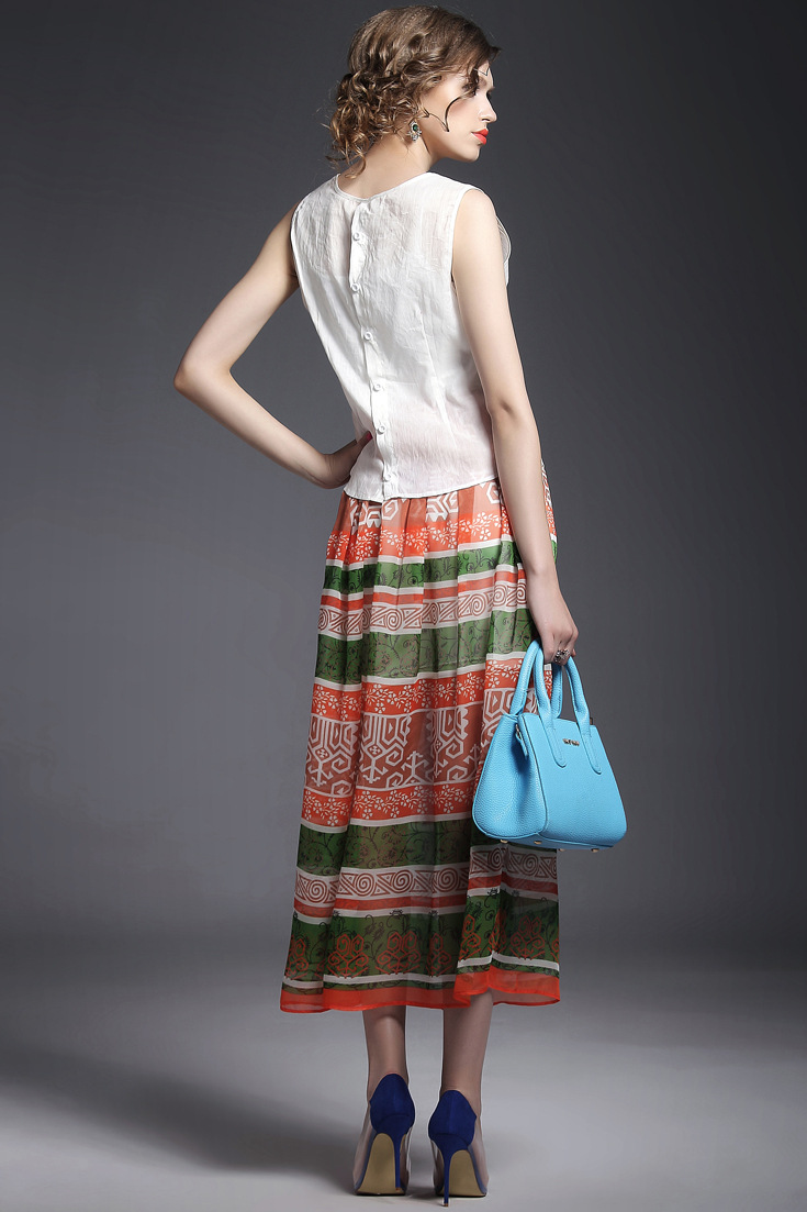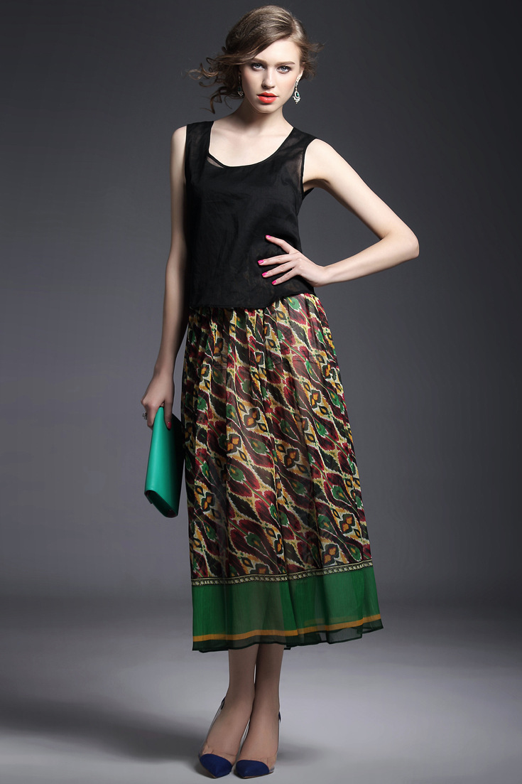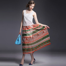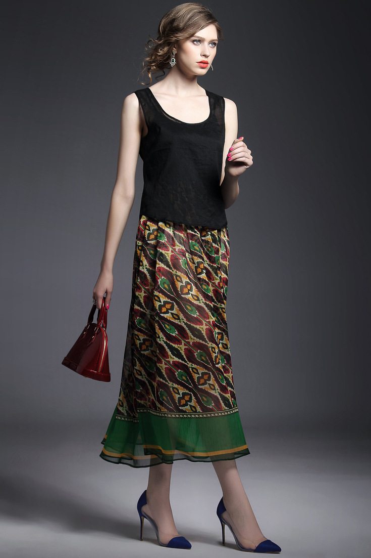 > 2015夏季女装 无袖纯色丝麻单排扣上衣+吊带印花真丝长裙两件套