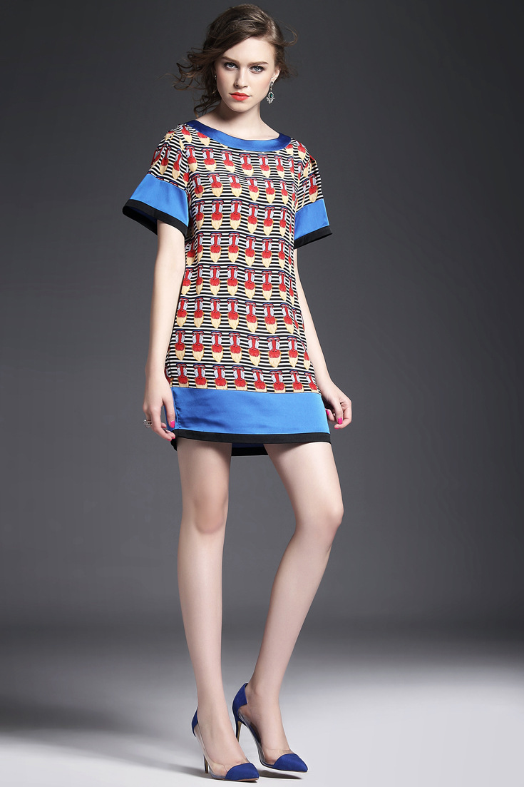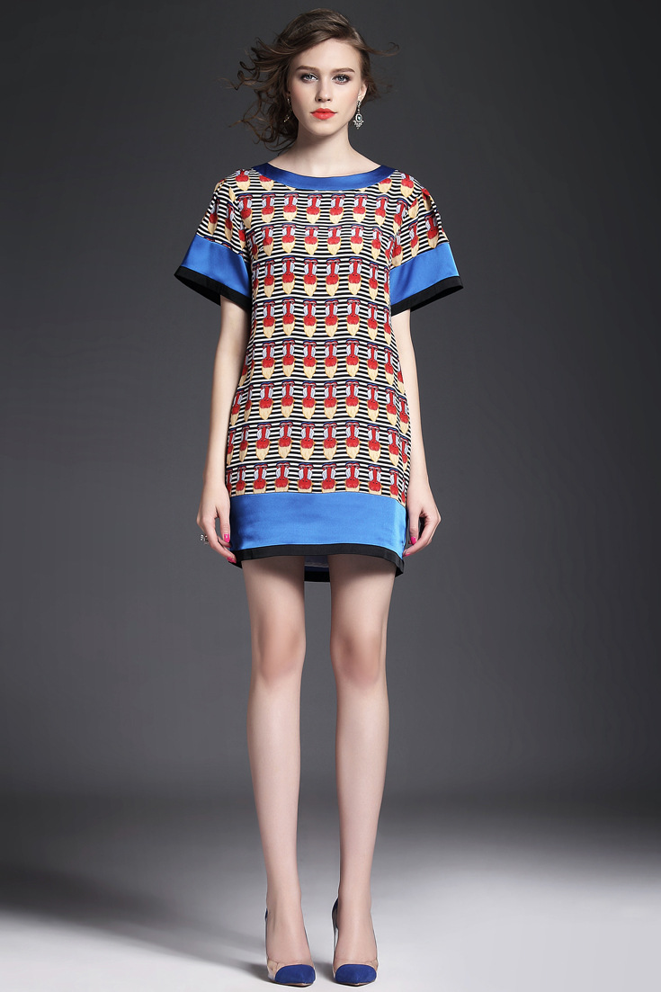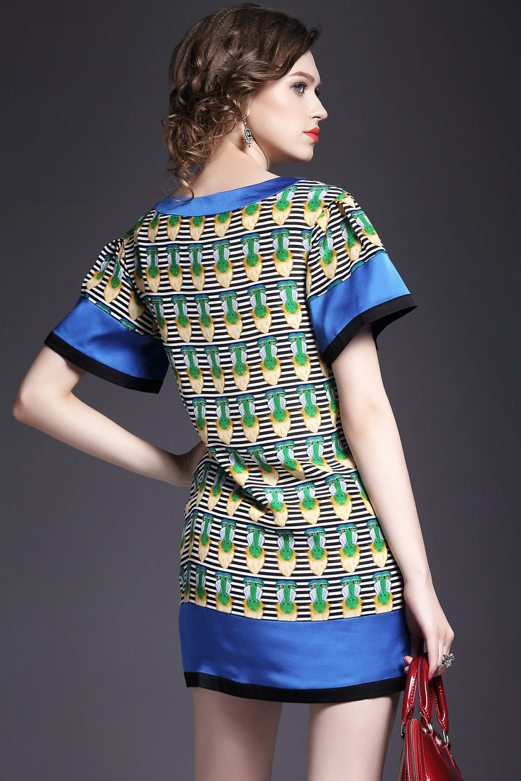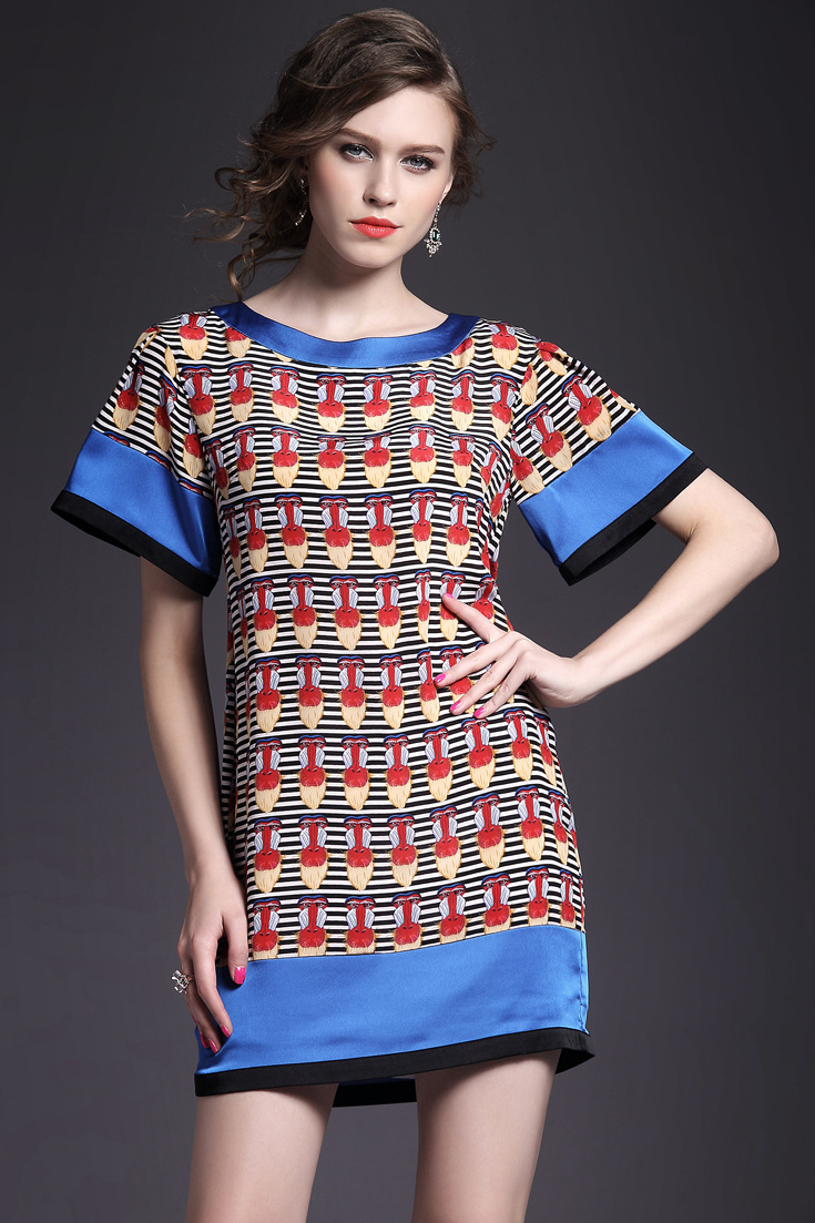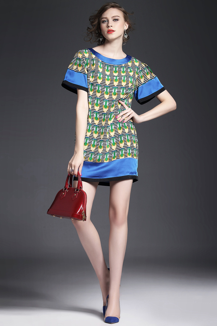 2015女装夏季新款 欧美高端圆领短袖弹力真丝印花修身一步裙