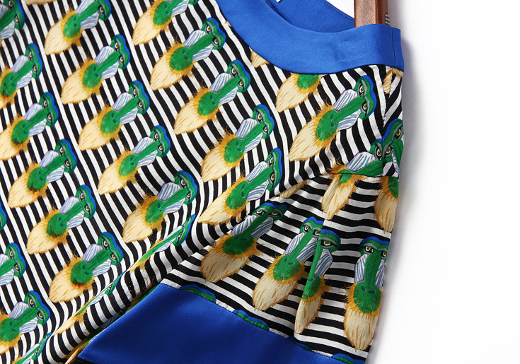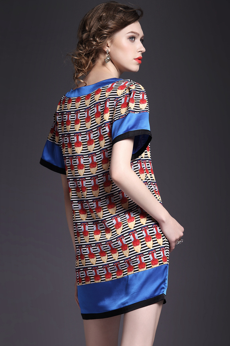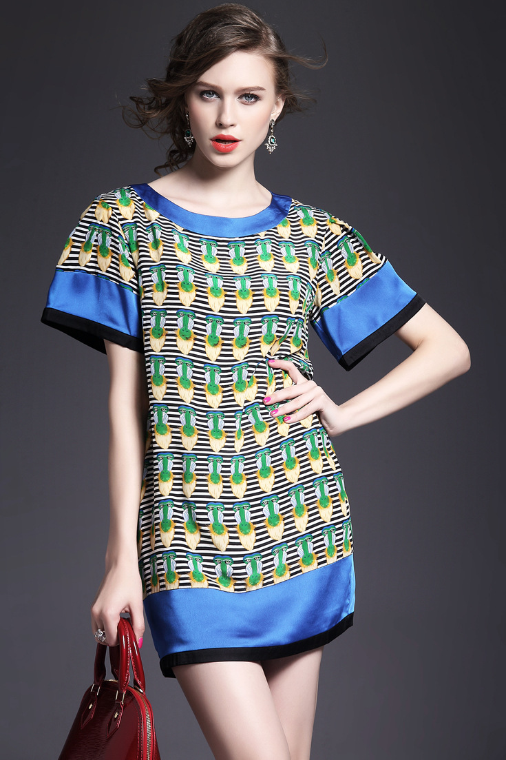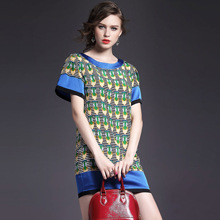 > 2015女装夏季新款 欧美高端圆领短袖弹力真丝印花修身一步裙