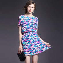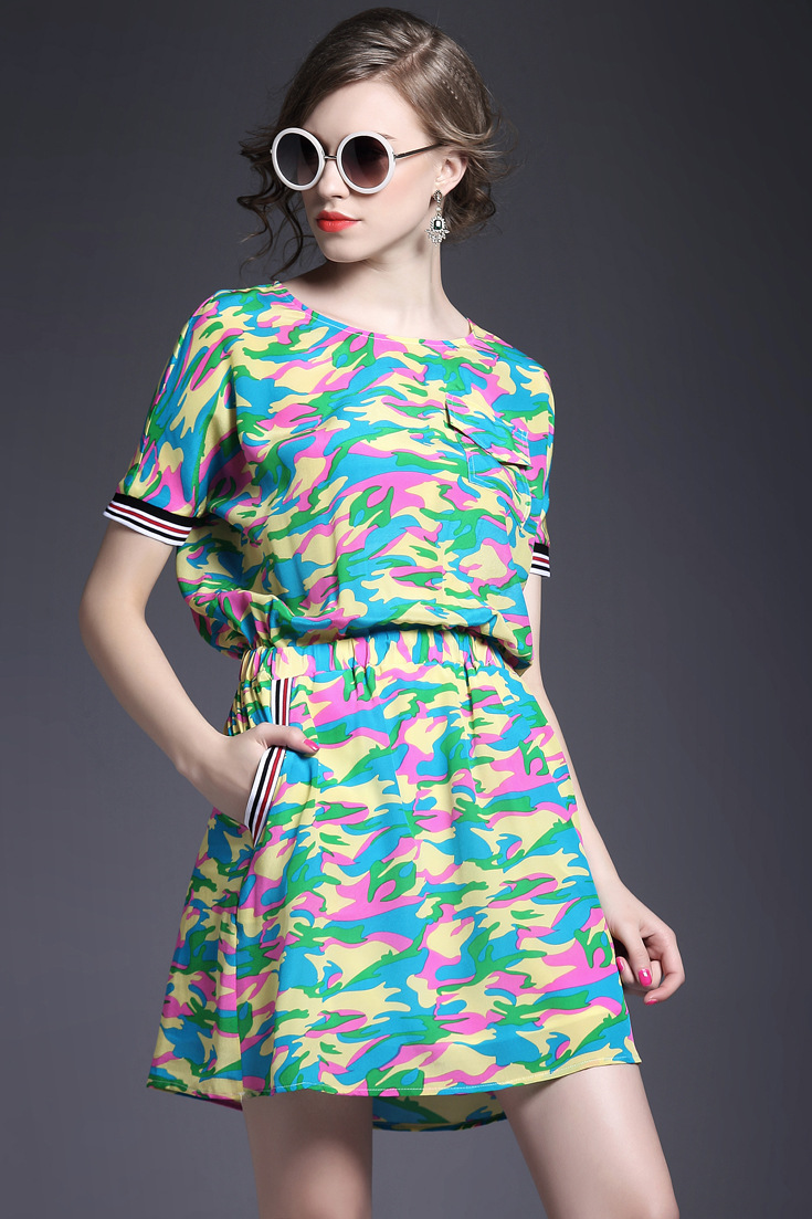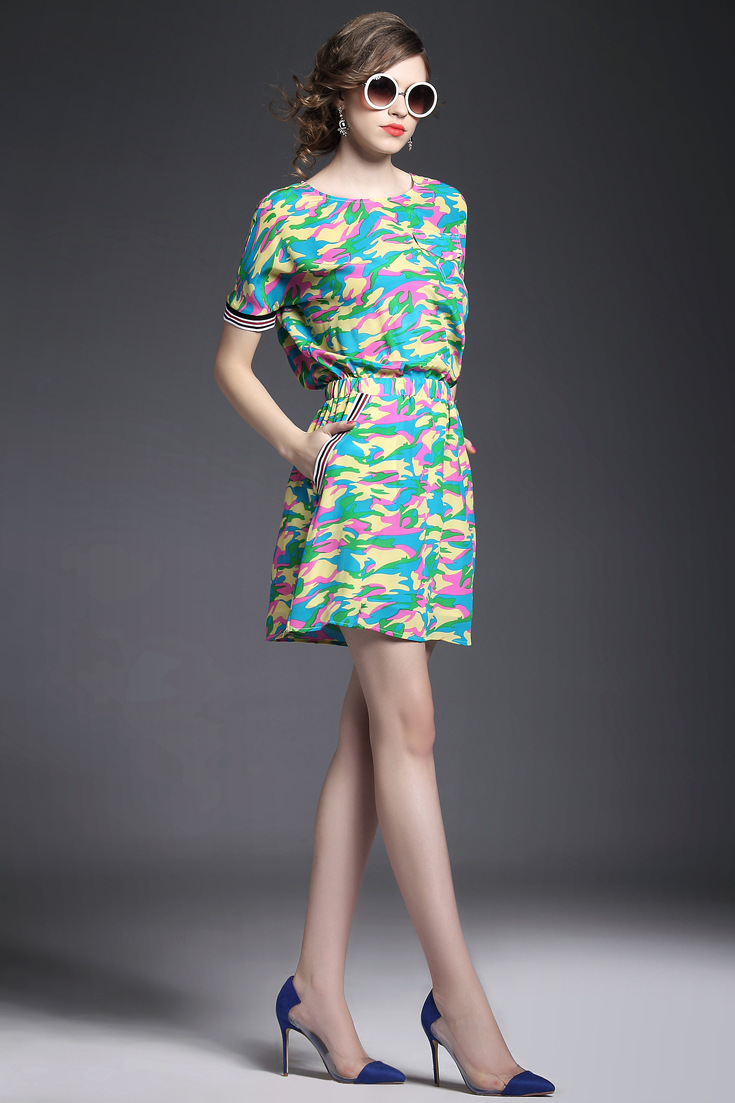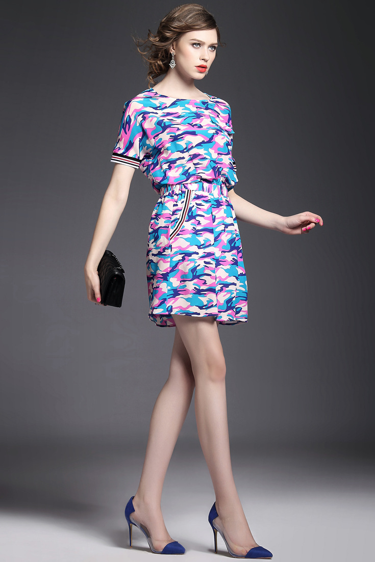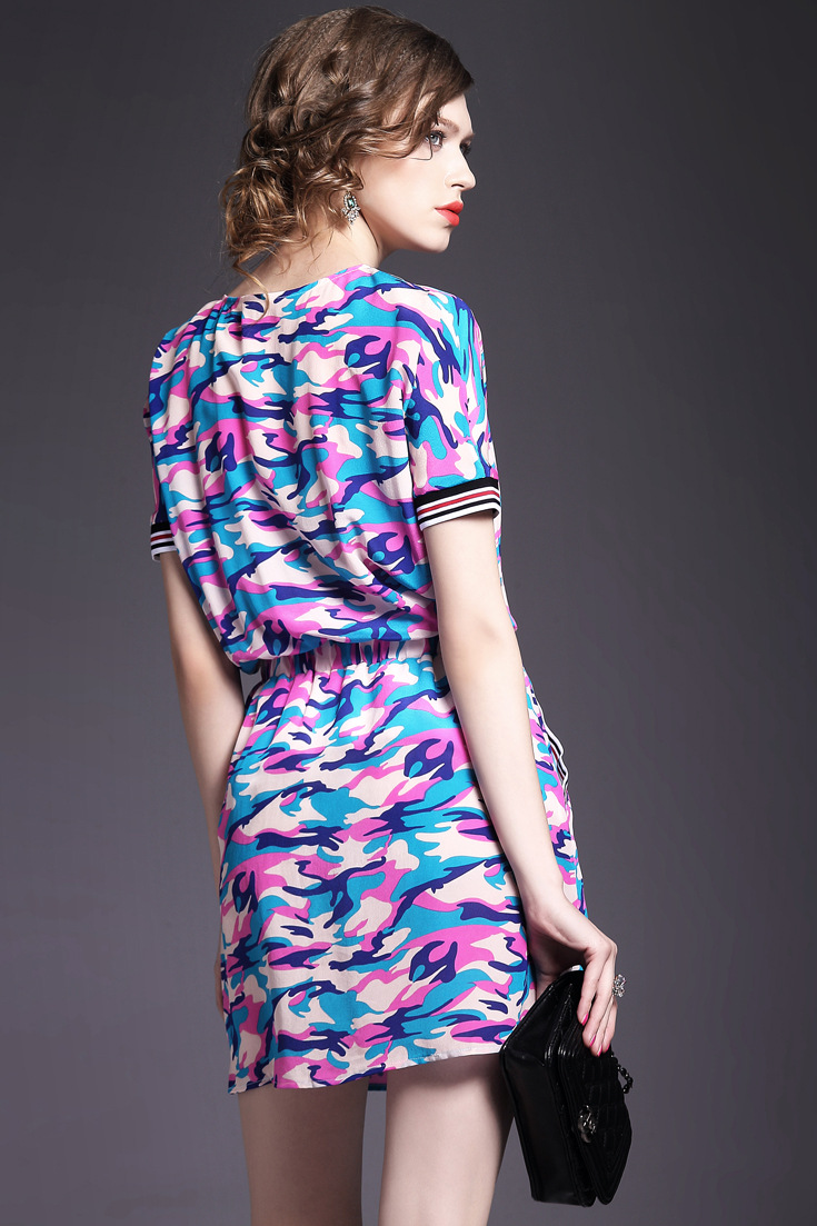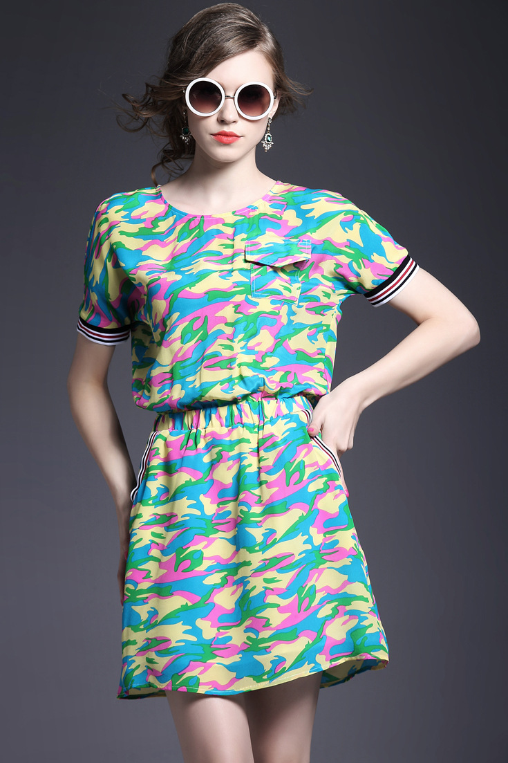 > 2015夏季女装圆领螺纹袖口弹力收腰口袋拼接迷彩印花真丝连衣裙子