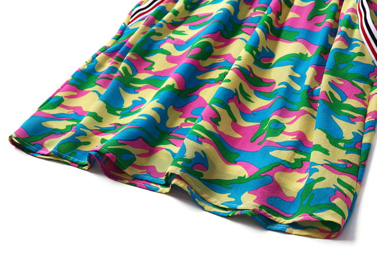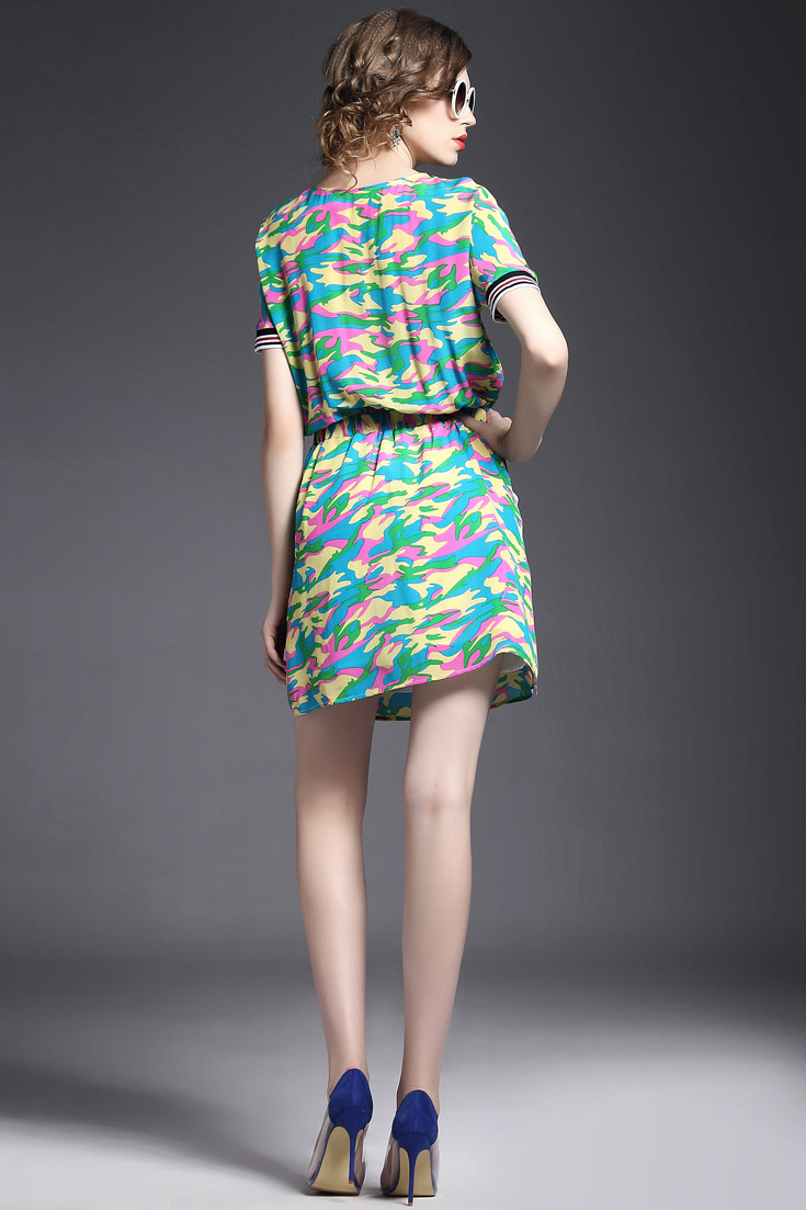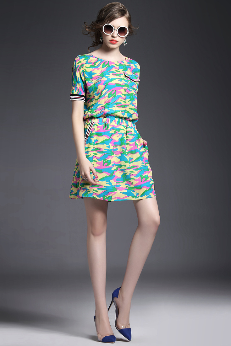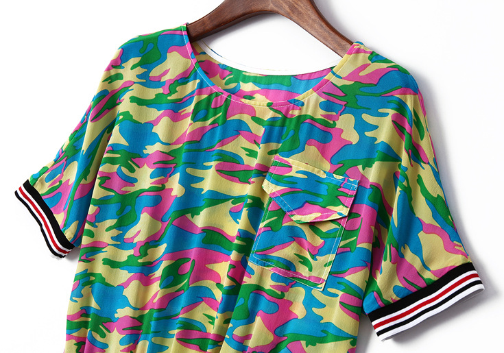 2015夏季女装圆领螺纹袖口弹力收腰口袋拼接迷彩印花真丝连衣裙子