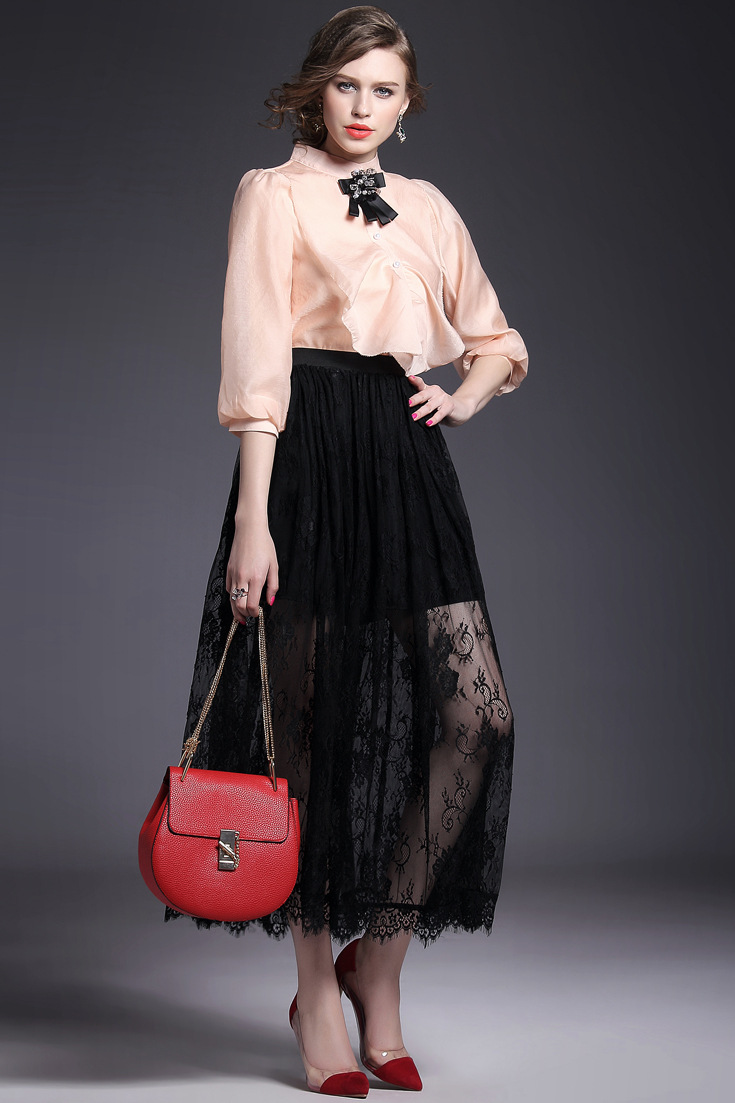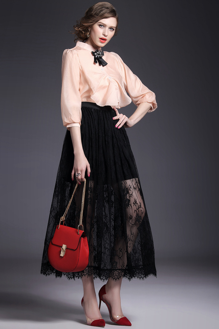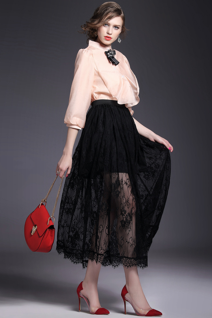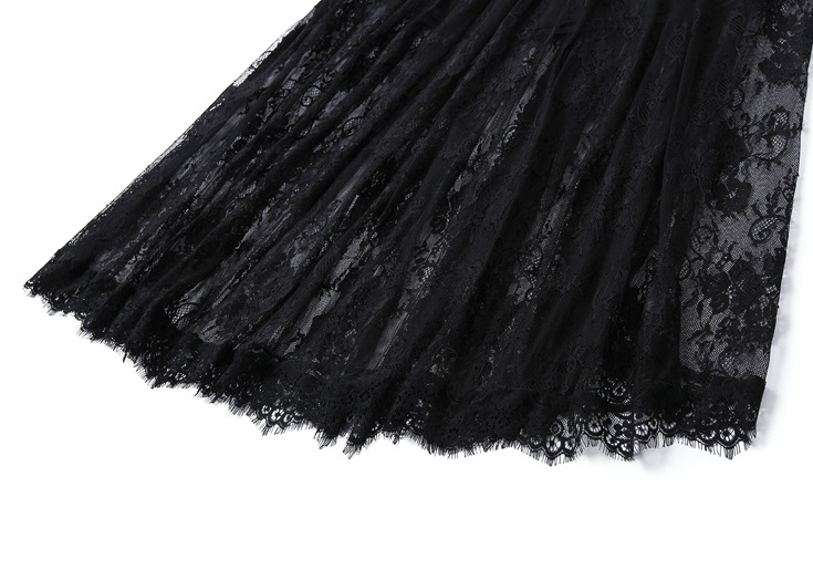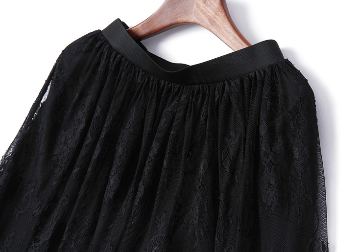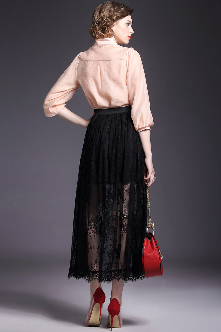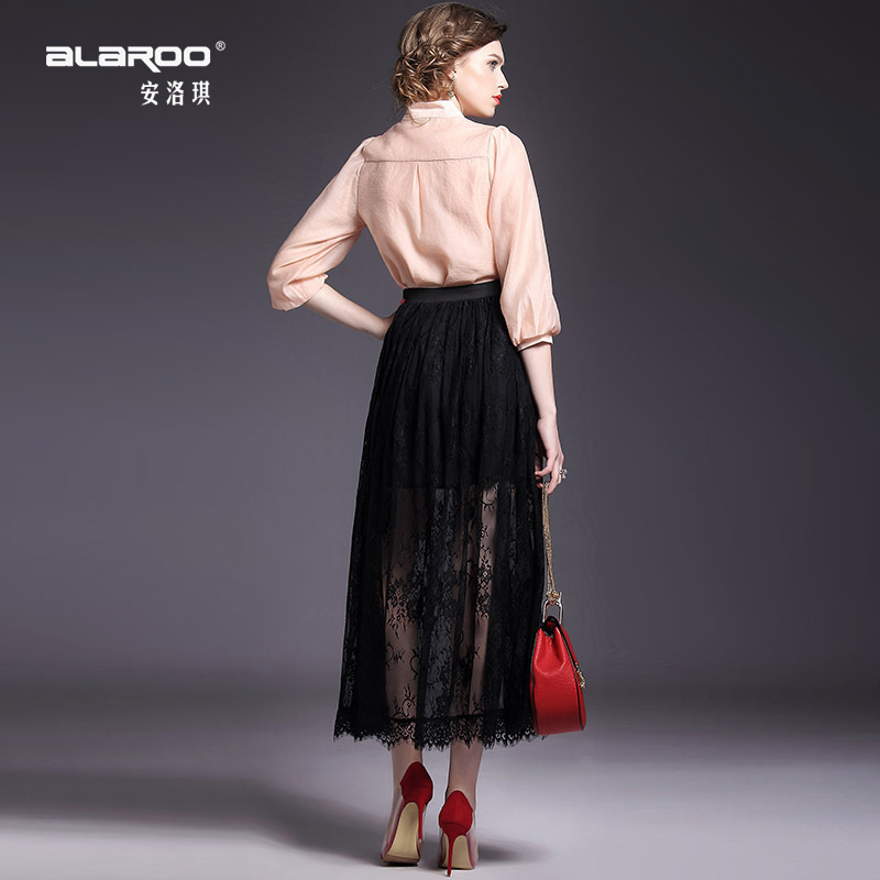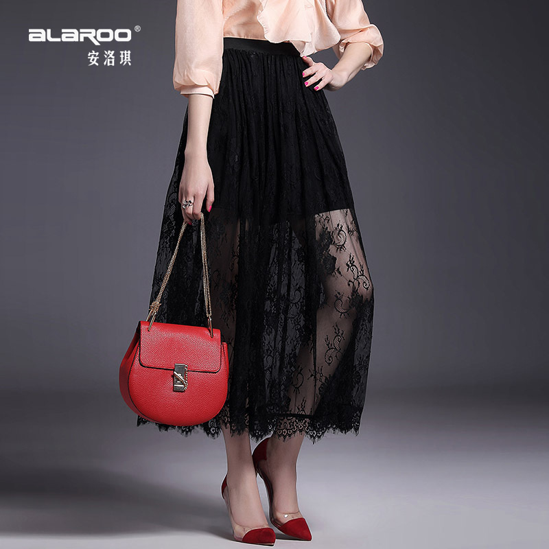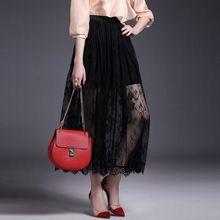 > 2015夏季新款女装 欧美大牌高腰弹力修身纯色蕾丝波浪边半裙长裙