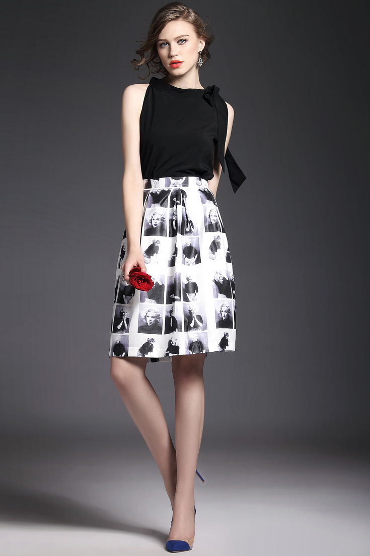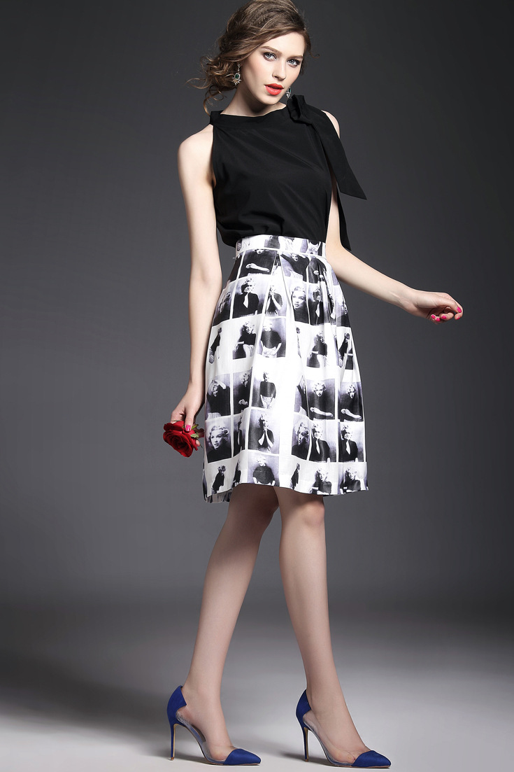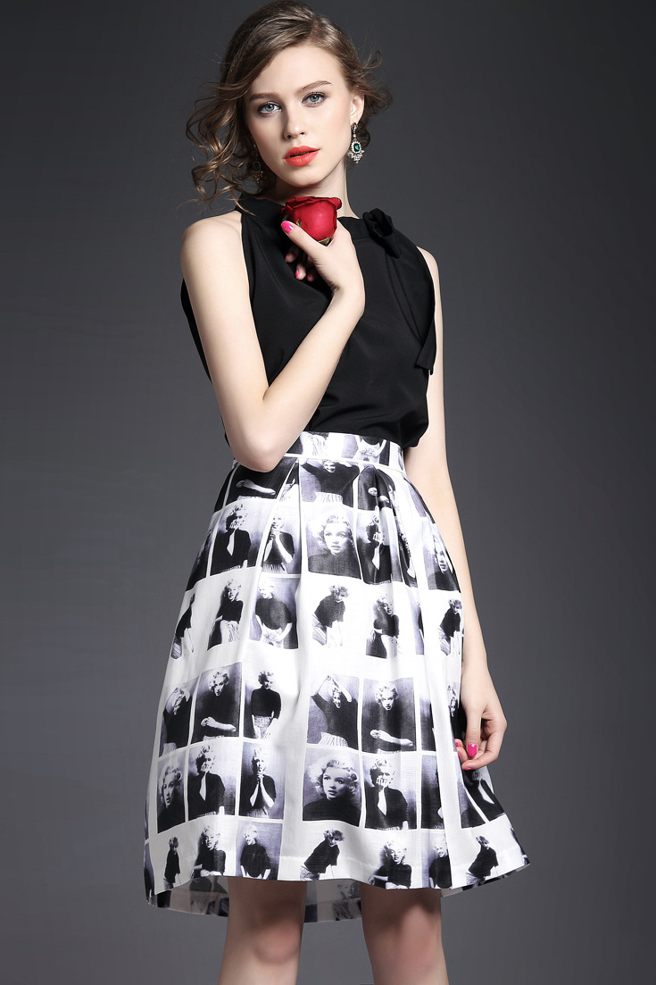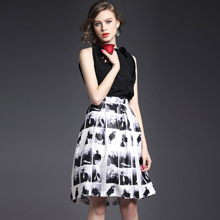 > 2015夏季新款女装 欧美大牌单件系带无袖上衣+人物印花半裙套装
