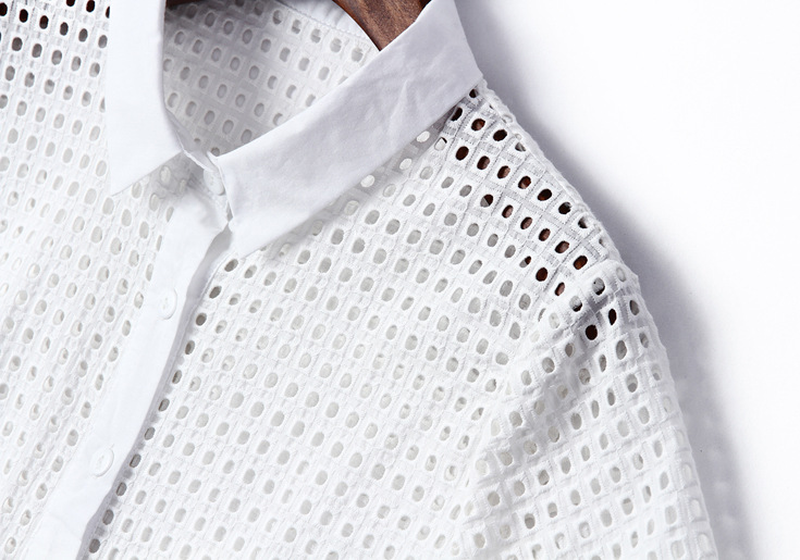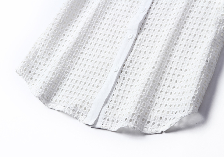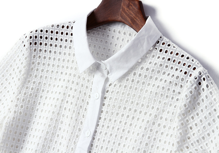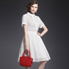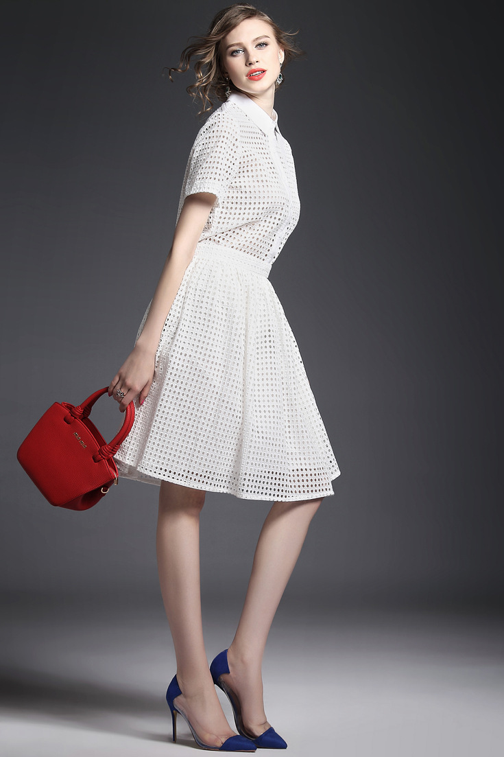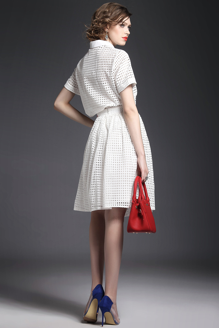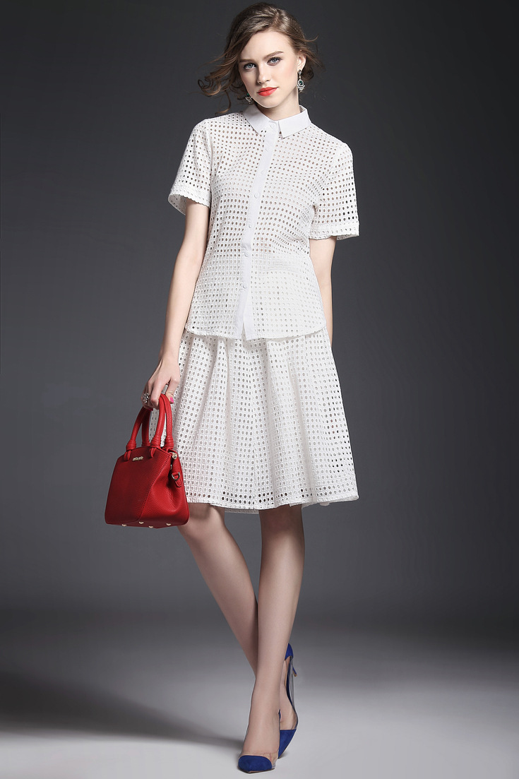 > 2015夏季女装新款 欧美大牌翻领短袖镂空纯色衬衣+大摆半裙套装