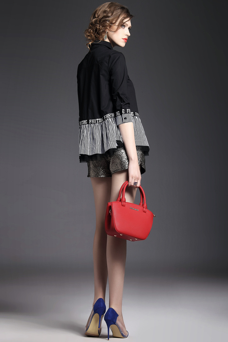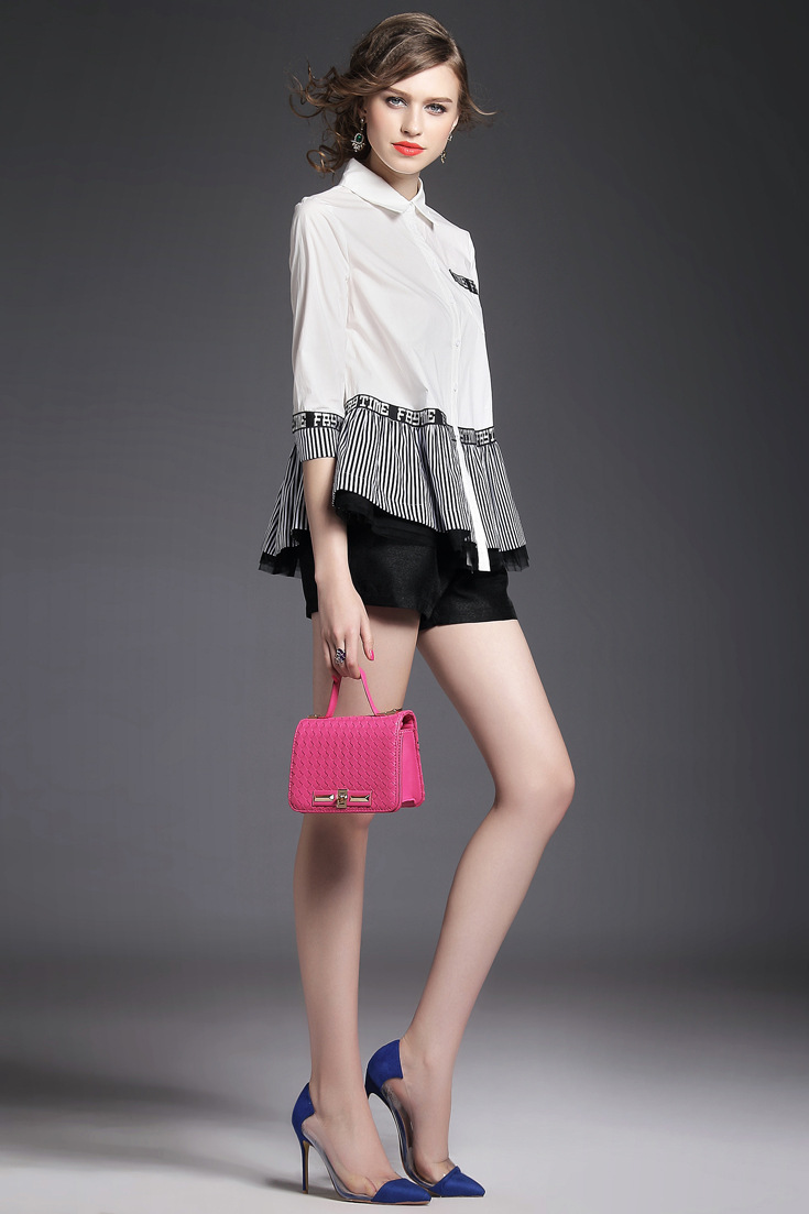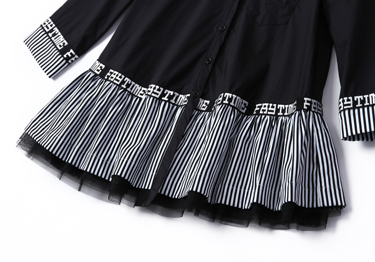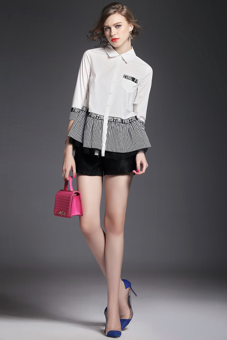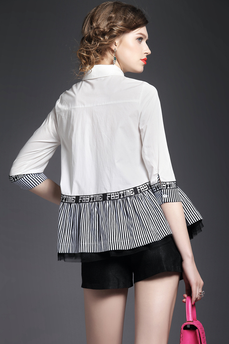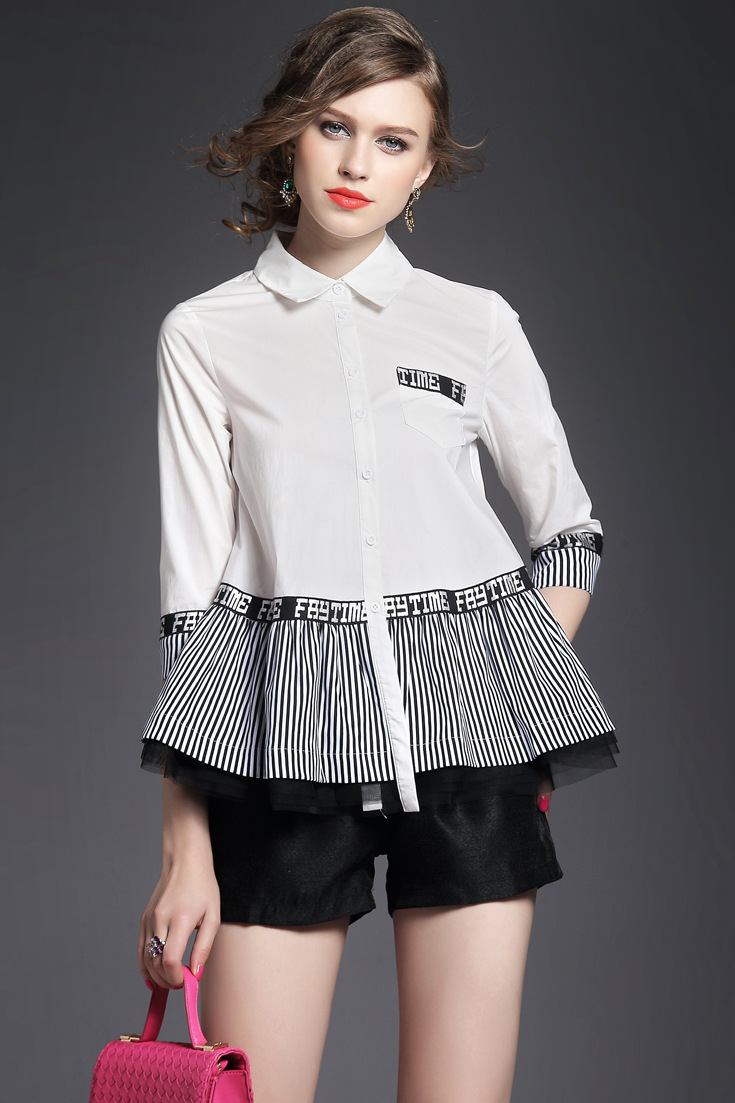 > 2015夏季翻领七分袖字母印花竖条纹网纱拼接大摆衬衣