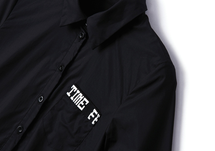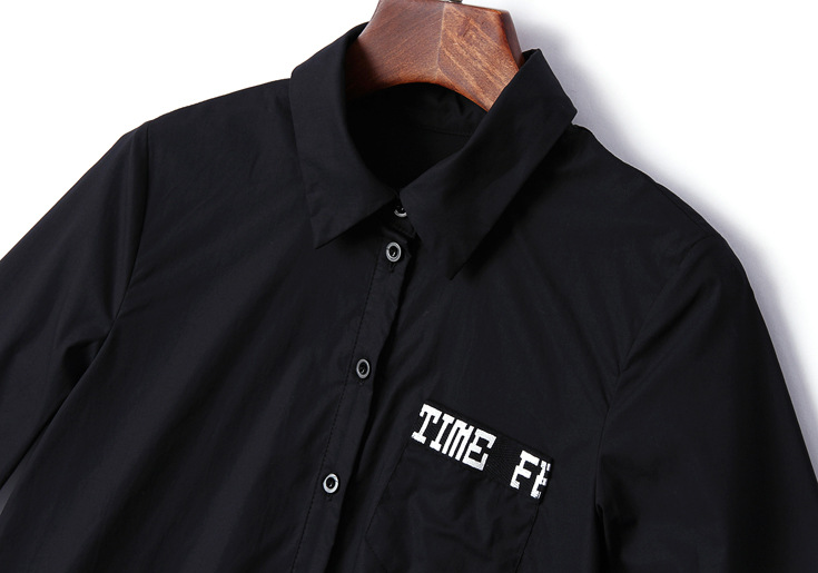 2015夏季翻领七分袖字母印花竖条纹网纱拼接大摆衬衣
