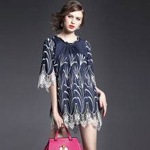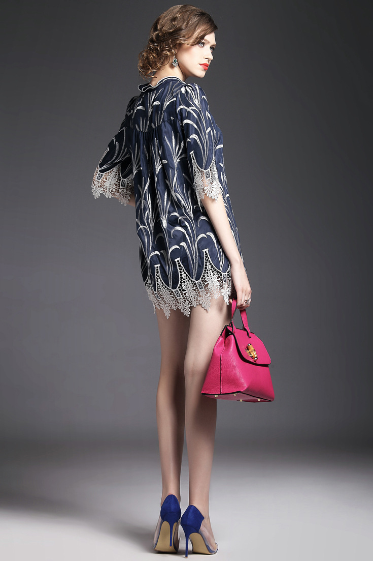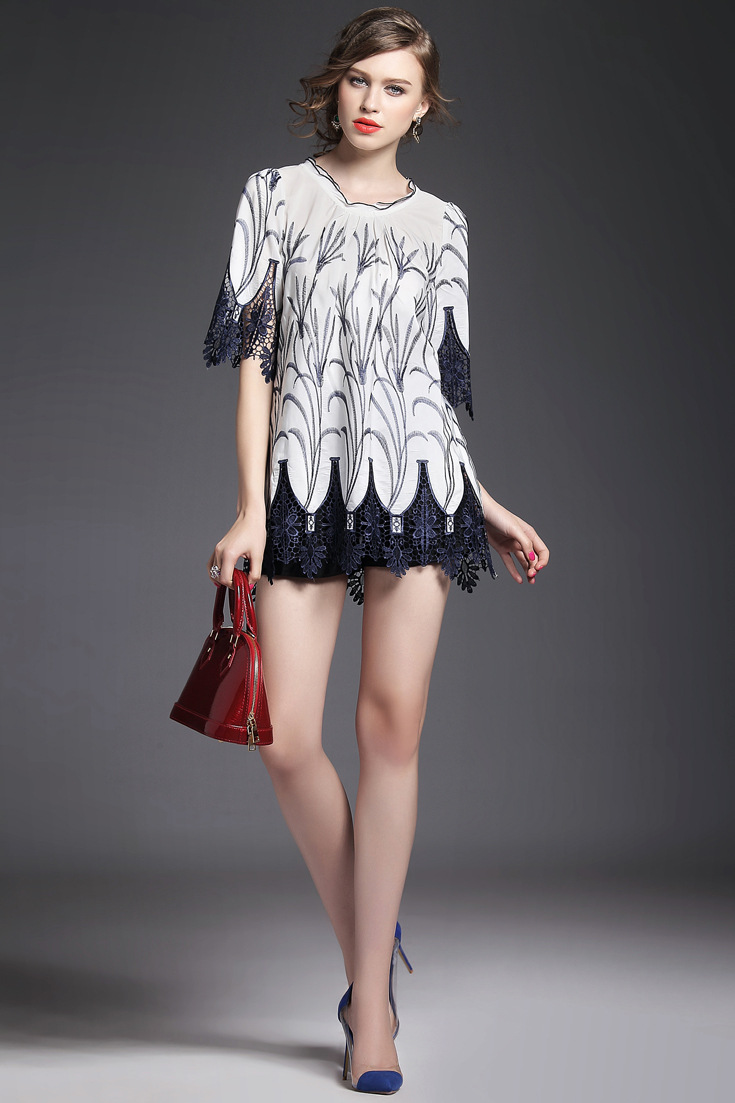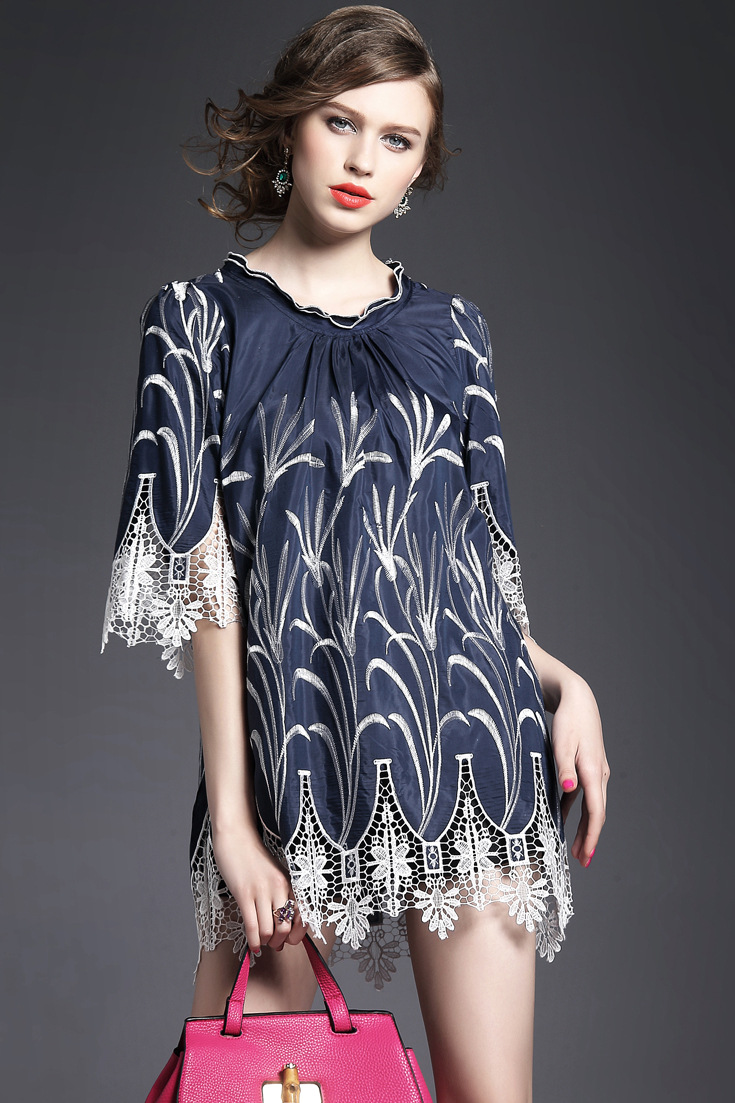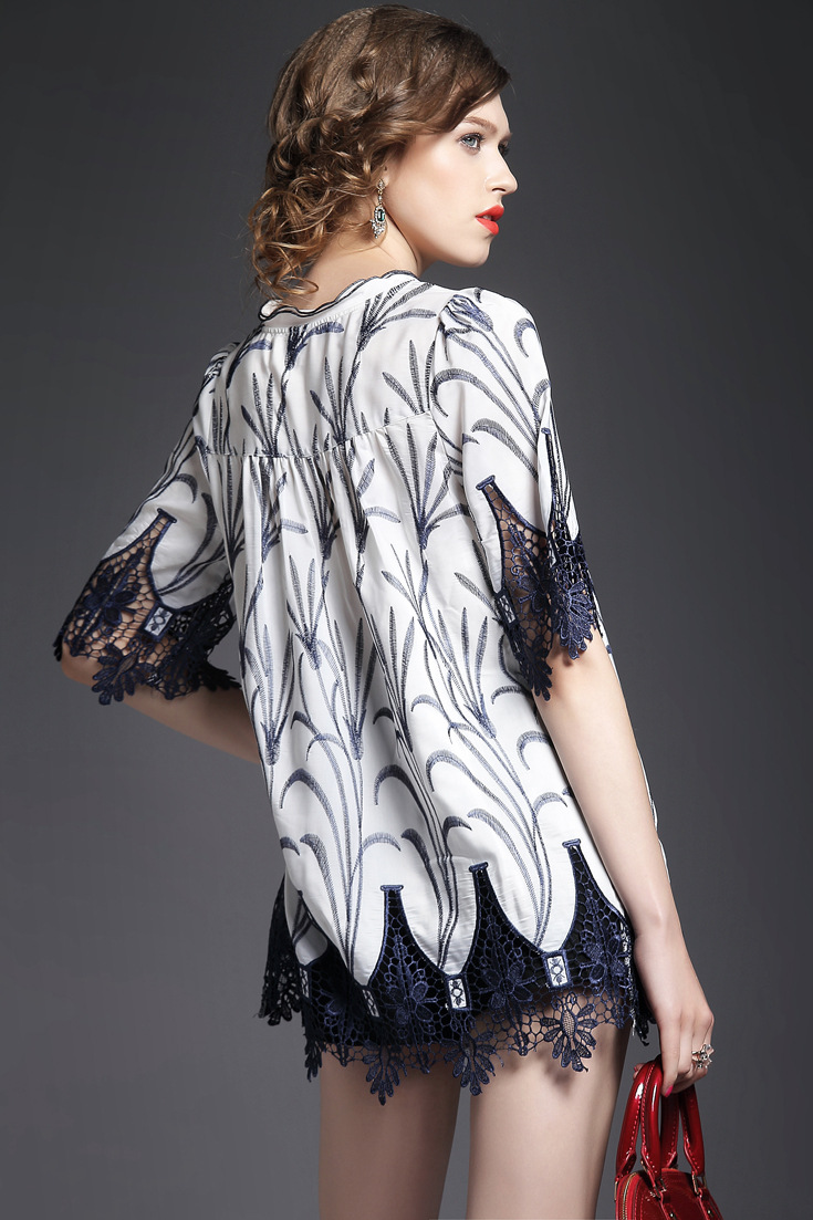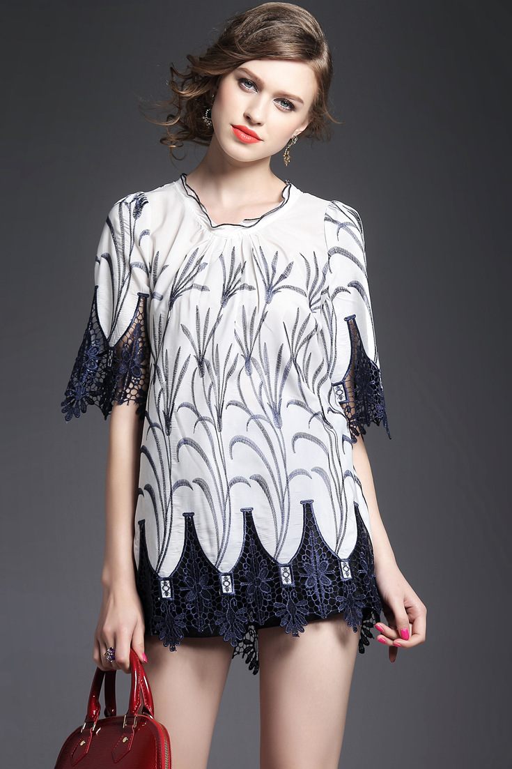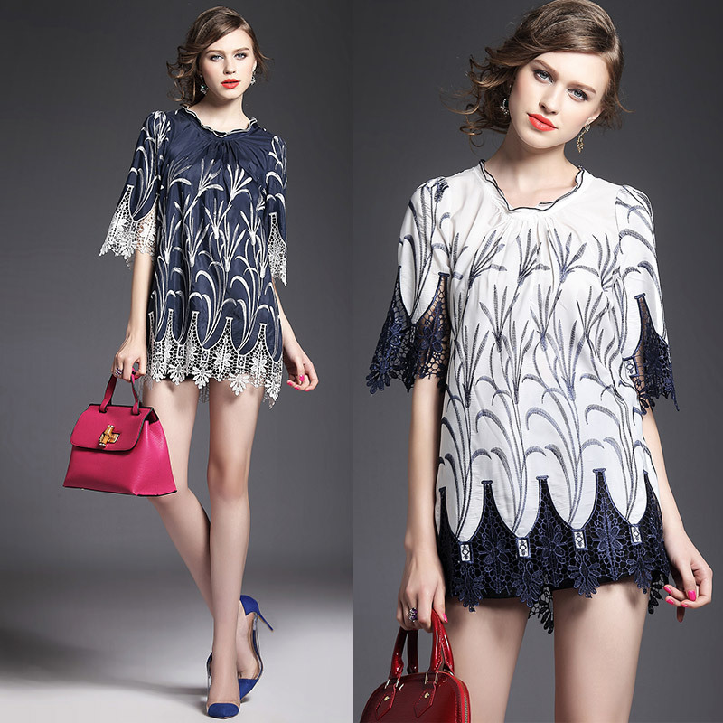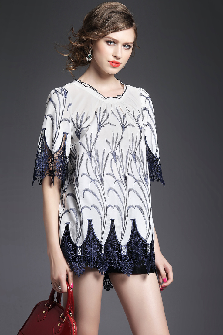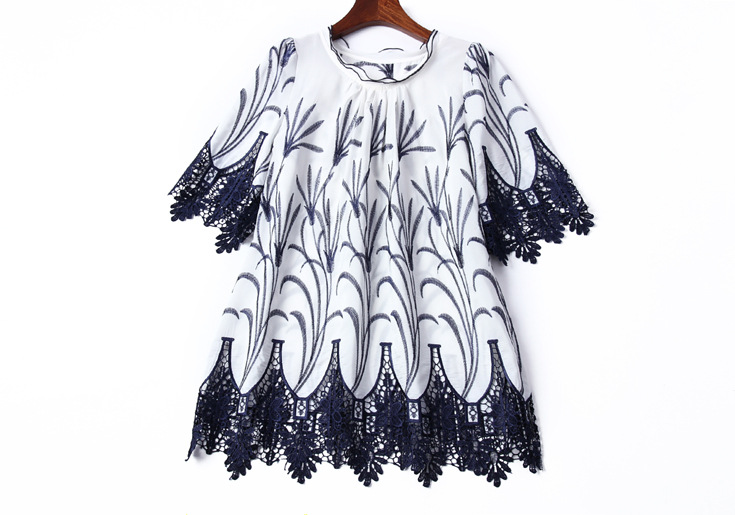 > 2015夏季女装新款 木耳边领重工水溶绣花镂空拼接波浪边套头女T恤
