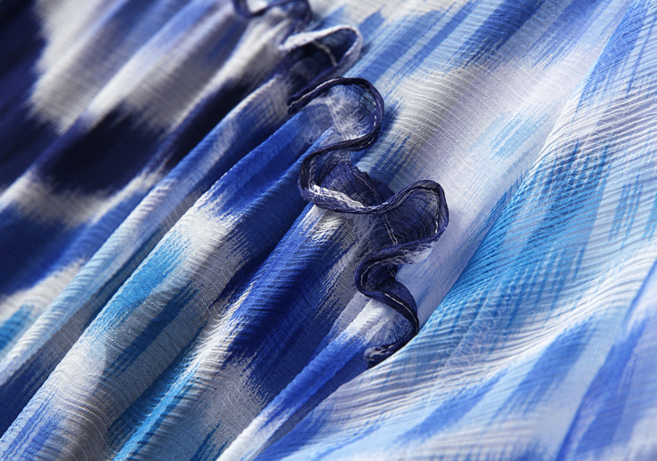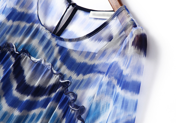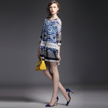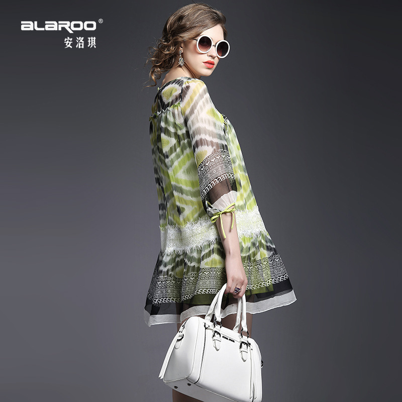 2015春夏新款欧美风印花高档桑蚕丝七分袖A字裙真丝连衣裙