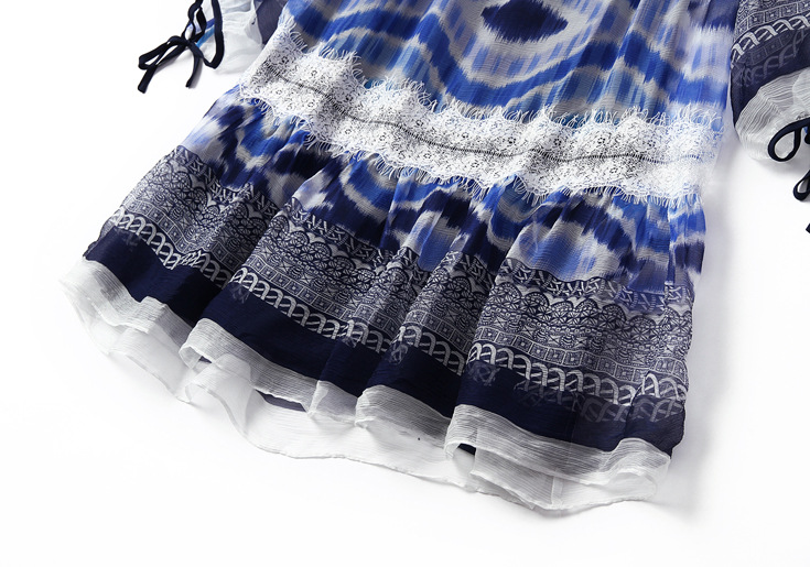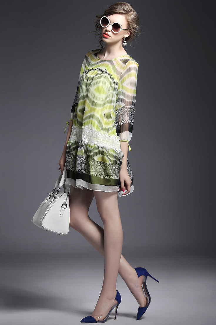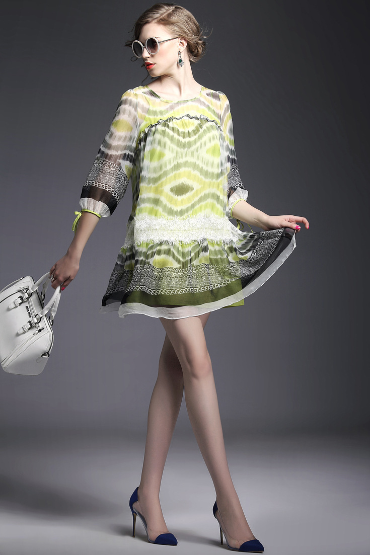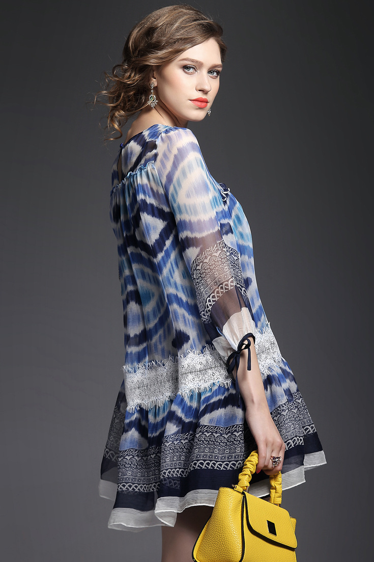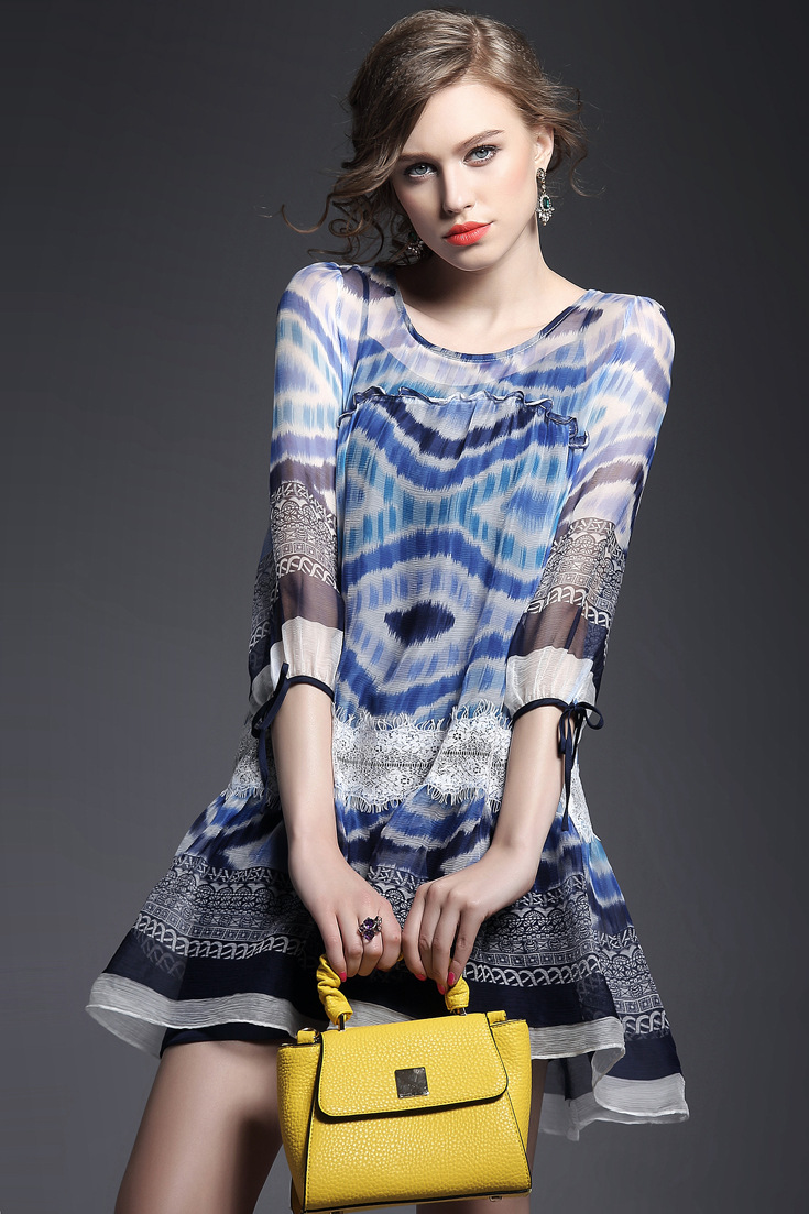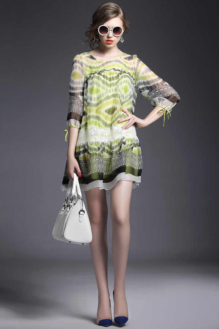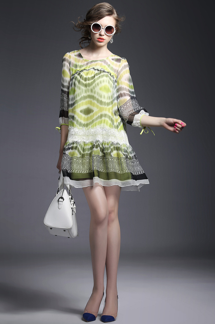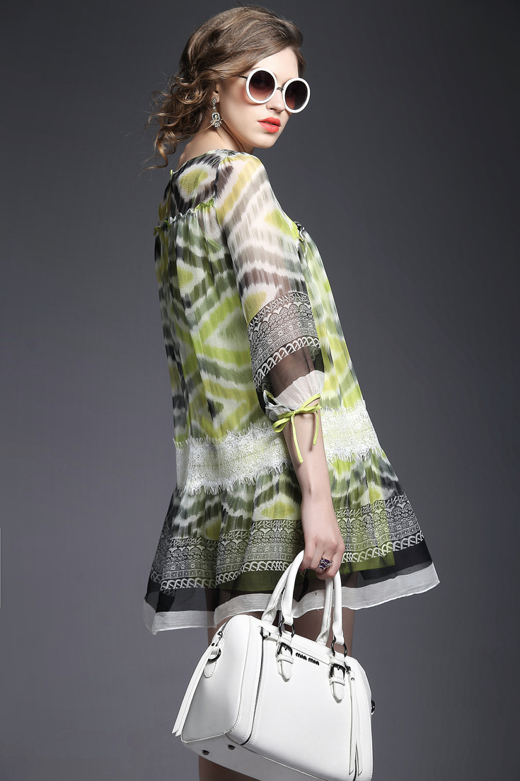 > 2015夏 欧美圆领七分袖蕾丝拼接真丝印花压褶修身a字裙送打底吊带