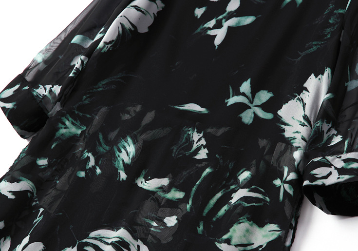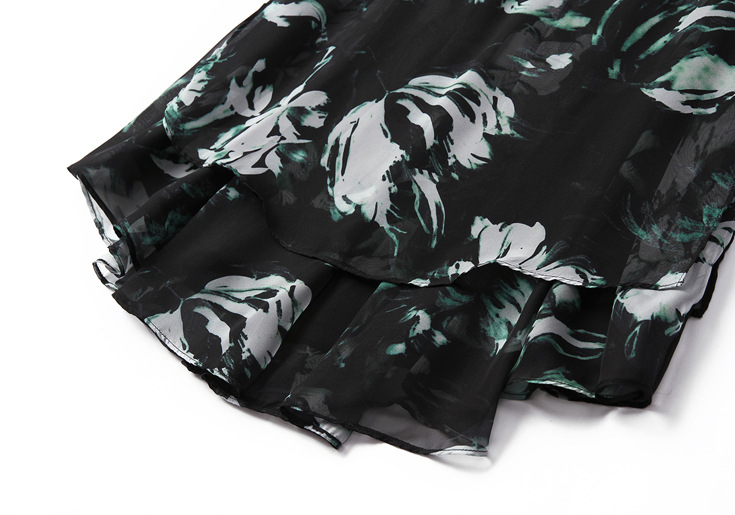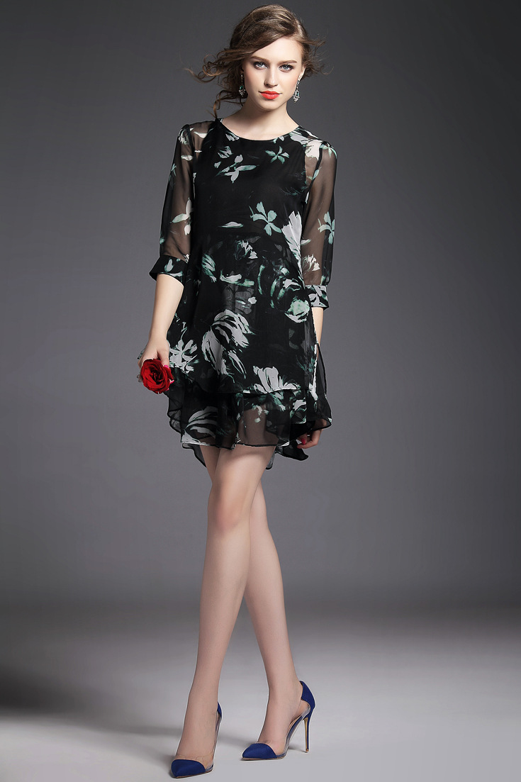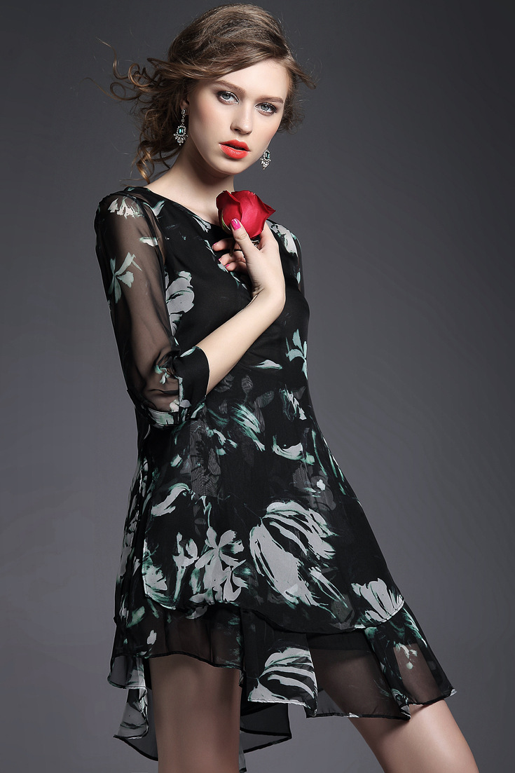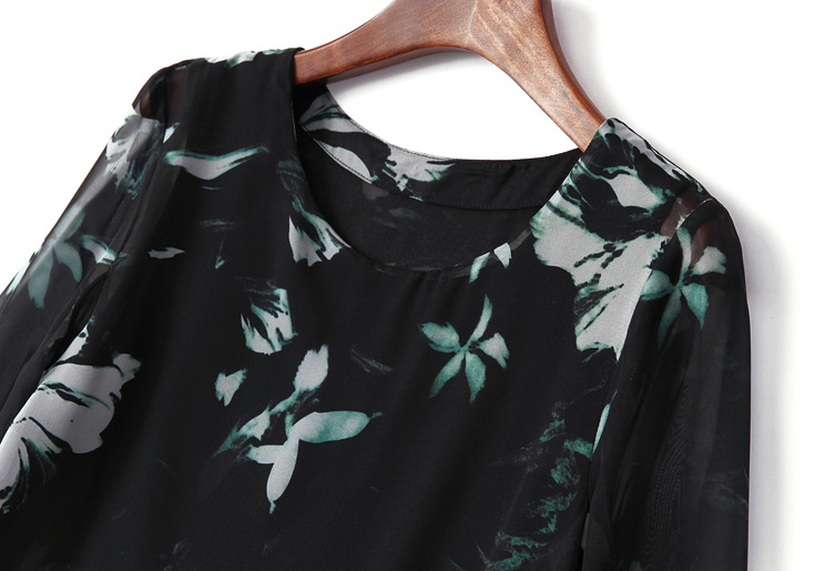 2015春夏新款欧美风印花高档桑蚕丝七分袖A字裙真丝连衣裙