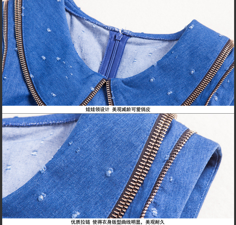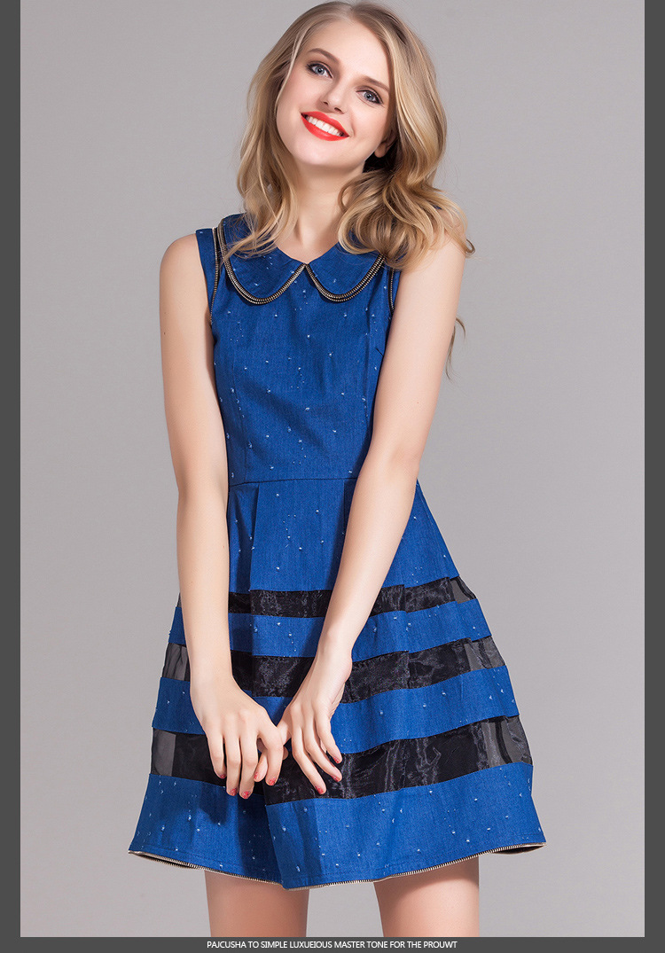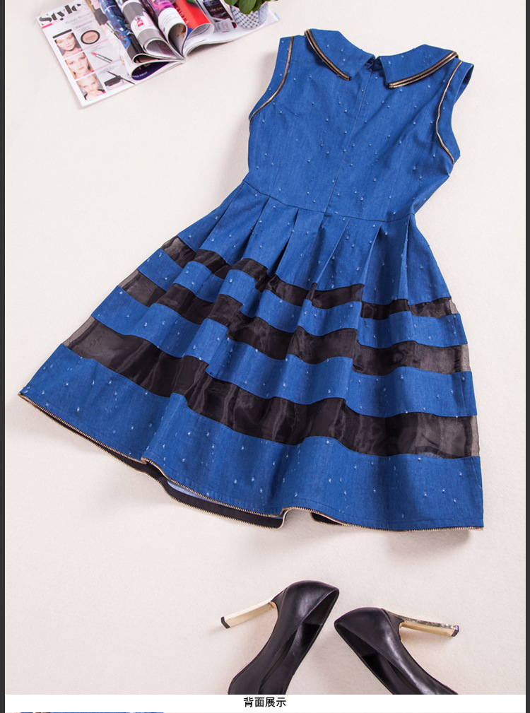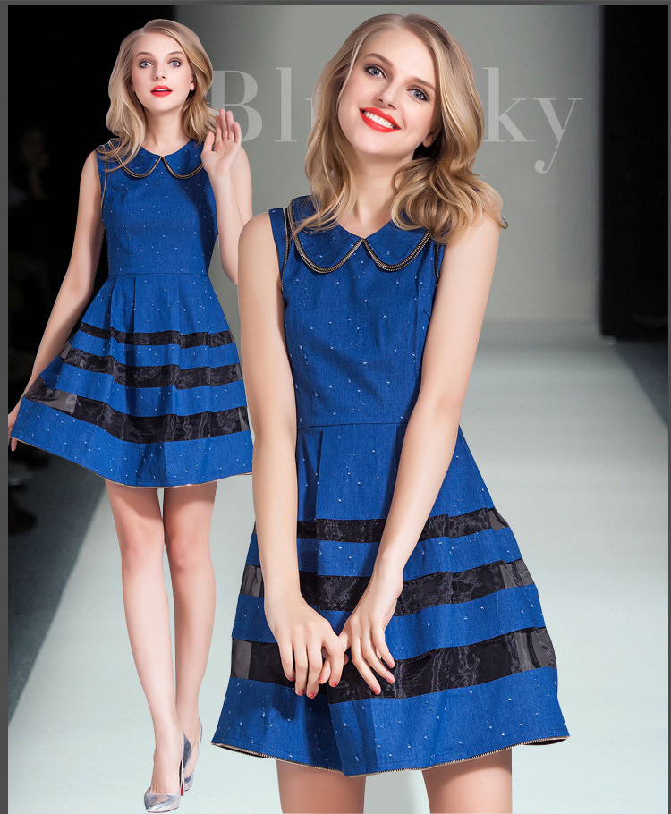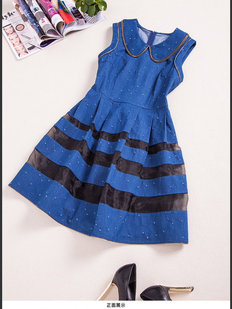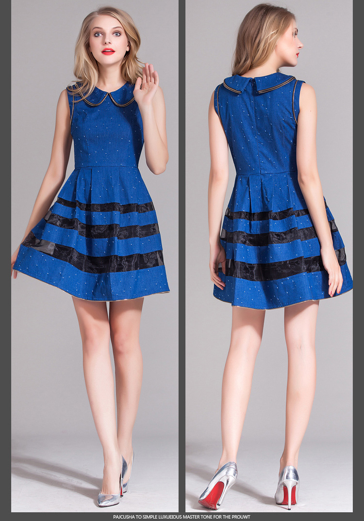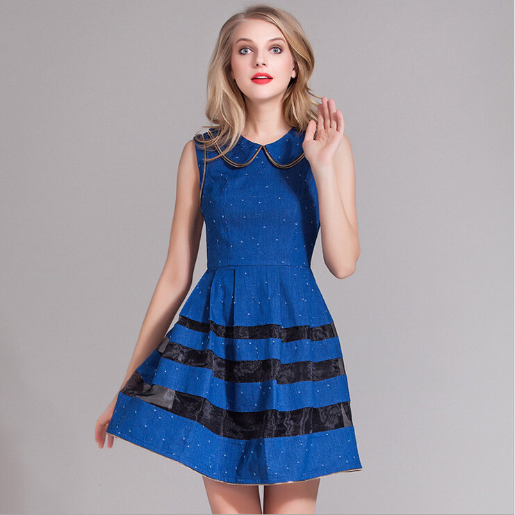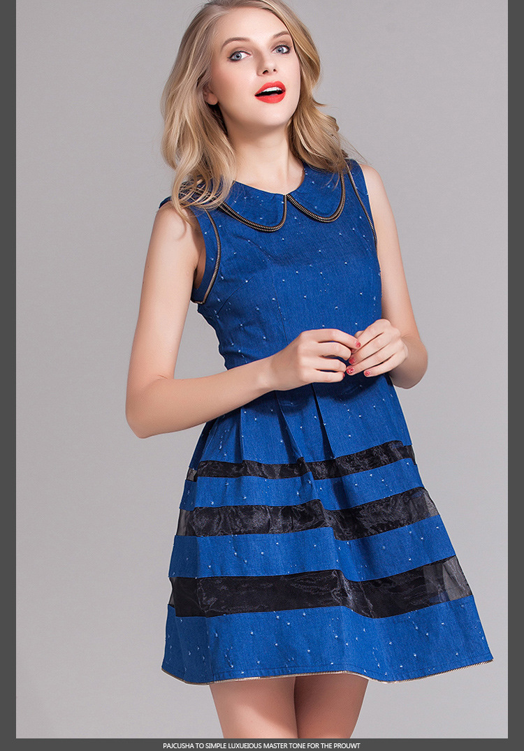 > 2015春装新款欧美女装娃娃领牛仔修身连衣裙无袖中腰蓬蓬裙