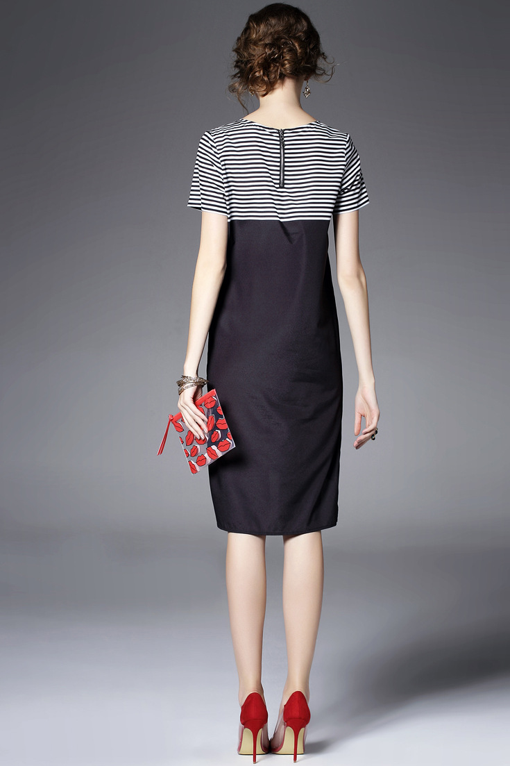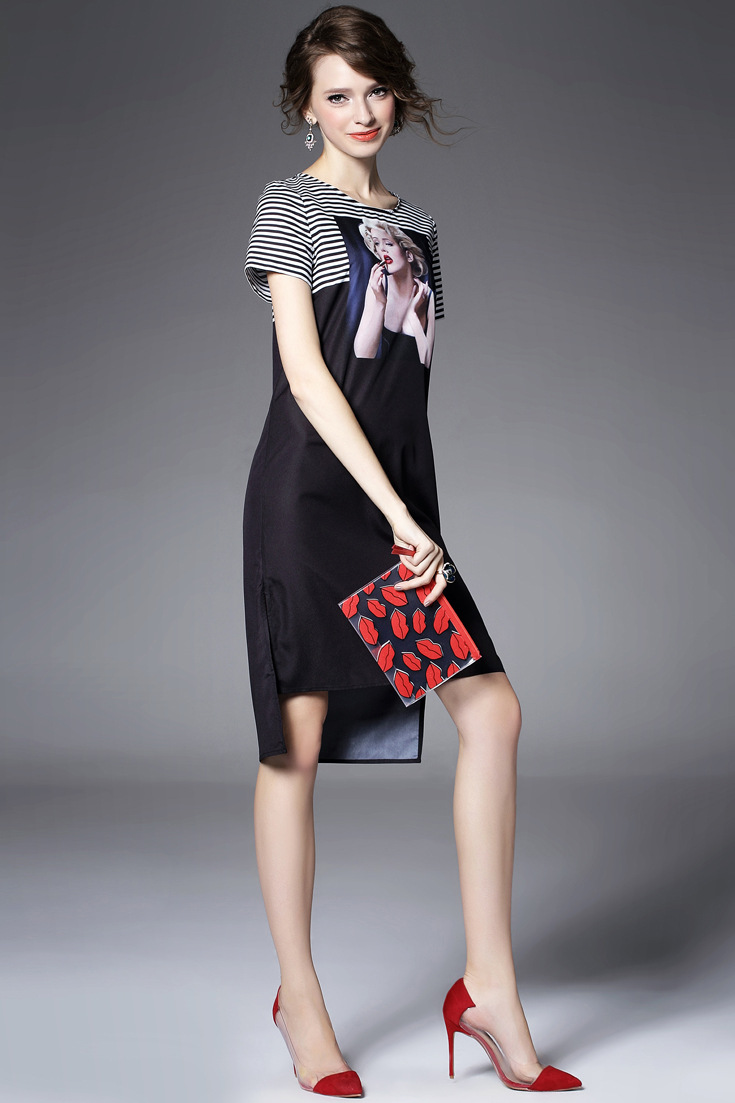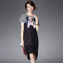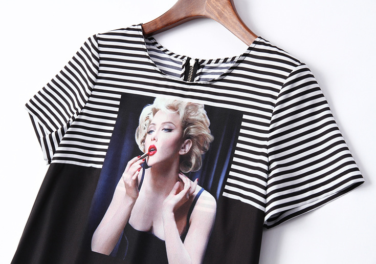2015夏季新款 欧美大牌梦露印花条纹拼接下摆不规则修身一步裙子