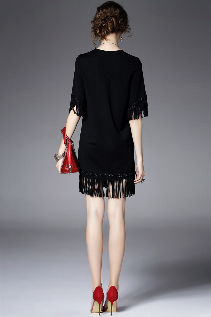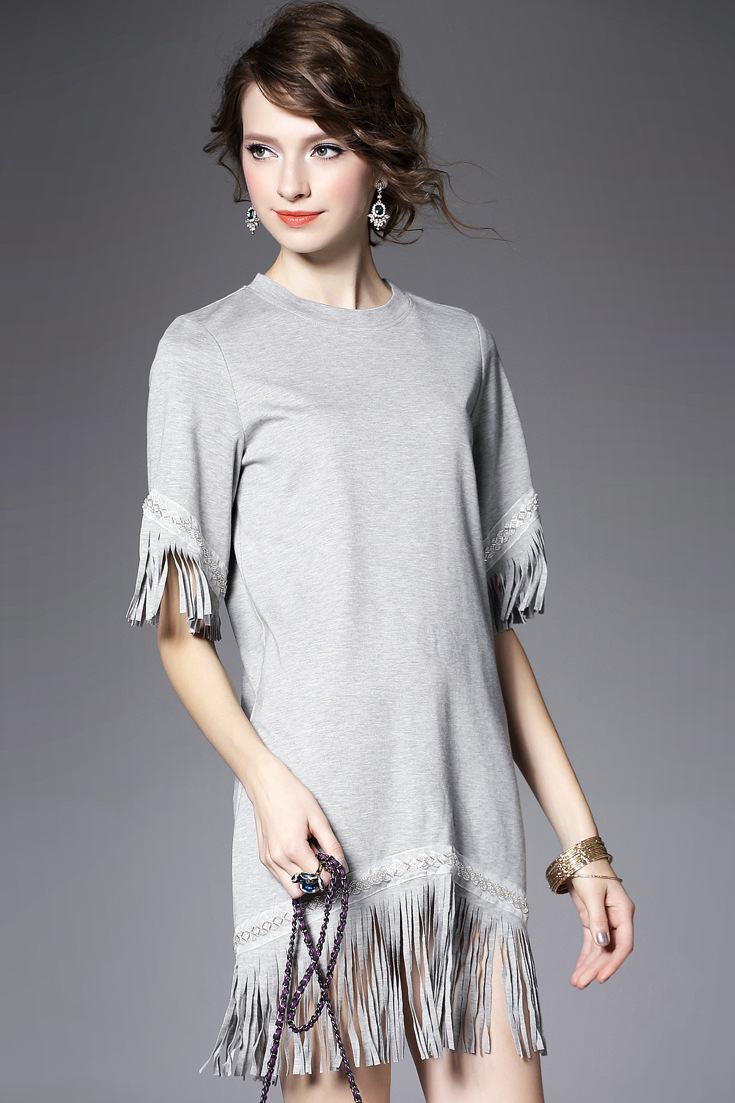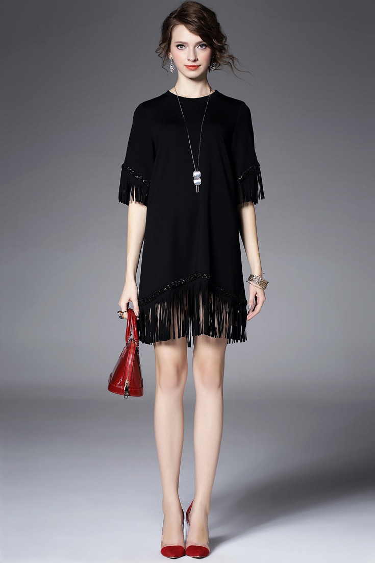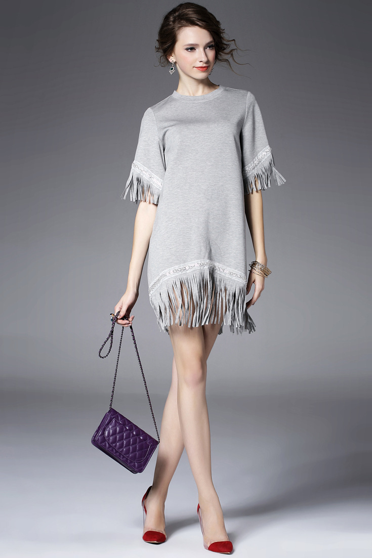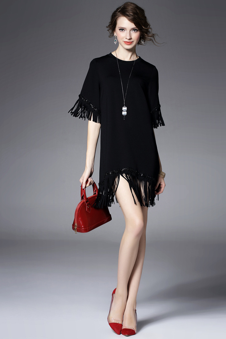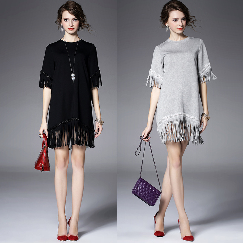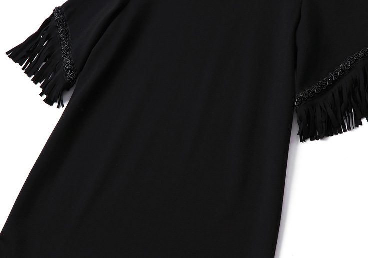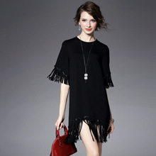 2015夏 欧美大牌圆领钉珠织带拼接流苏不规则纯色修身一步裙