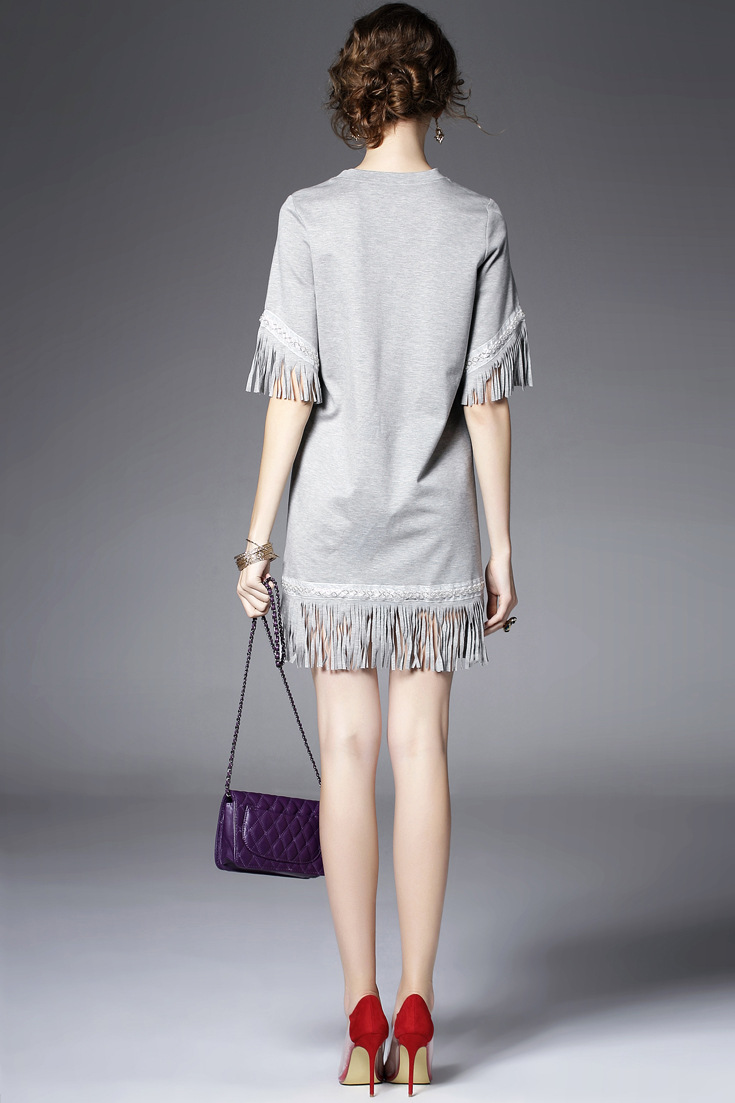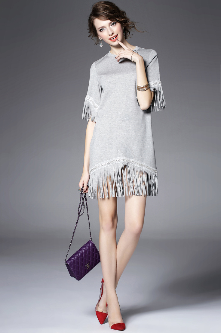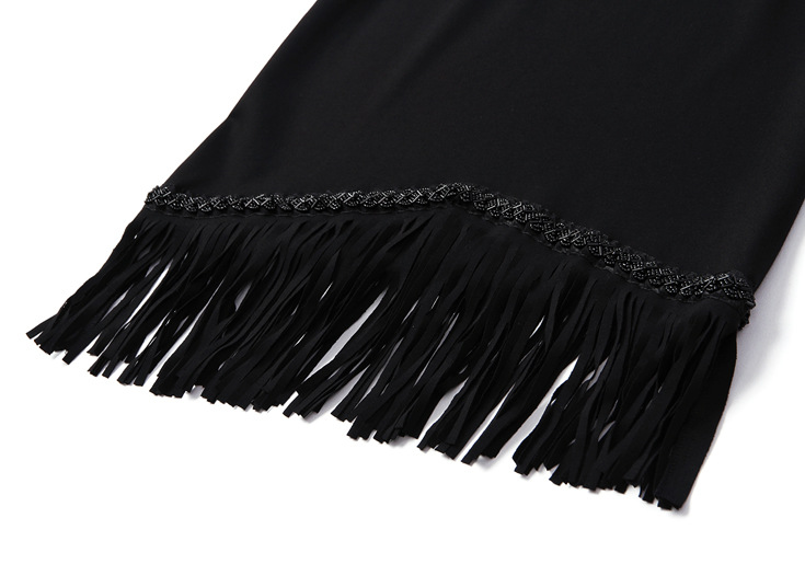 > 2015夏 欧美大牌圆领钉珠织带拼接流苏不规则纯色修身一步裙