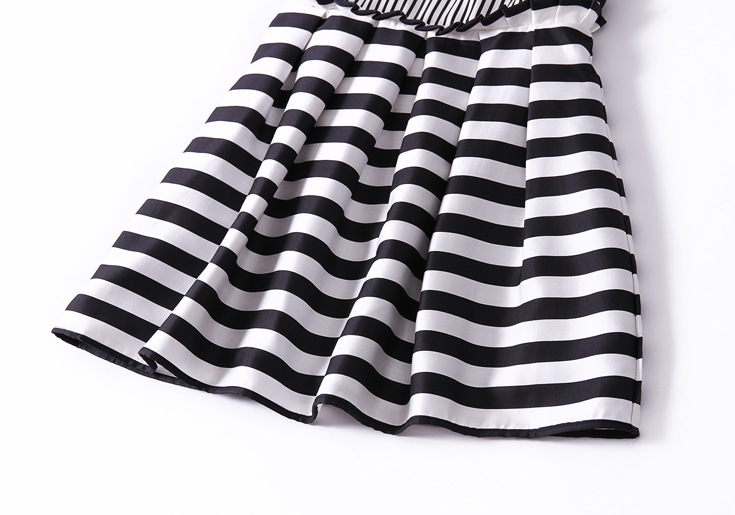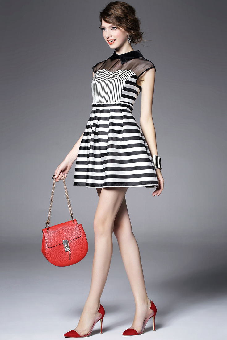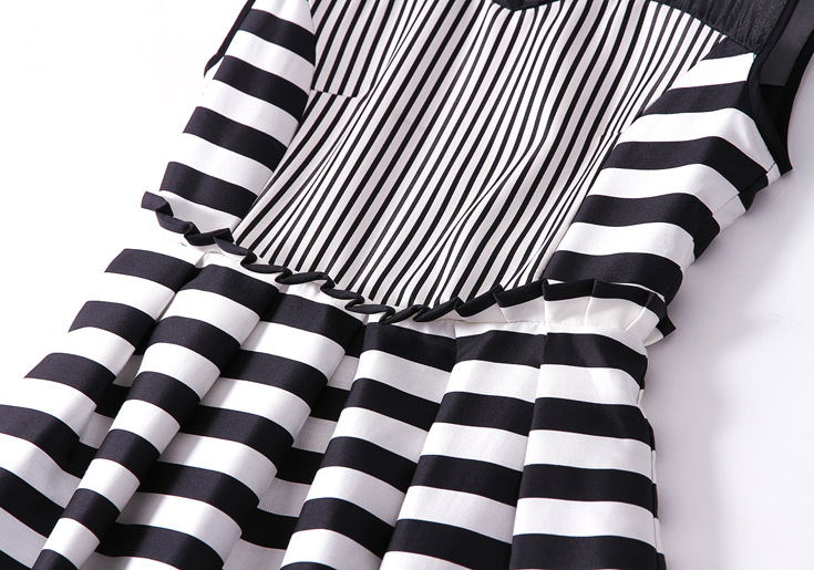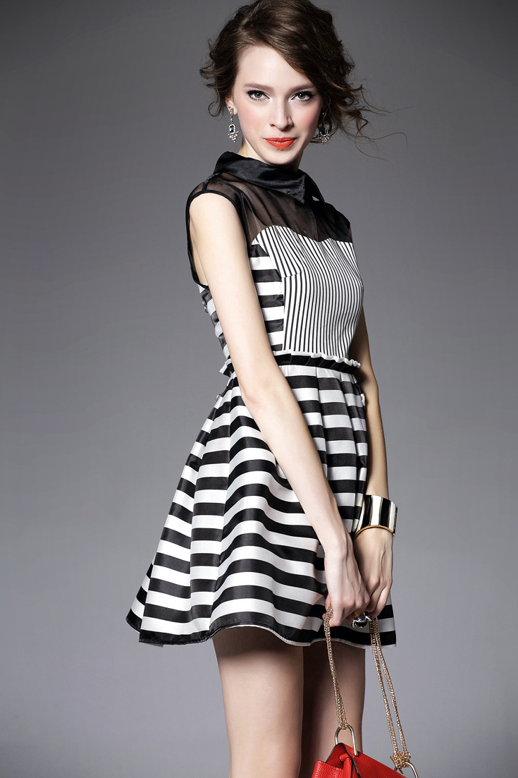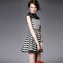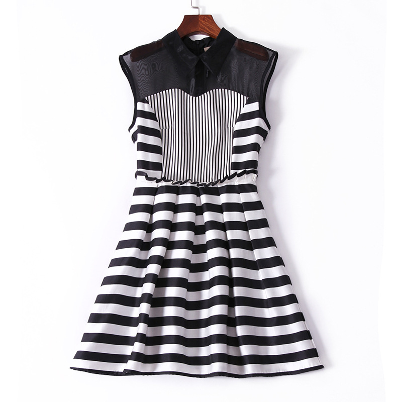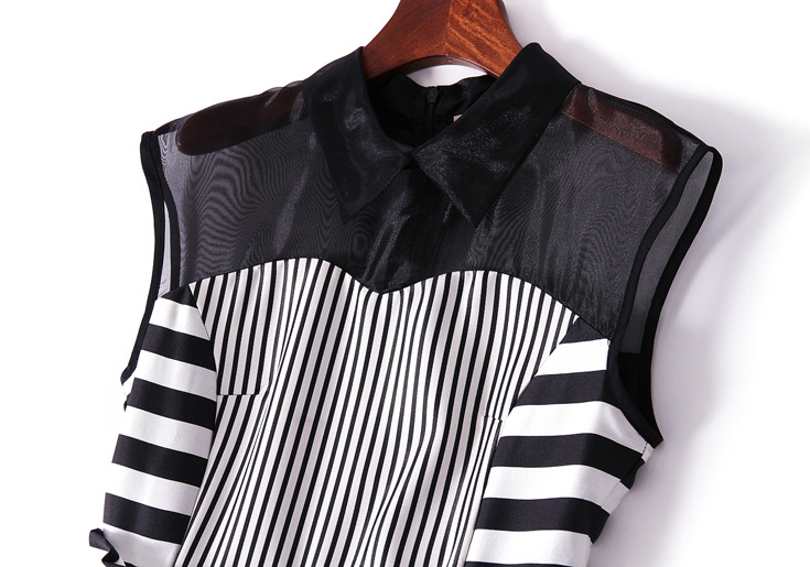 2015夏季新款 翻领欧根纱拼接黑白条纹修身a字裙