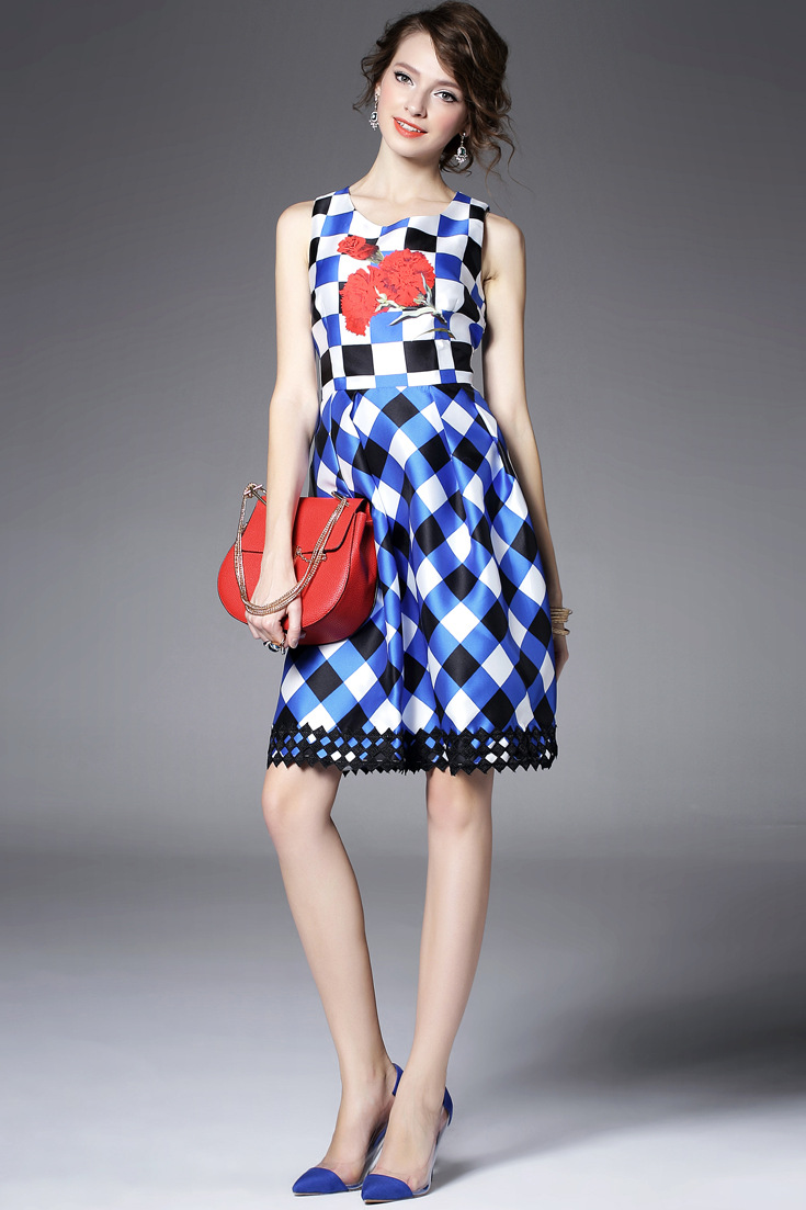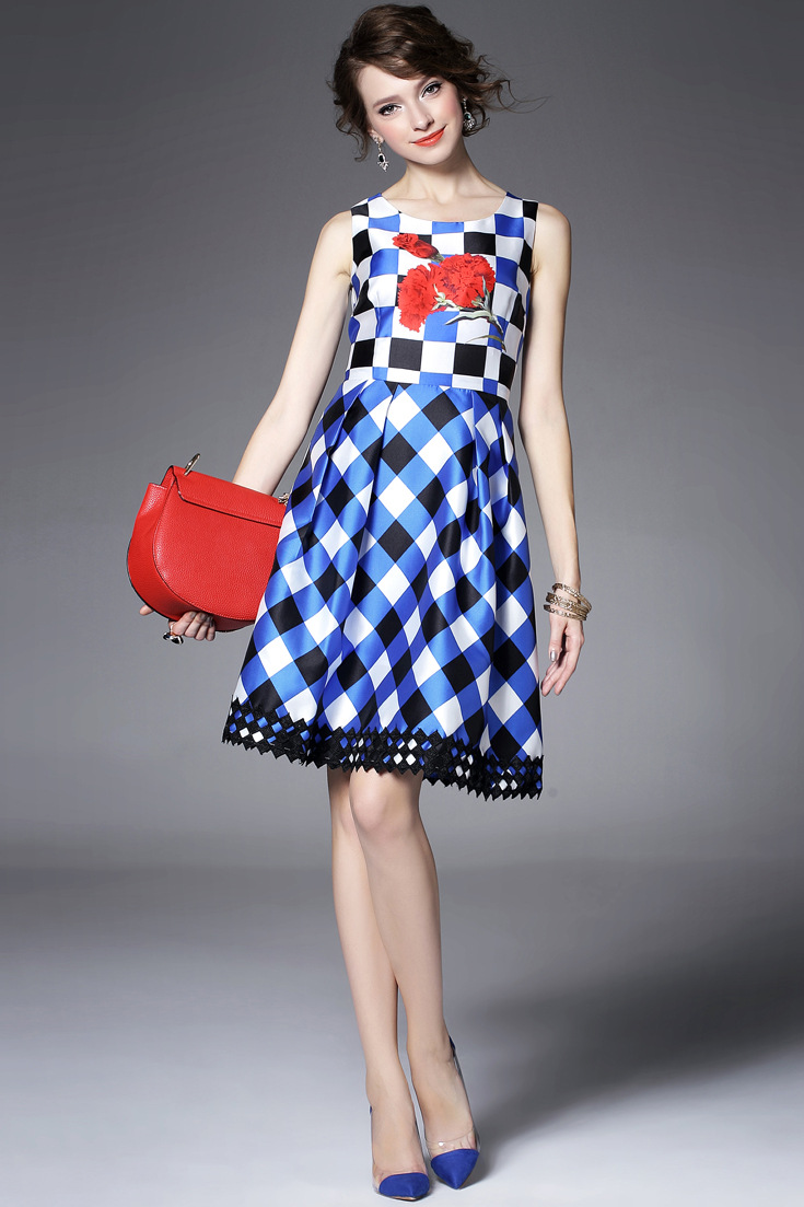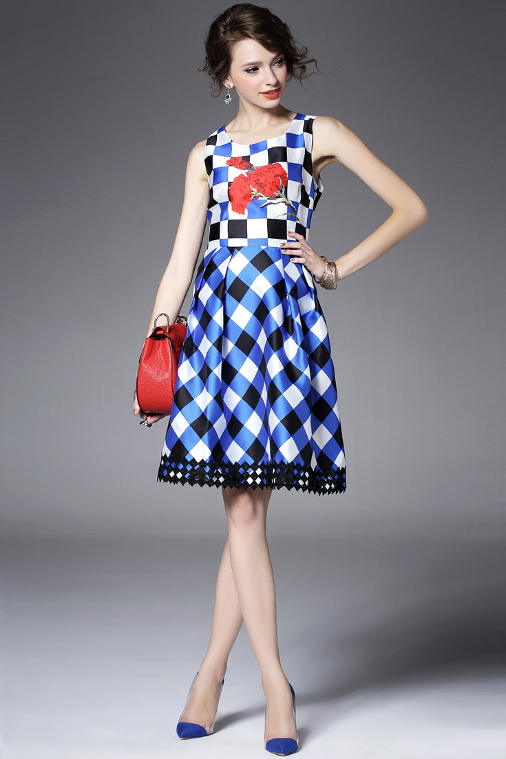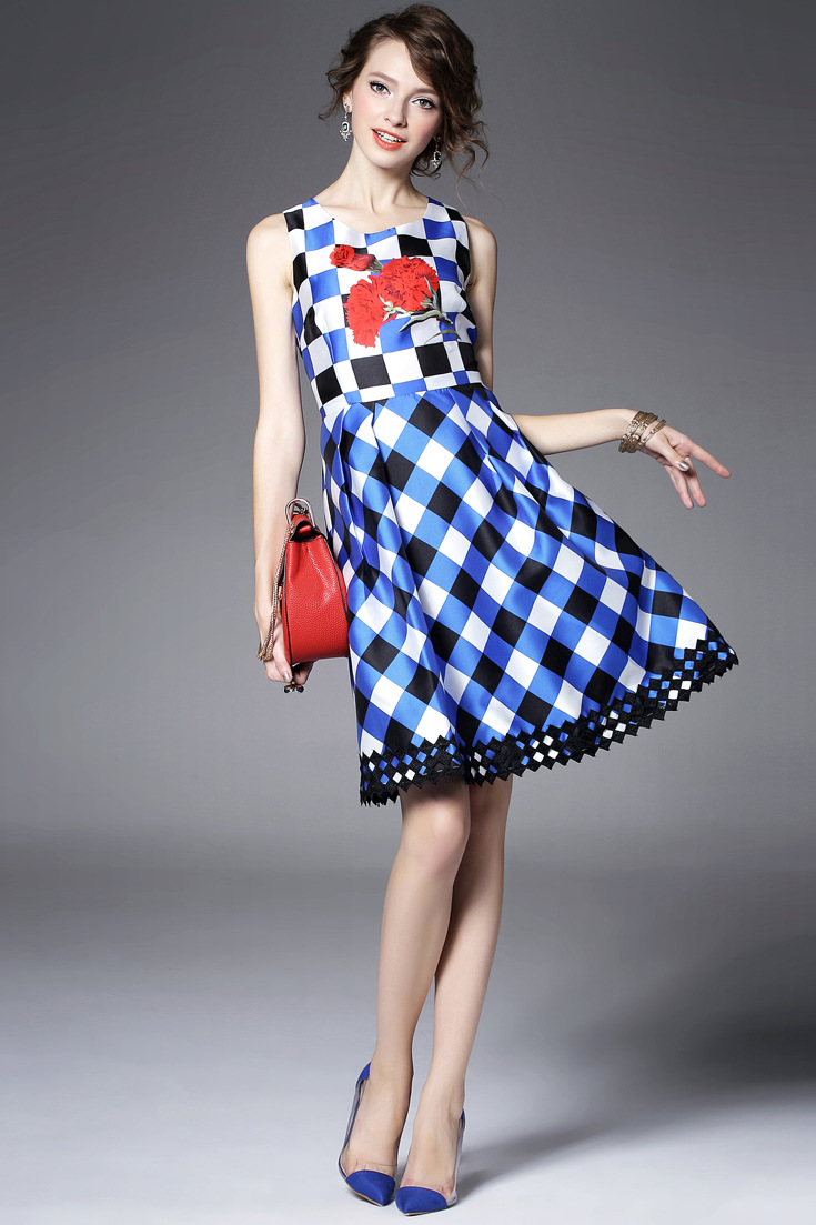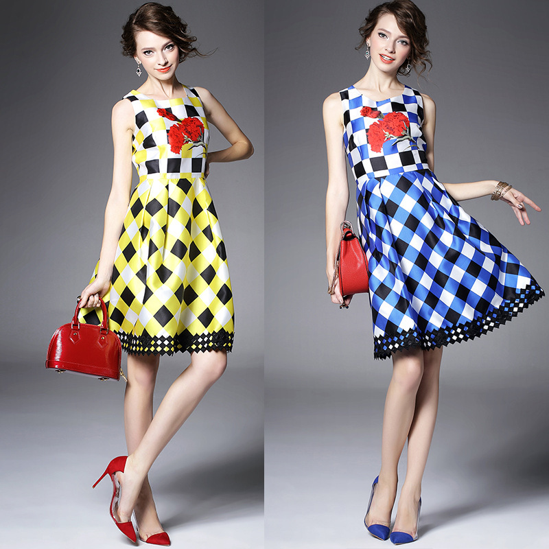 > 2015夏季新款女装 圆领无袖方格印花下摆绣花拼接修身显瘦a字裙子