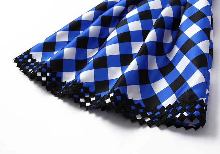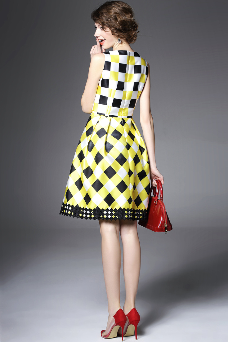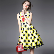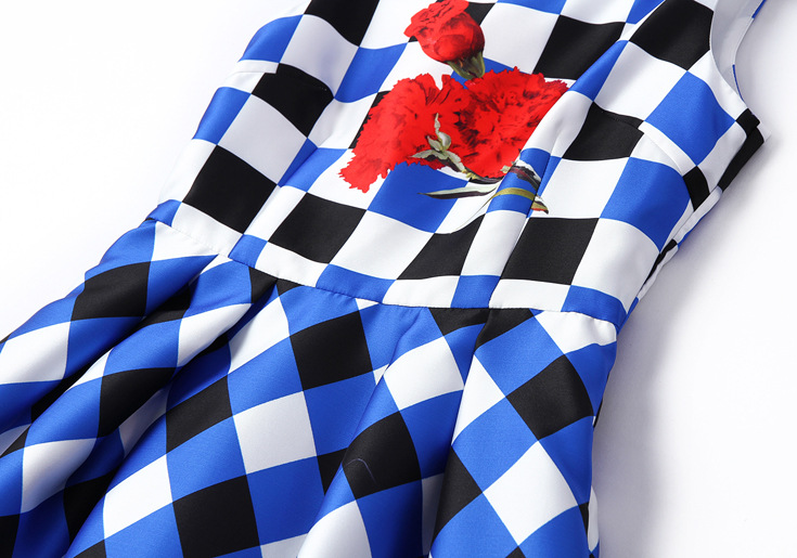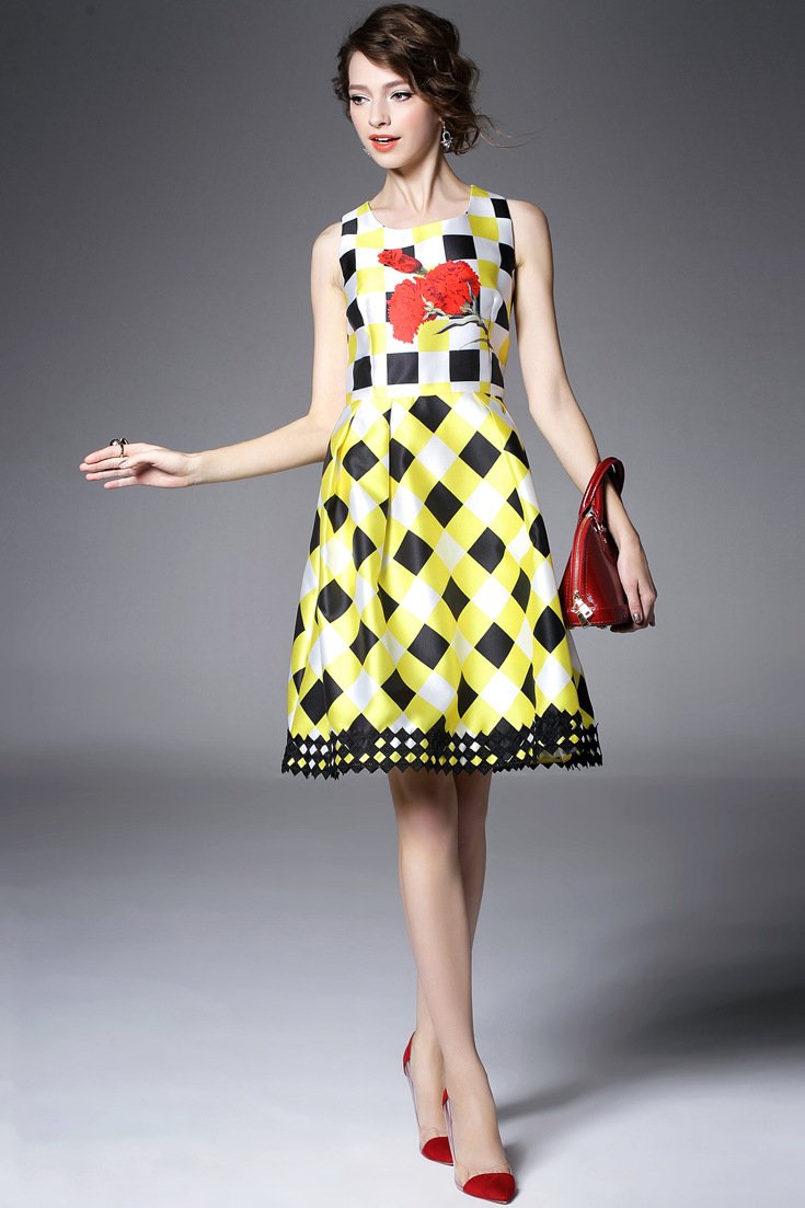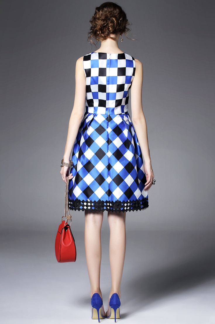 > 2015夏季新款女装 圆领无袖方格印花下摆绣花拼接修身显瘦a字裙子