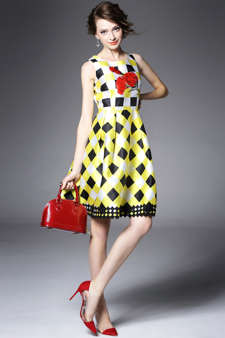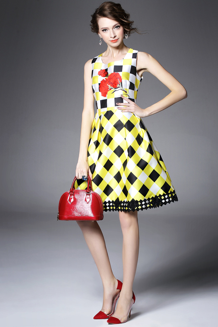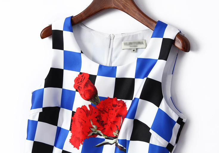 2015夏季新款女装 圆领无袖方格印花下摆绣花拼接修身显瘦a字裙子