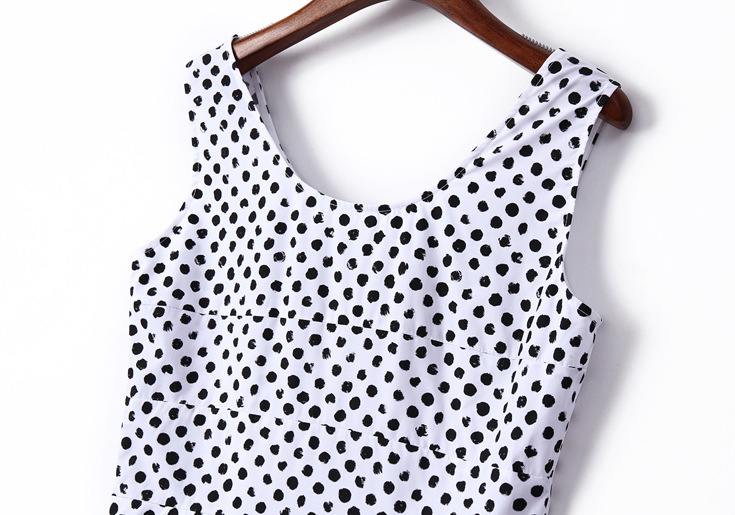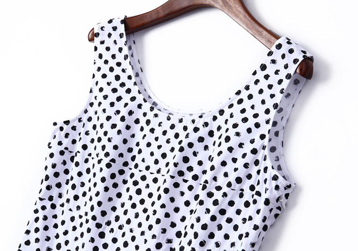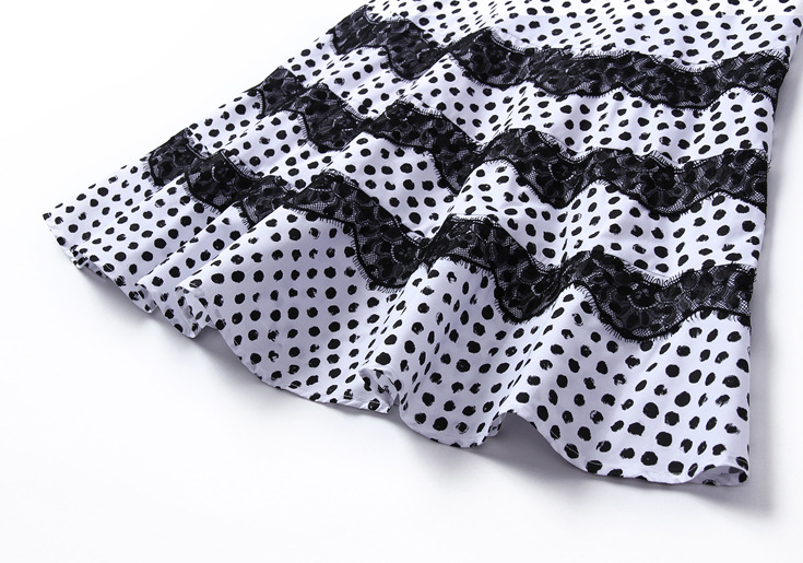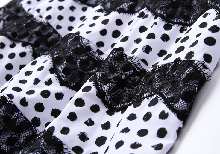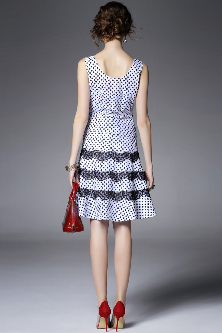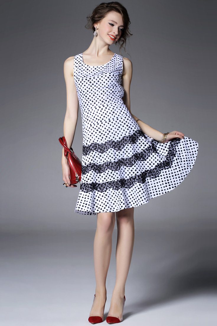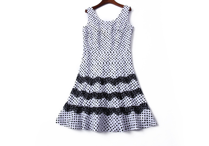 > 2015夏季欧美女装无袖圆领波点印花蕾丝拼接收腰修身A字裙