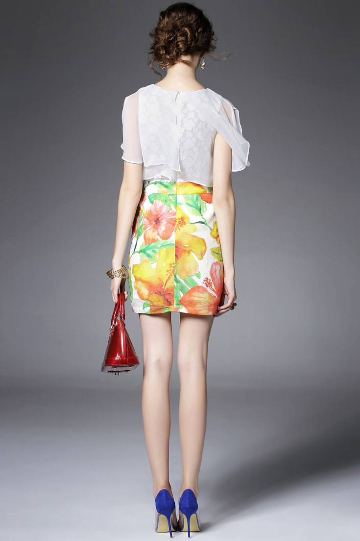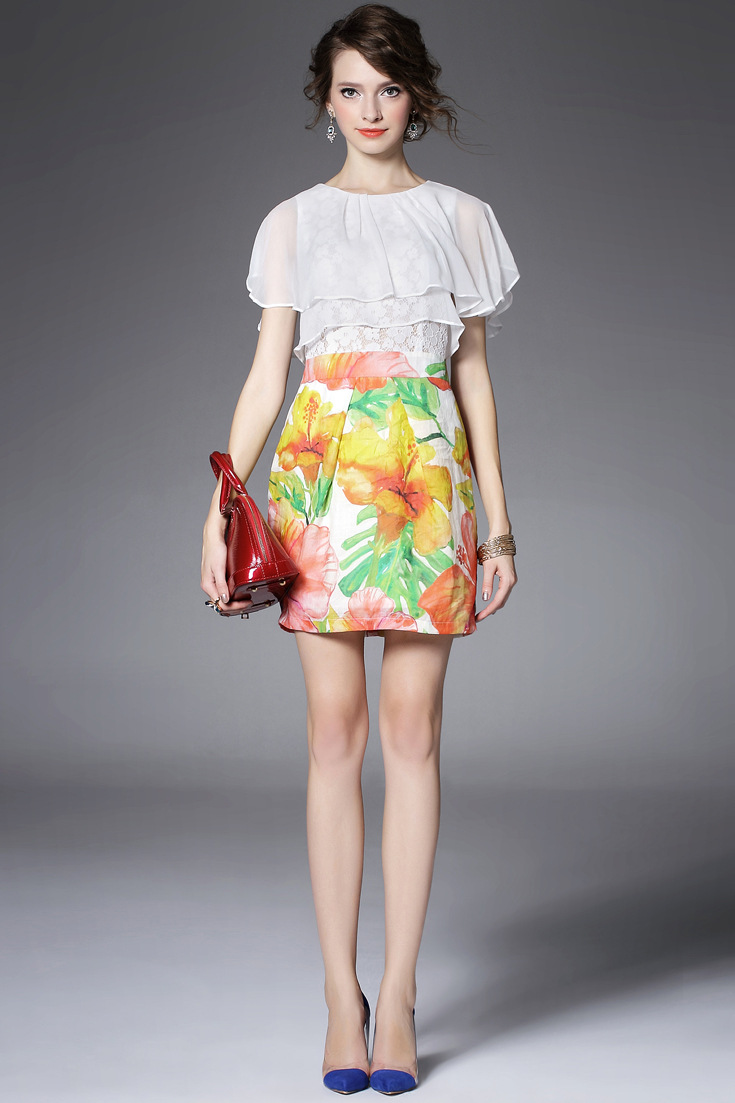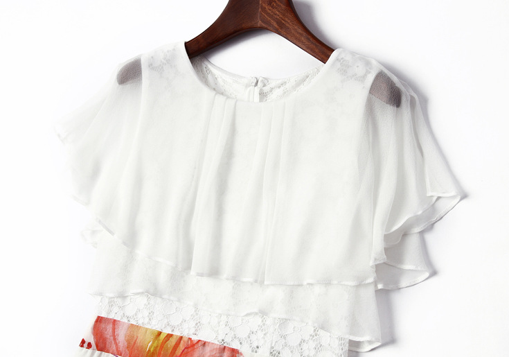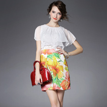 > 2015夏季女装欧洲时尚圆领短袖绣花拼接气质印花修身连衣裙