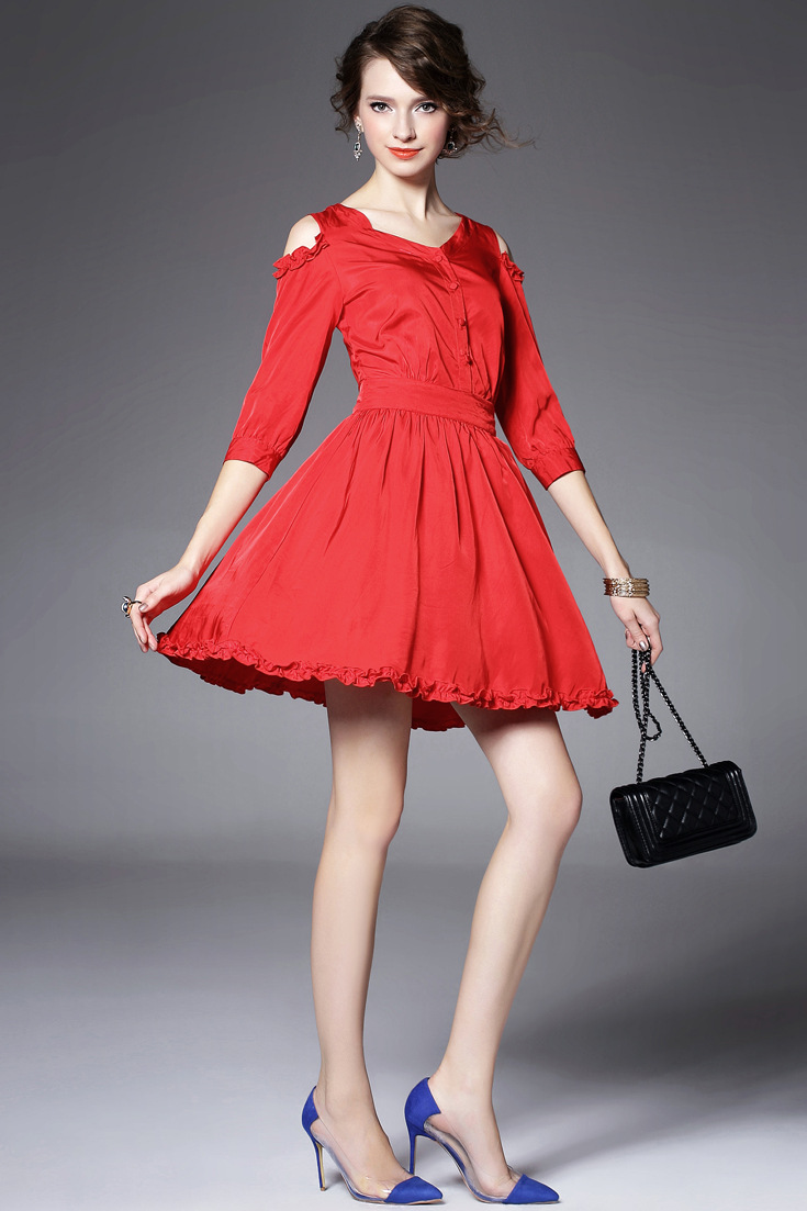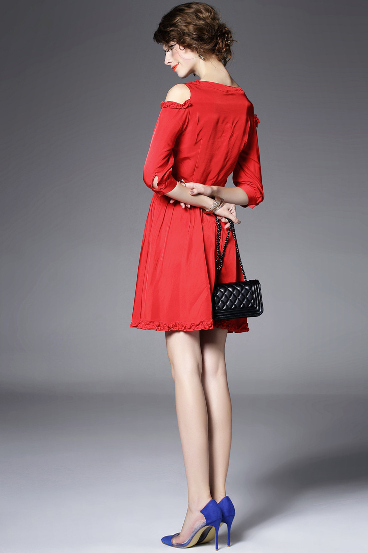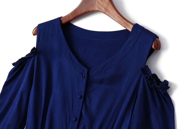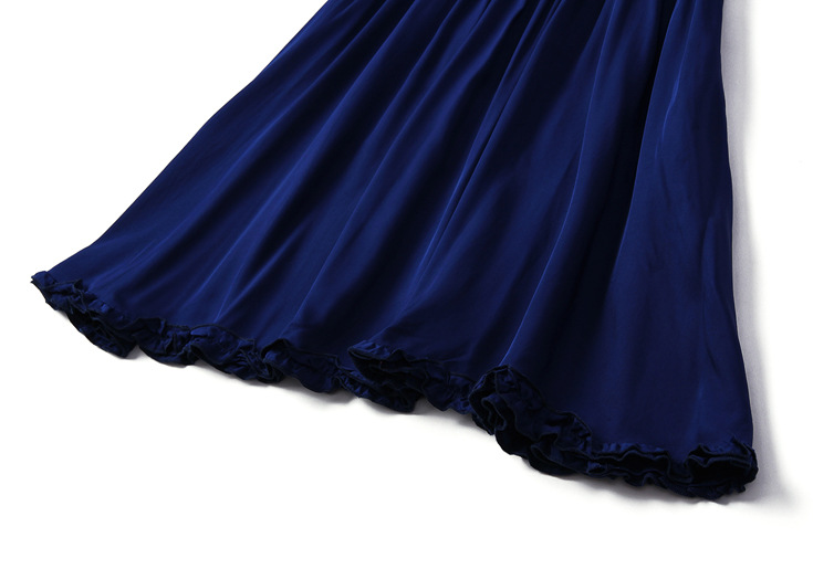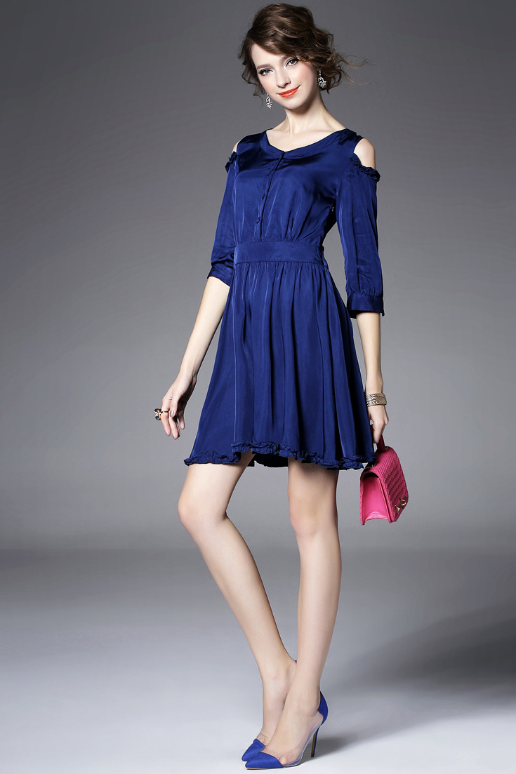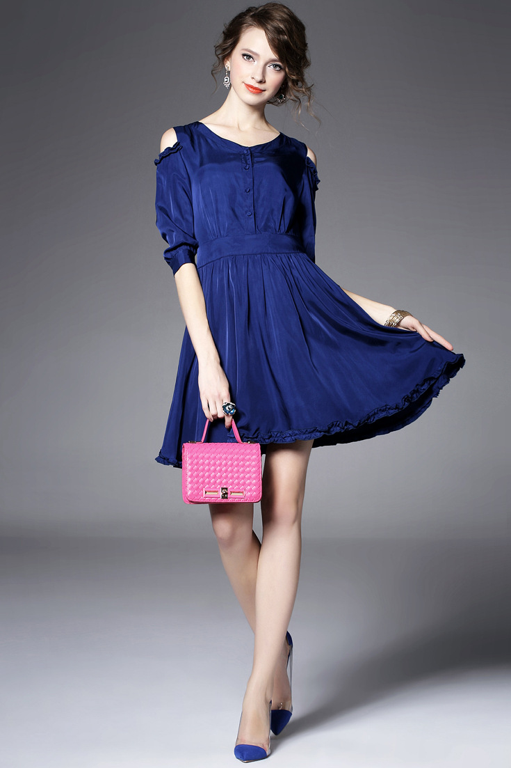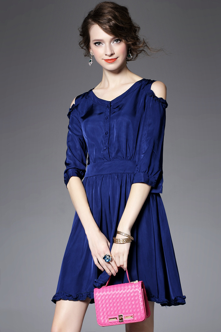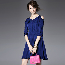 > 2015夏季新款女装圆领露肩木耳边纯色收腰修身真丝连衣裙