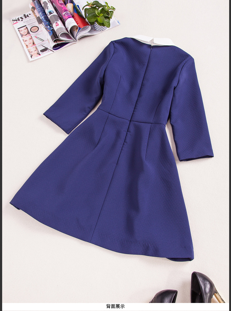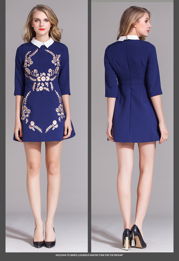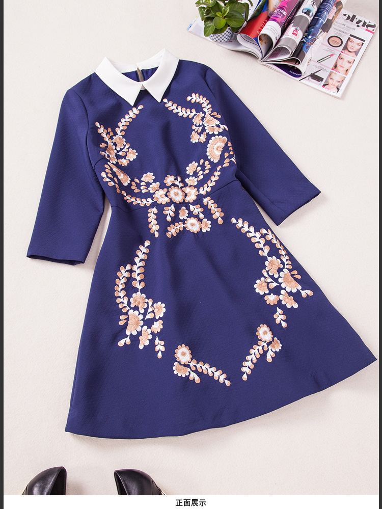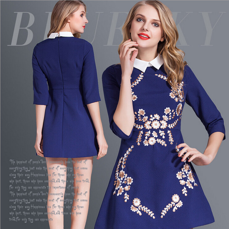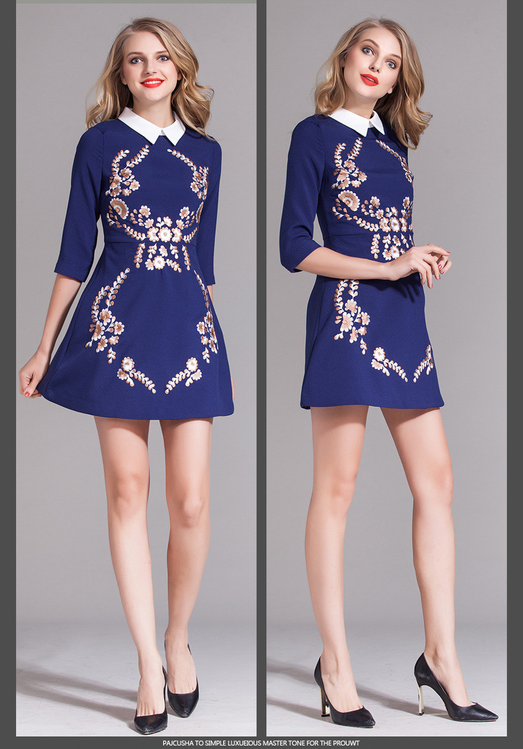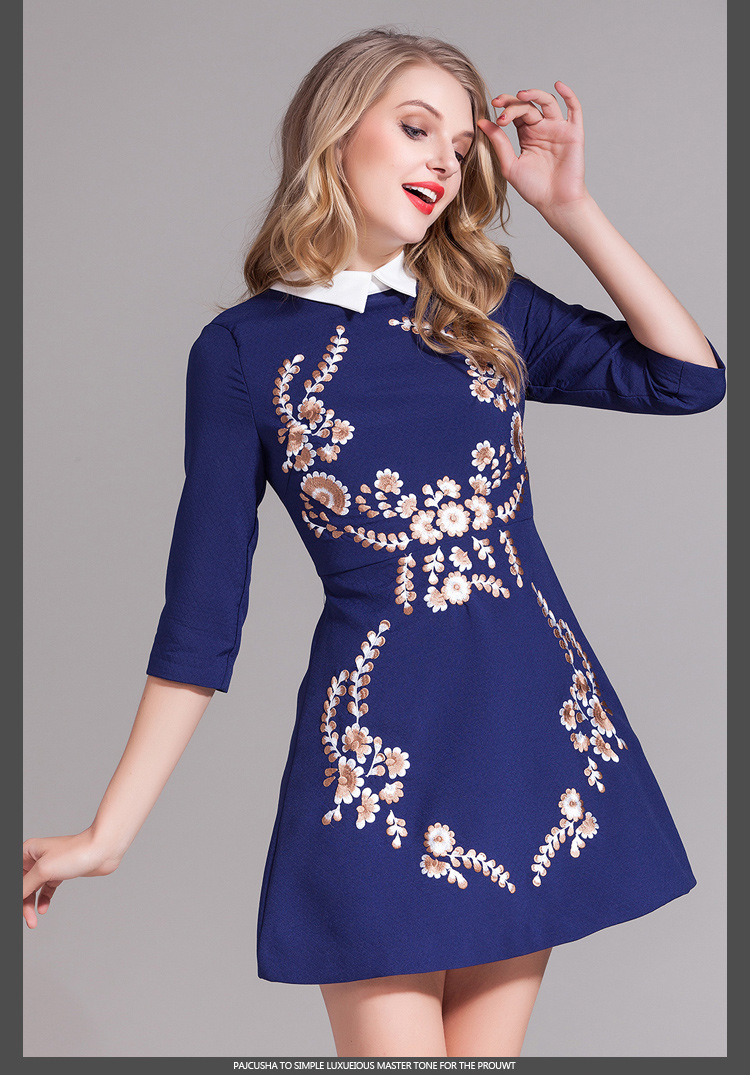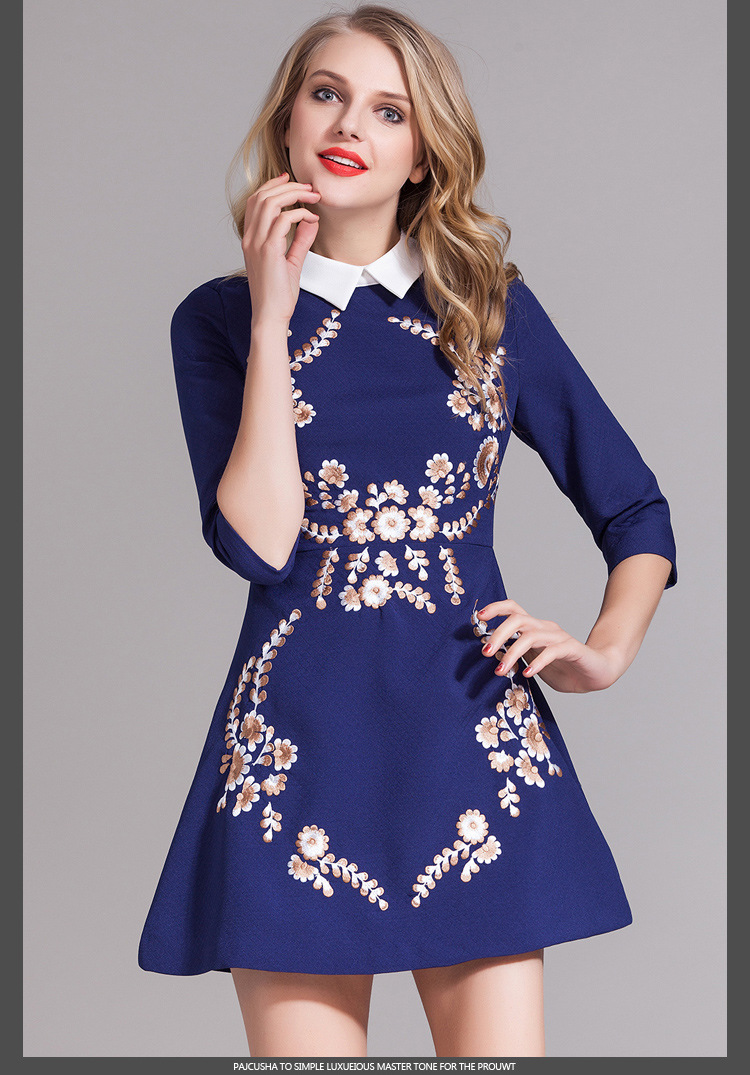 > 2015春装女装欧美新款绣花娃娃领连衣裙七分袖中腰蓬蓬裙短裙