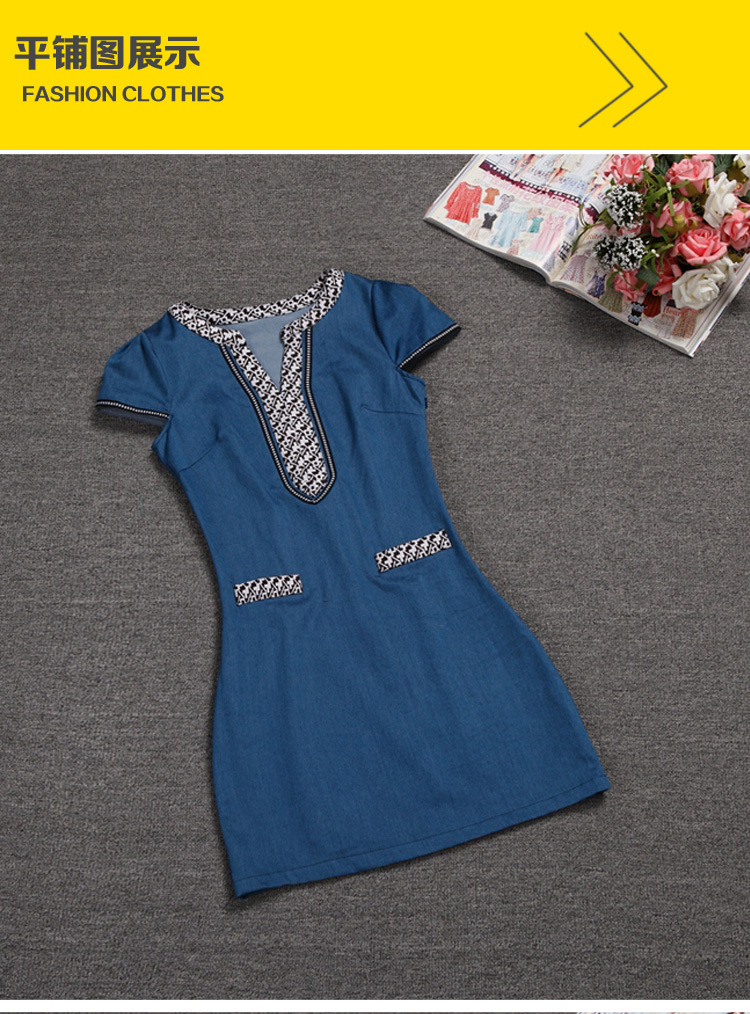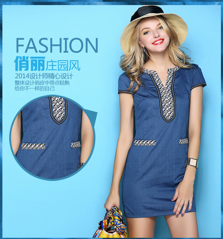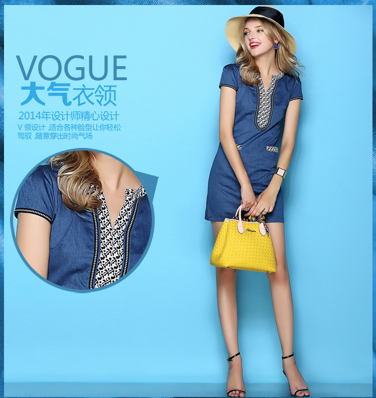 2015春夏新款女装连衣裙无袖V领绣花牛仔连衣裙百褶裙