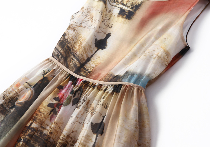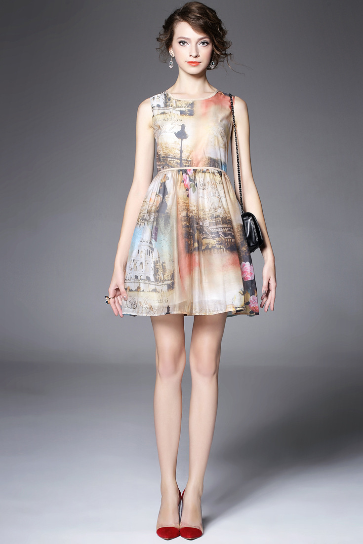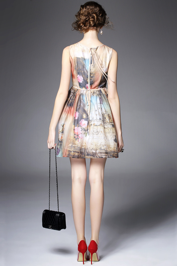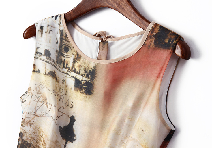 > 2015欧洲站夏季女装新款 欧美大牌印花修身系带无袖连衣裙