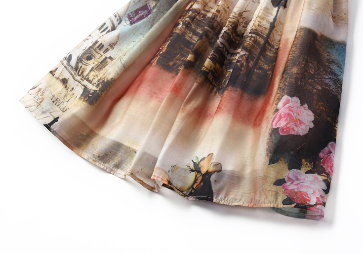 2015春夏新款欧美风印花高档桑蚕丝七分袖A字裙真丝连衣裙