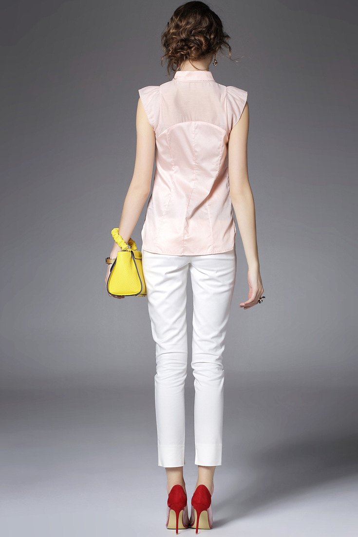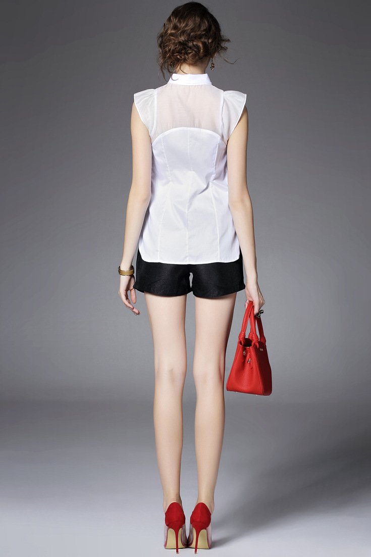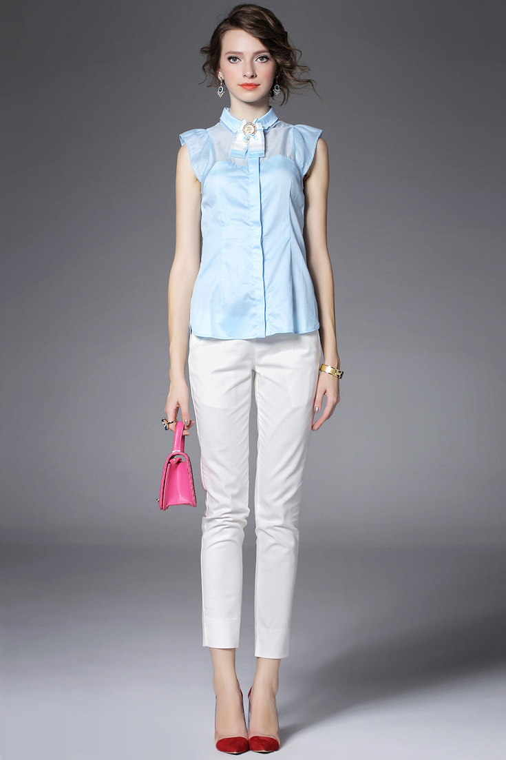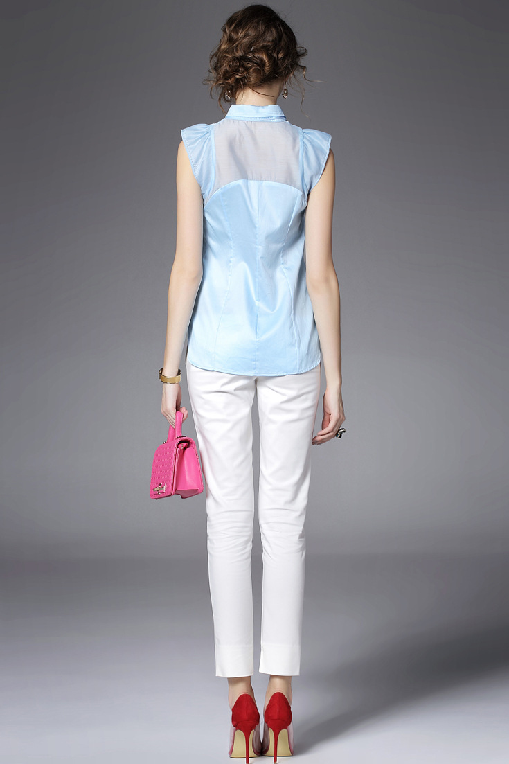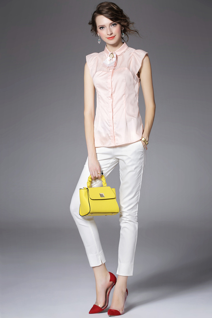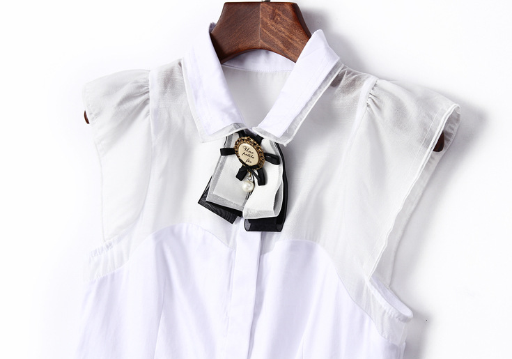 > 2015夏季品牌女装 甜美翻领蝴蝶结钉珠拼接纯色修身无袖衬衣女