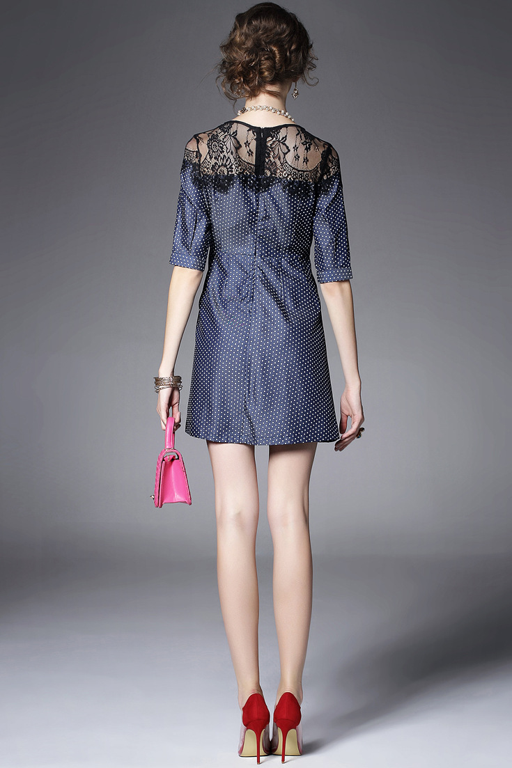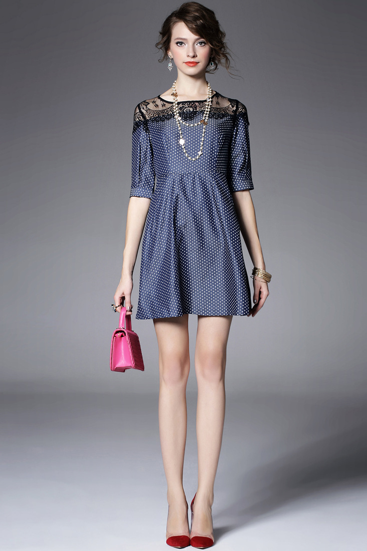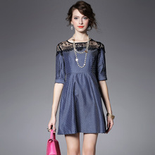 > 2015夏季新款 圆领蕾丝拼接中袖波点印花修身a字裙