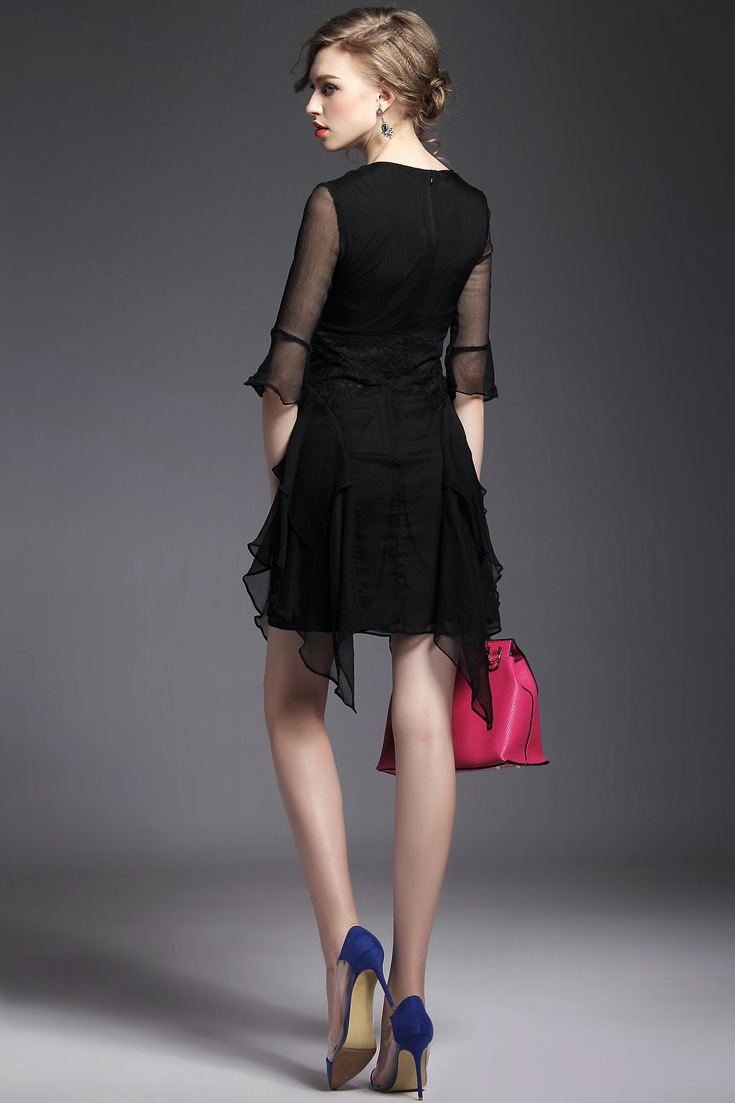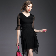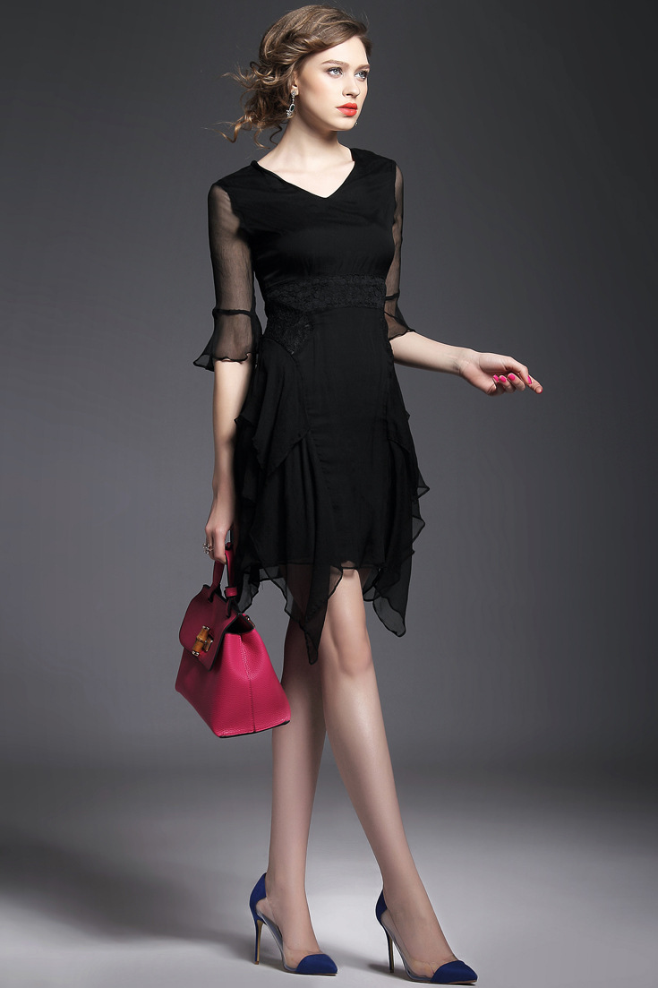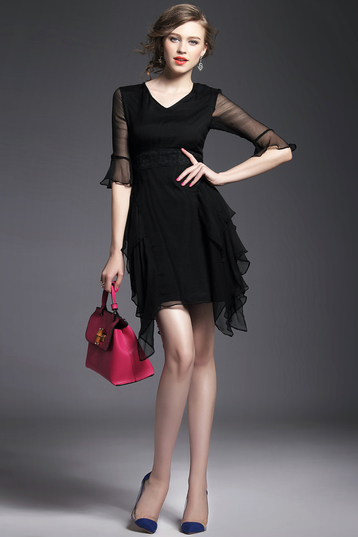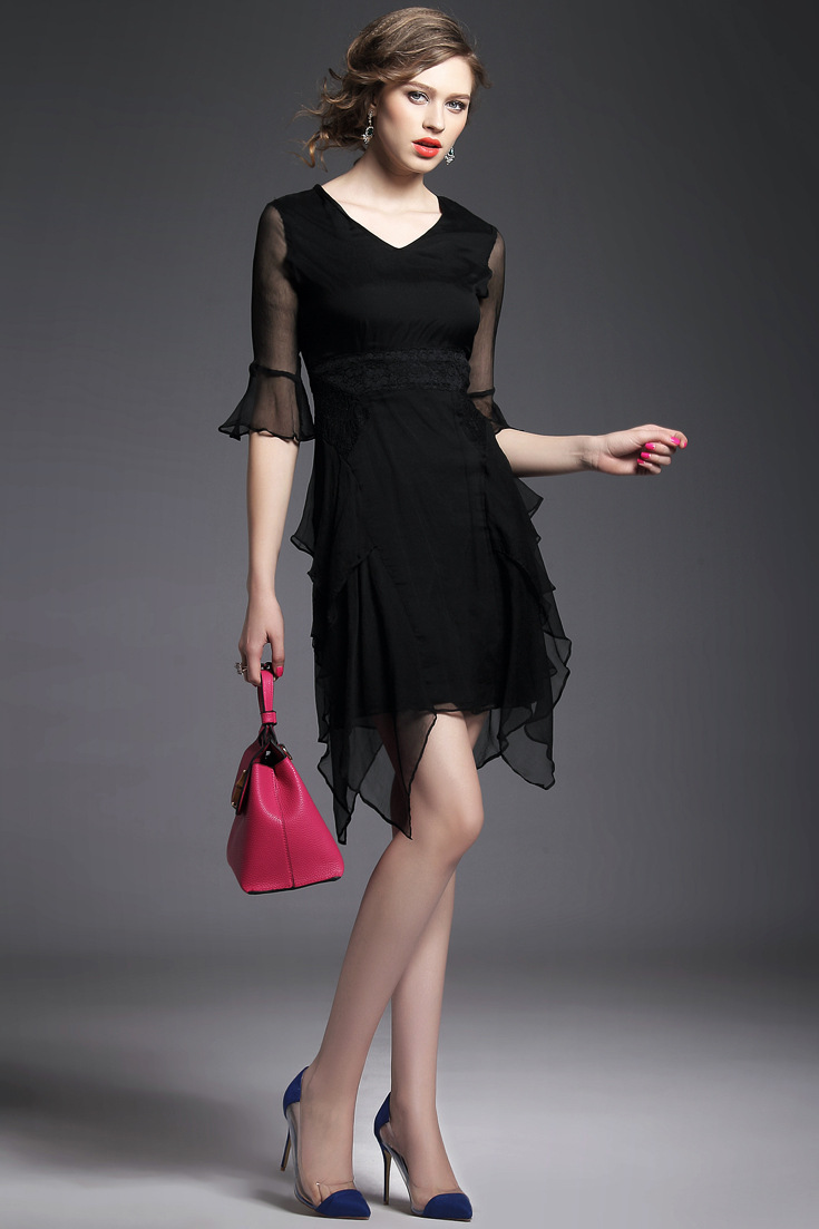 > 2015夏季女装 v领喇叭袖高腰蕾丝拼接纯色不规则真丝连衣裙修身