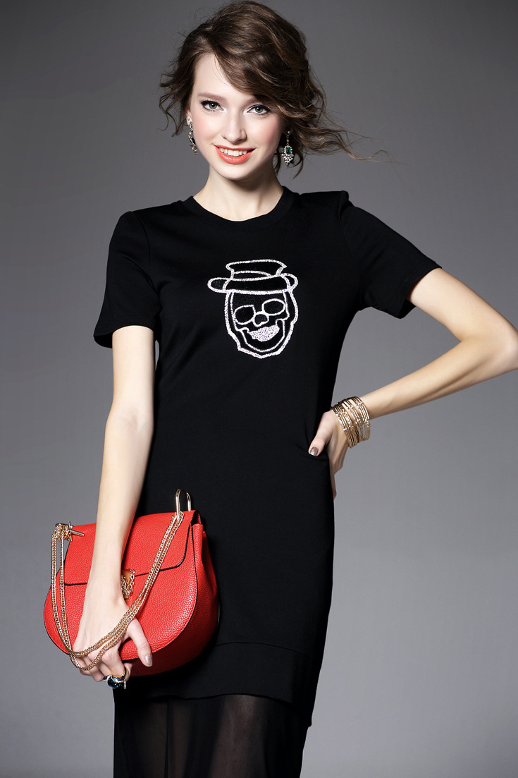 > 2015夏季新款欧美大牌钉钻骷髅头后背字母印花修身包臀中长连衣裙