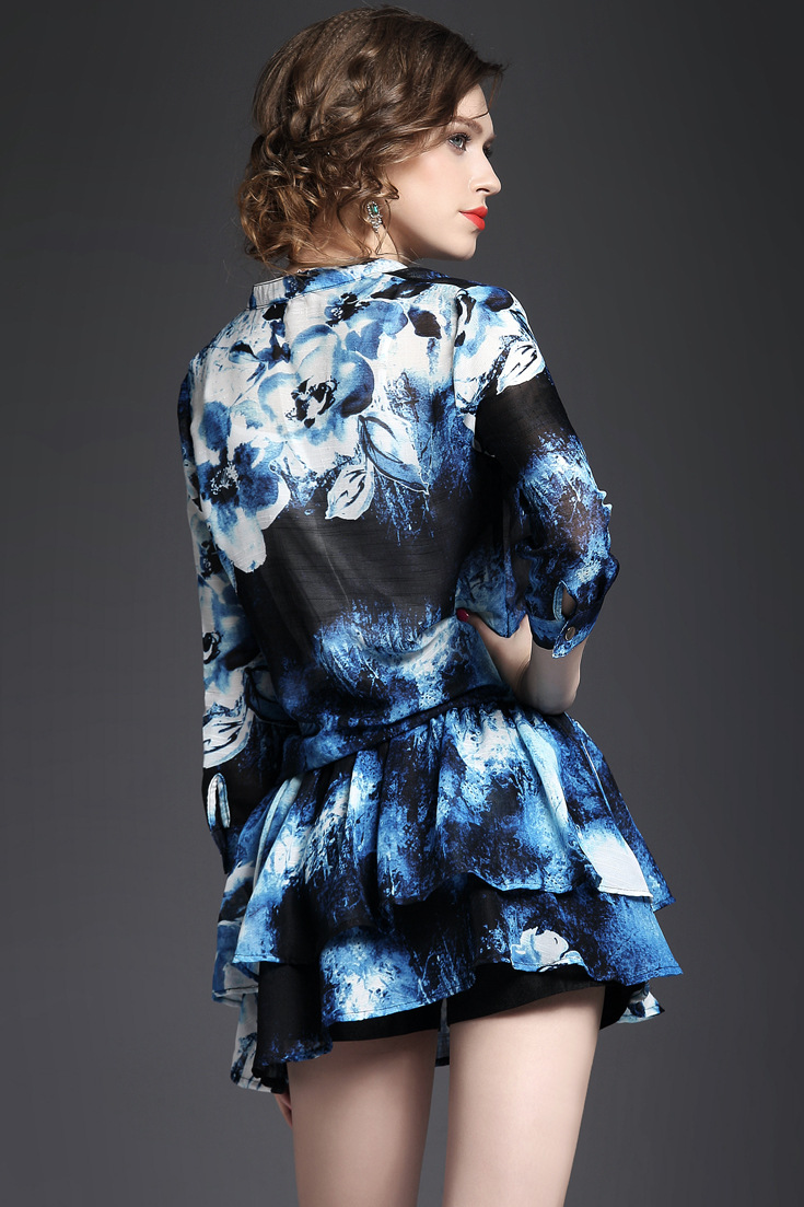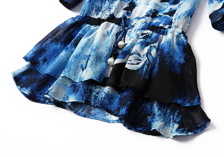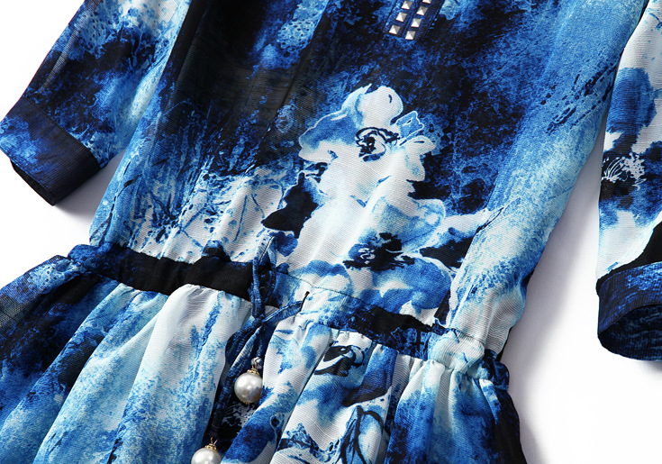 > 2015夏季 欧美高端V领烫钻七分袖收腰系带双层下摆印花修身a字裙