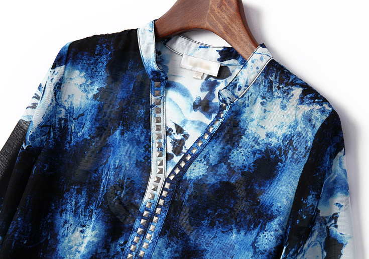 2015春夏季新款欧美风印花真丝连衣裙七分袖衬衣领时尚A字裙