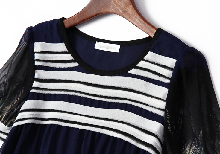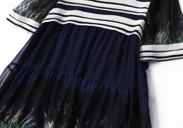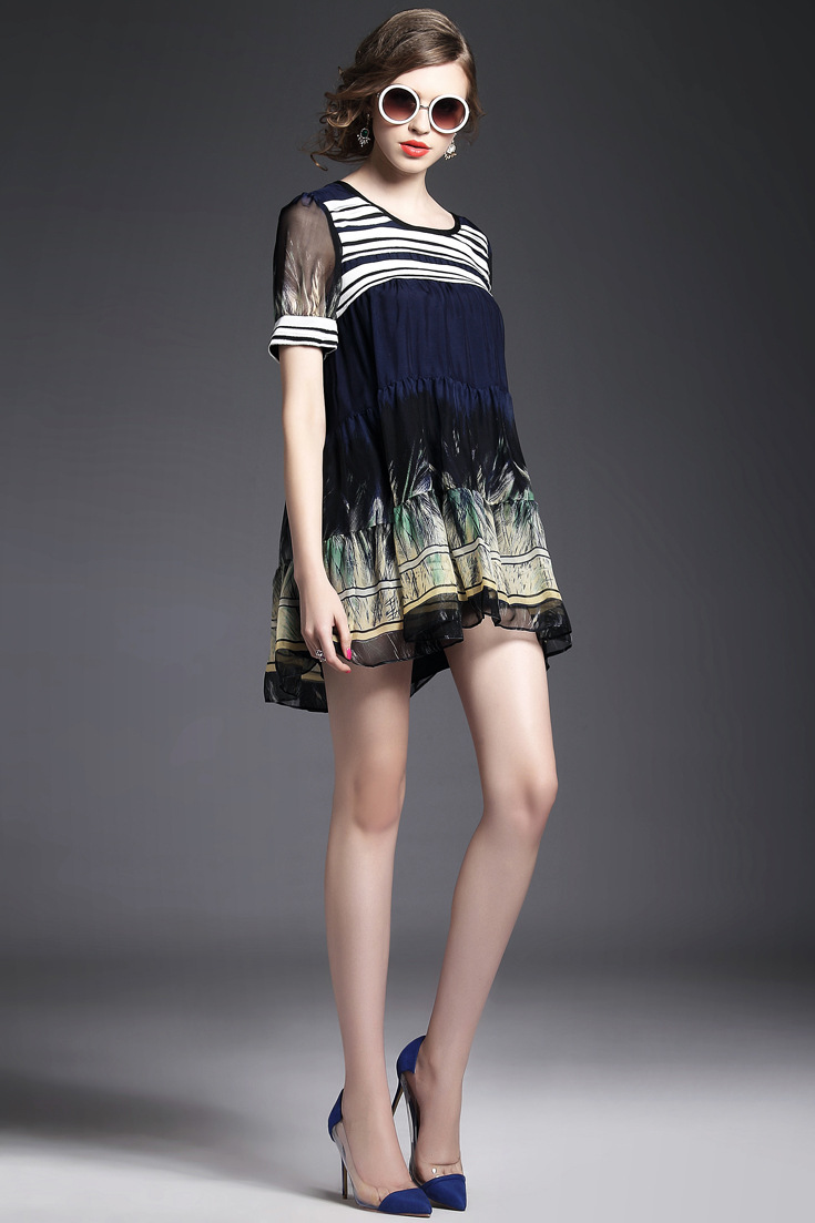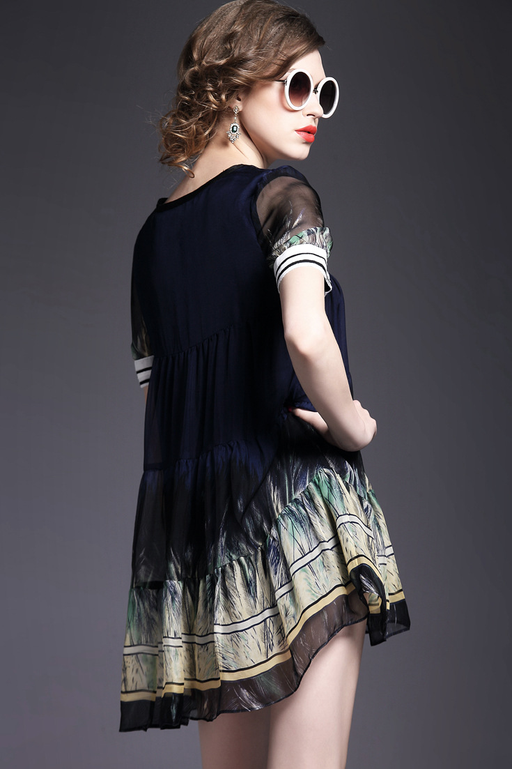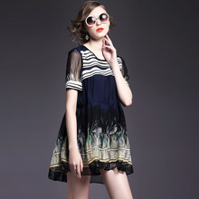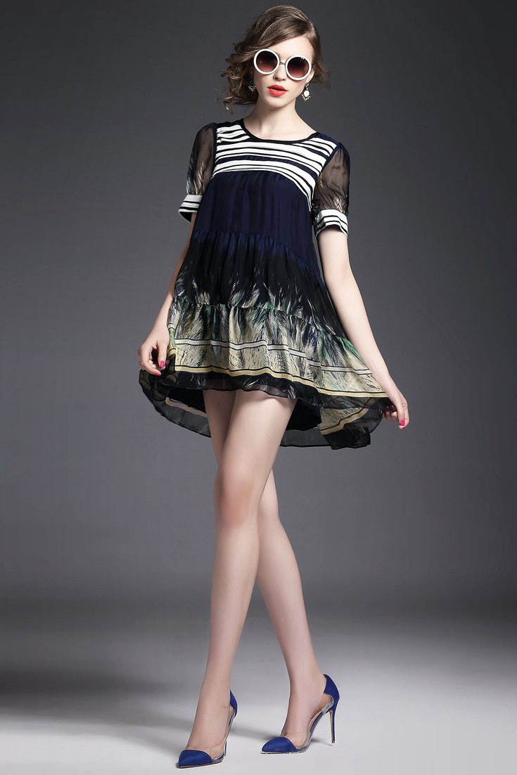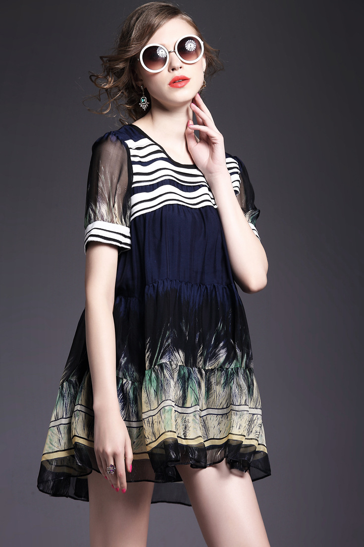 > 2015夏季新款 圆领短袖印花拼接大摆桑蚕丝连衣裙子