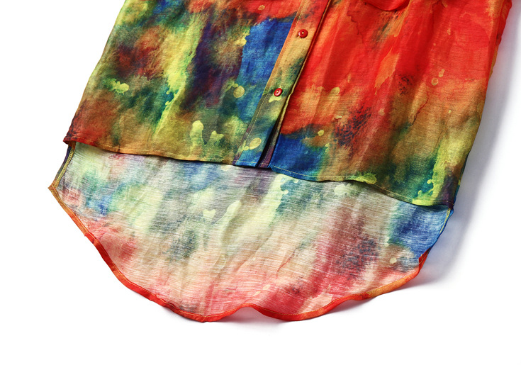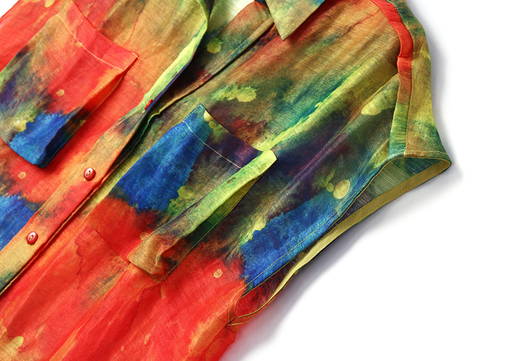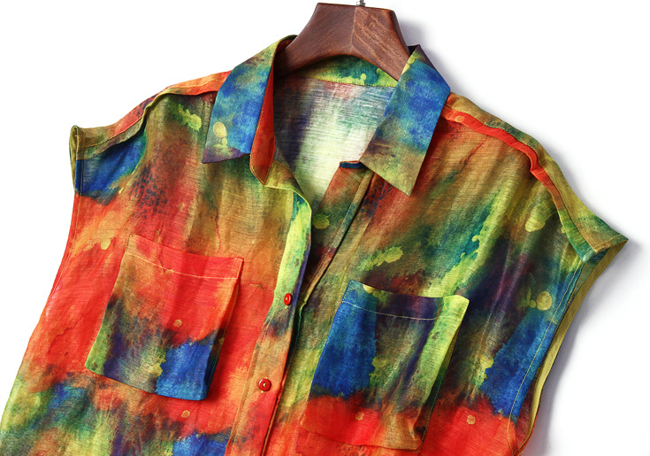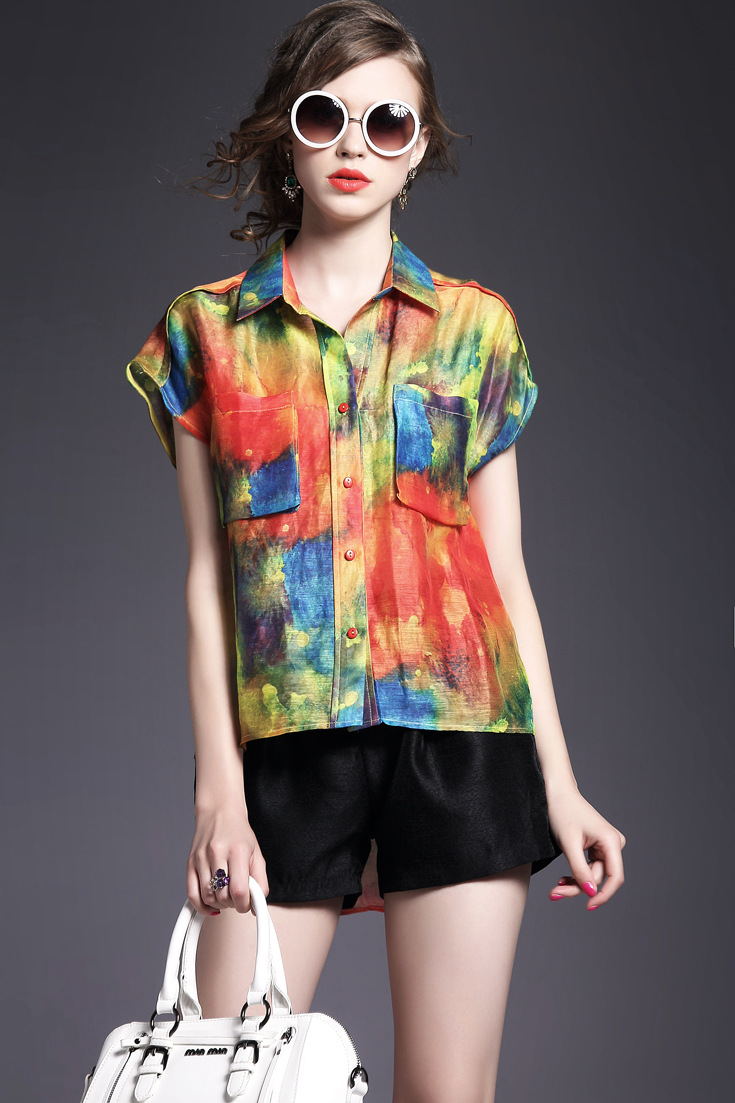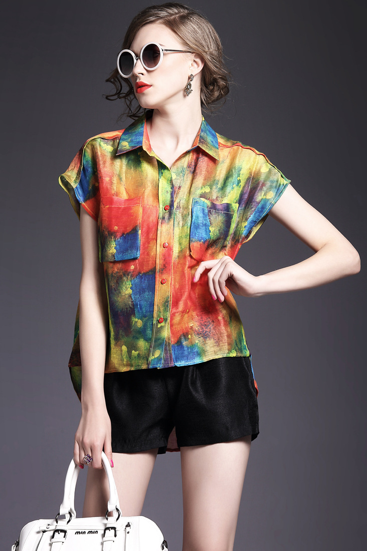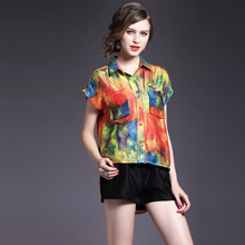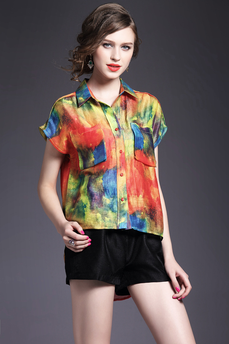 > 2015夏季新款 欧美时尚翻领前短后长丝麻印花衬衫女衬衣品质精品