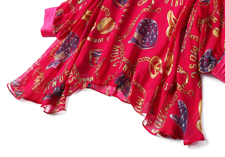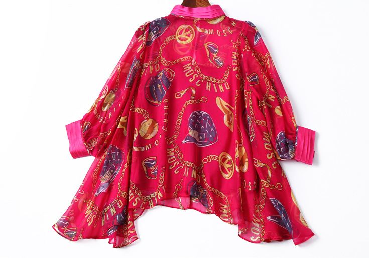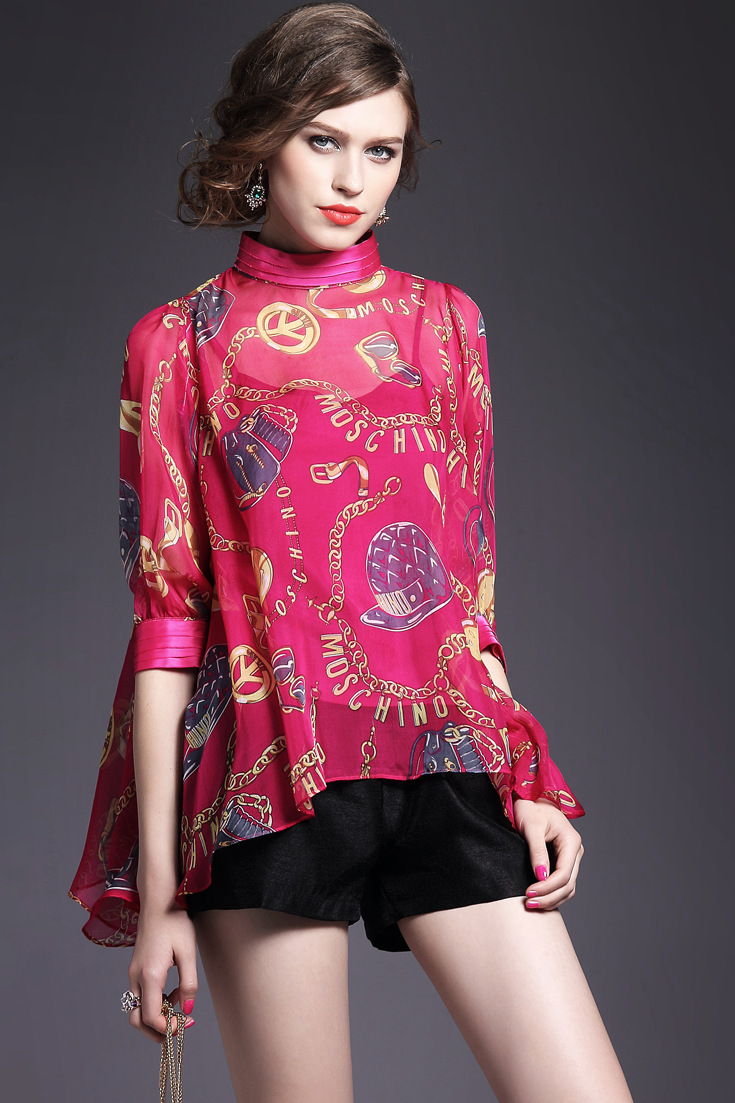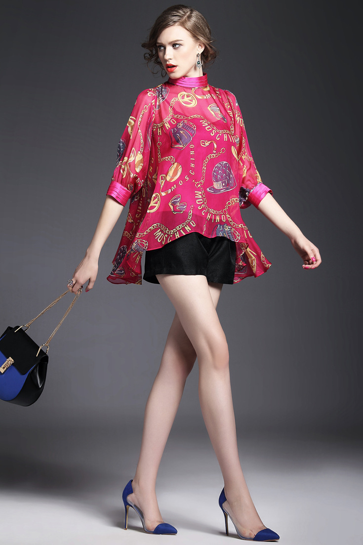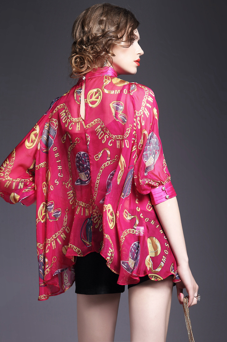 > 2015品牌女装夏季新款 欧美大牌立领中袖不规则桑蚕丝印花衬衣女
