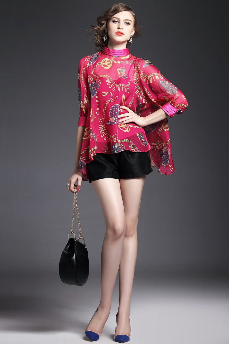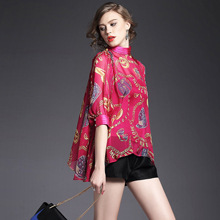 2015品牌女装夏季新款 欧美大牌立领中袖不规则桑蚕丝印花衬衣女