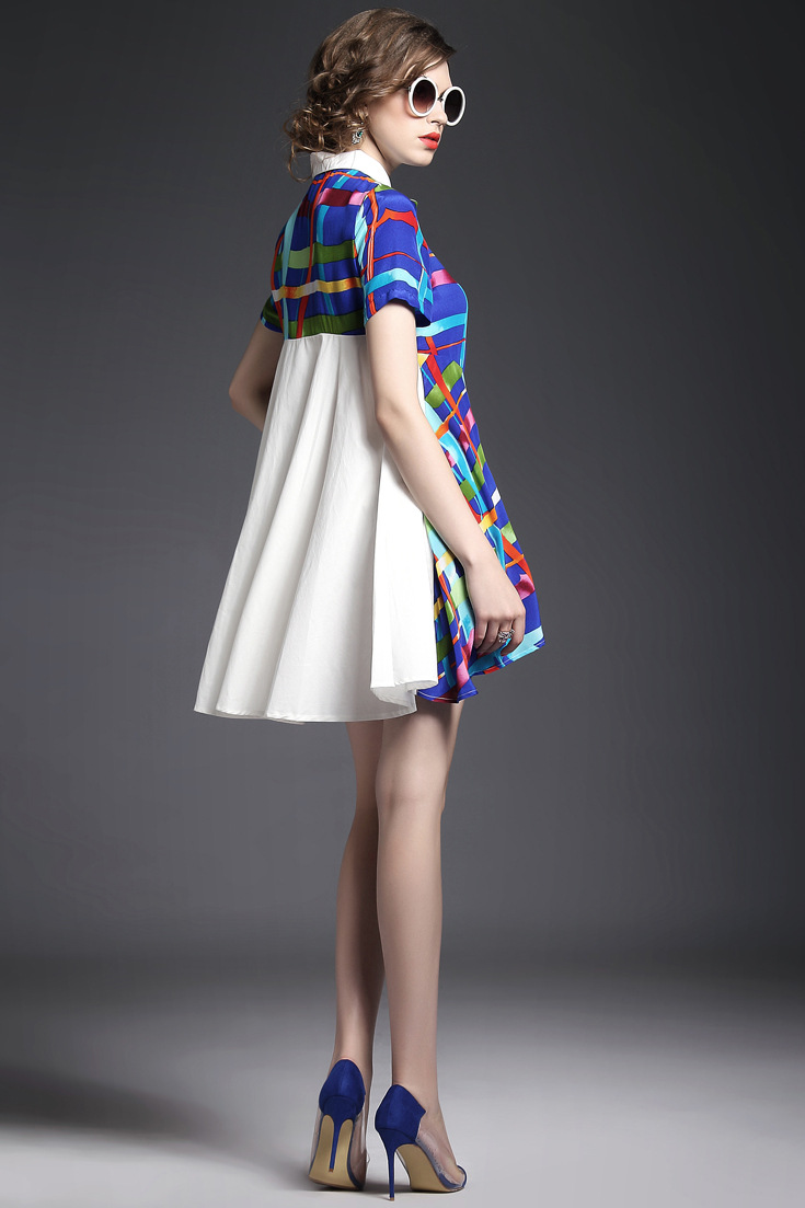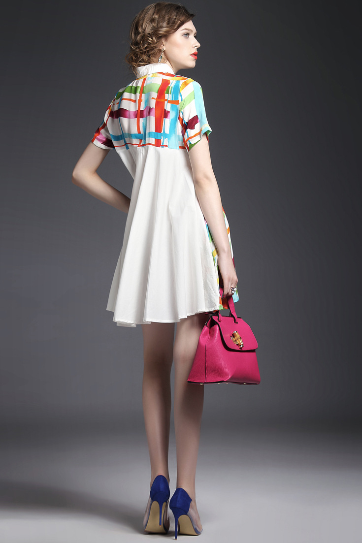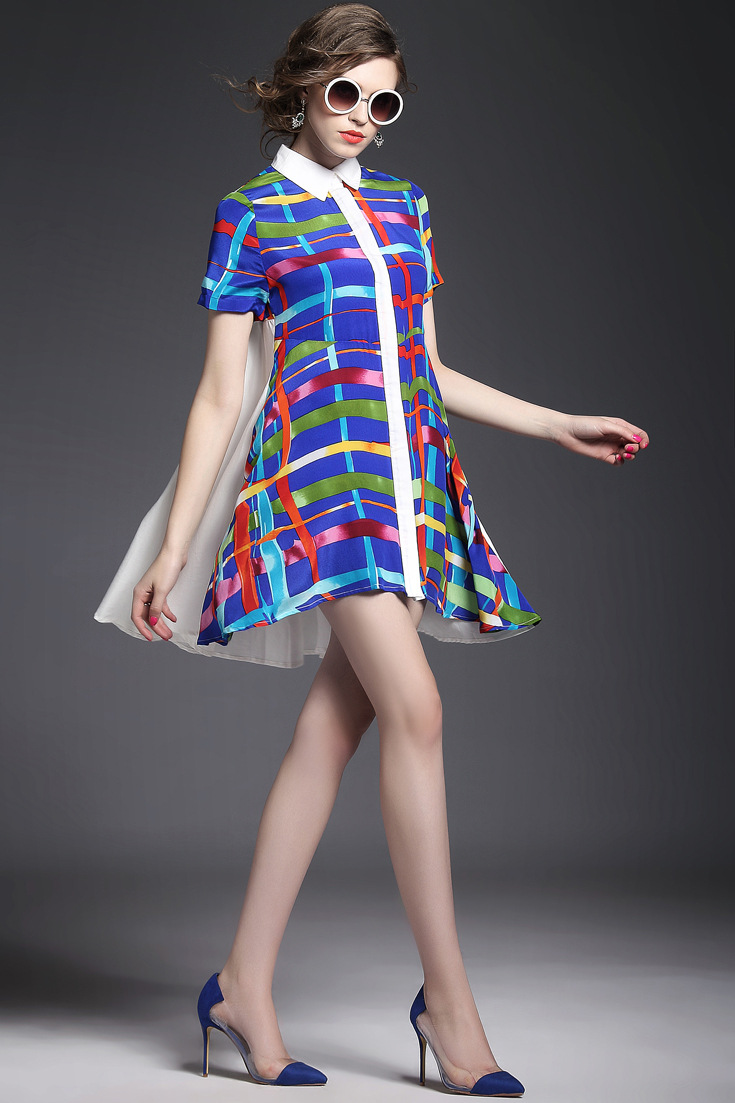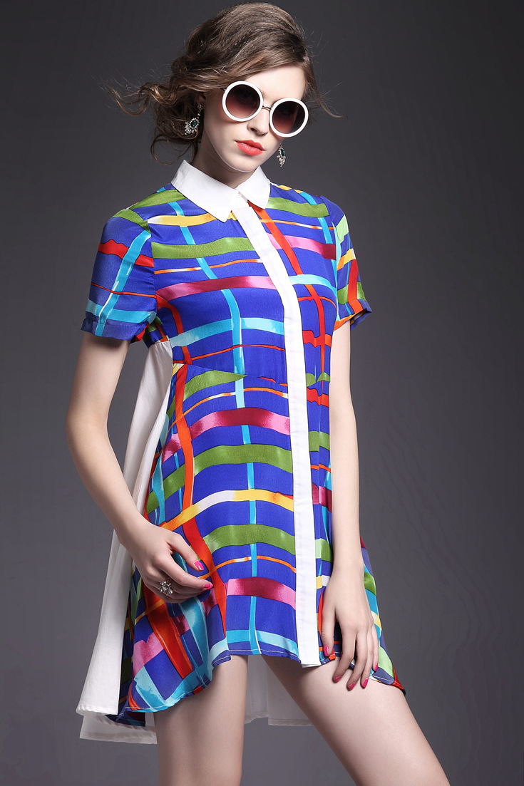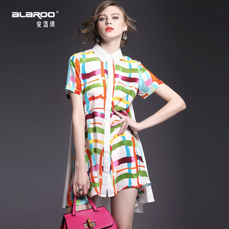 > 2015夏季女装 翻领彩条拼色印花真丝拼接单排扣不规则气质连衣裙