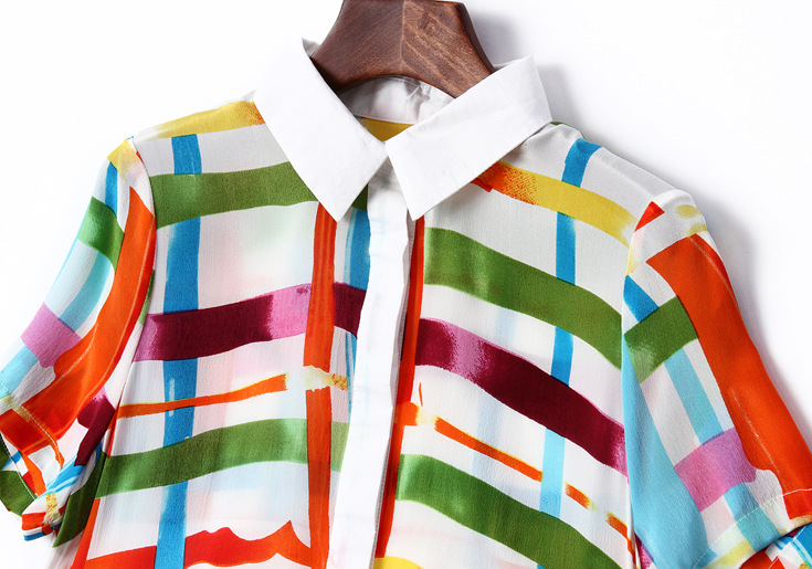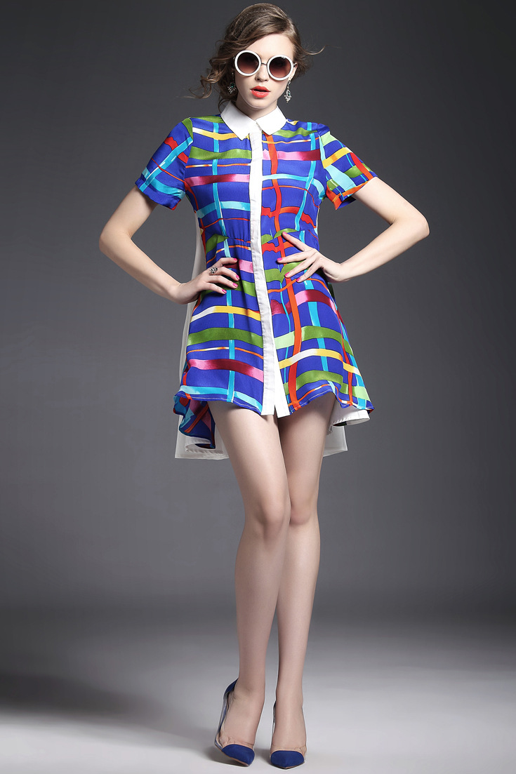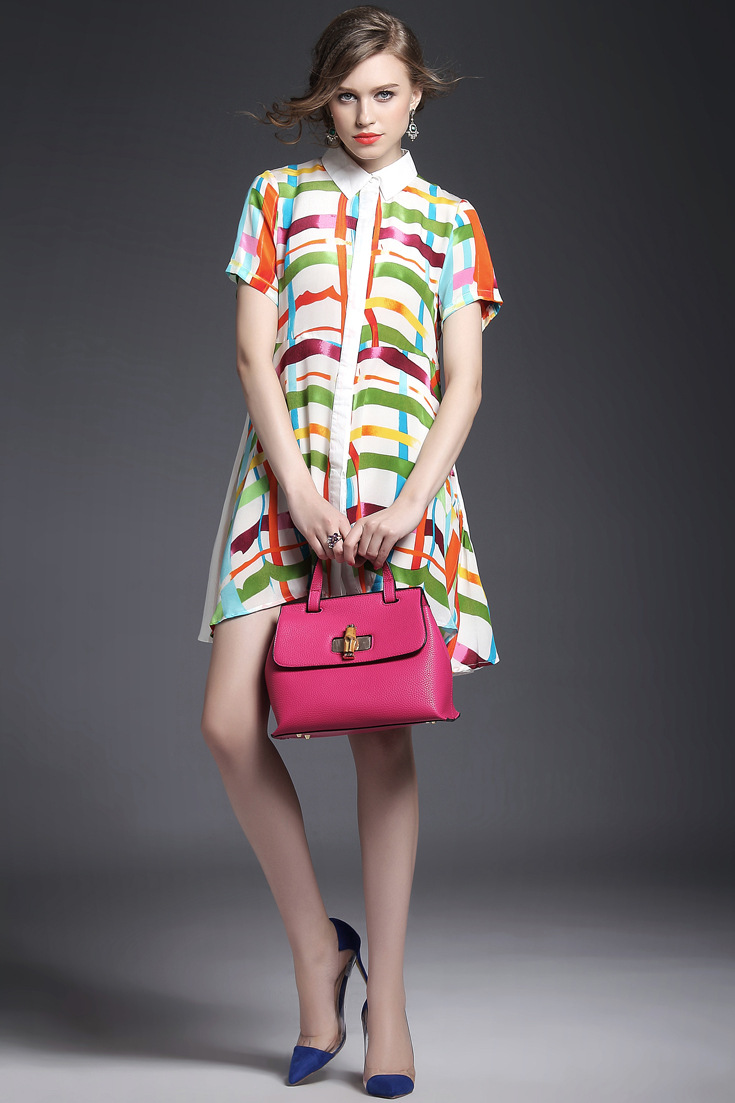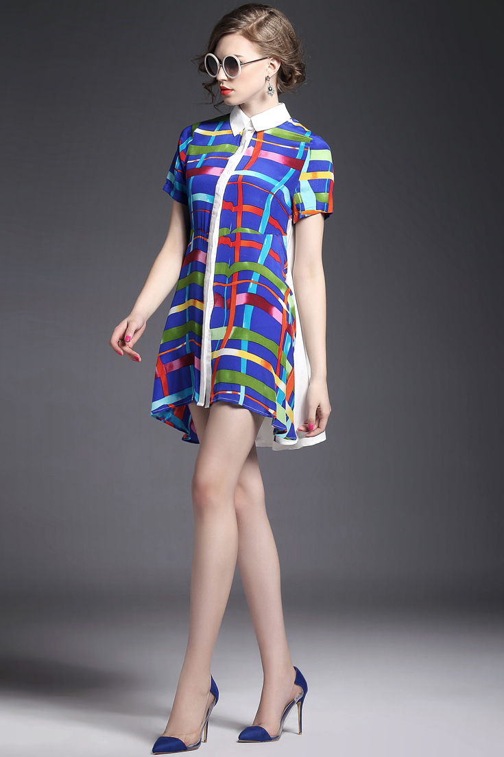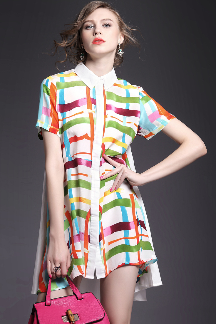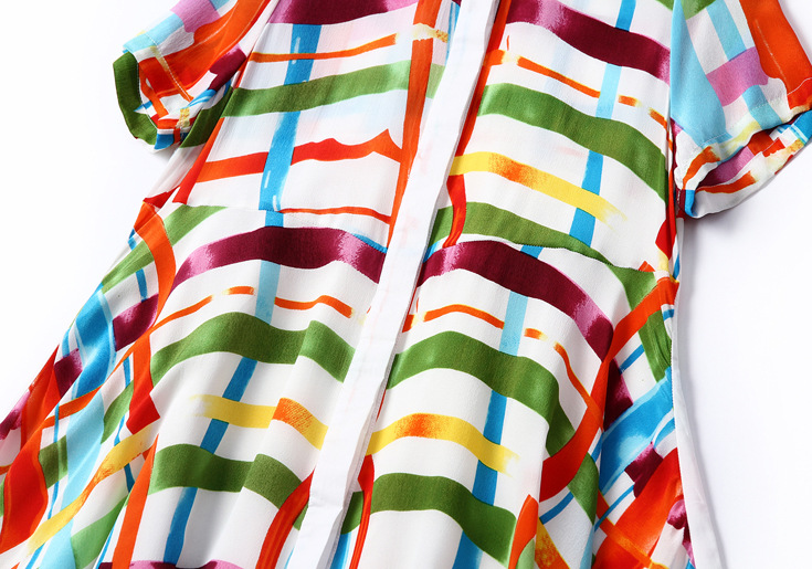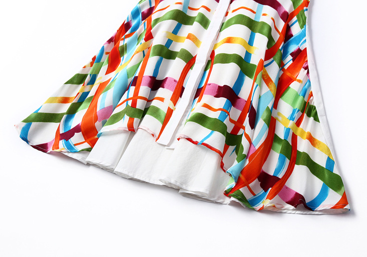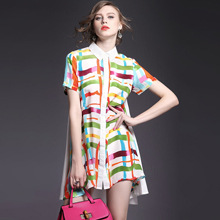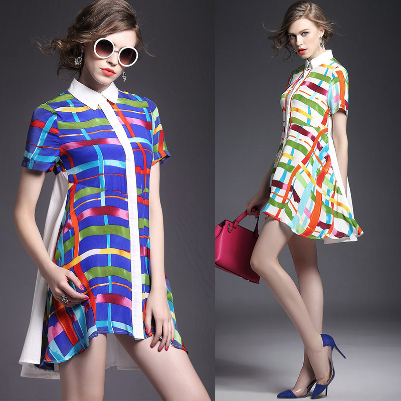 2015夏季女装 翻领彩条拼色印花真丝拼接单排扣不规则气质连衣裙