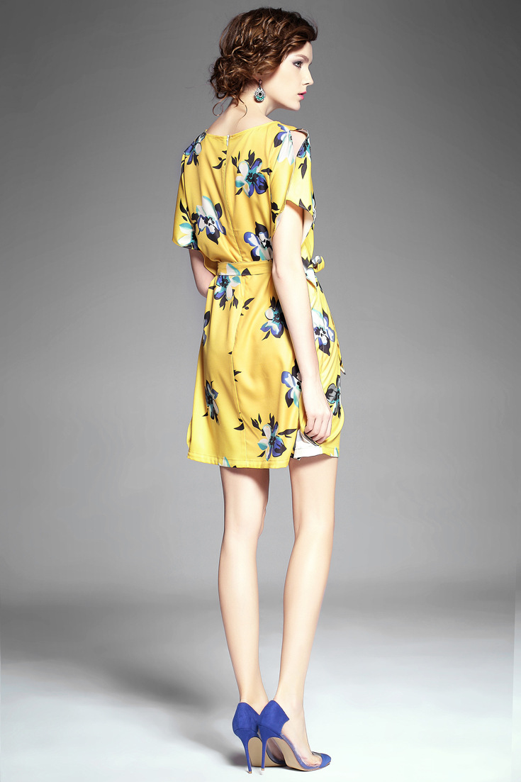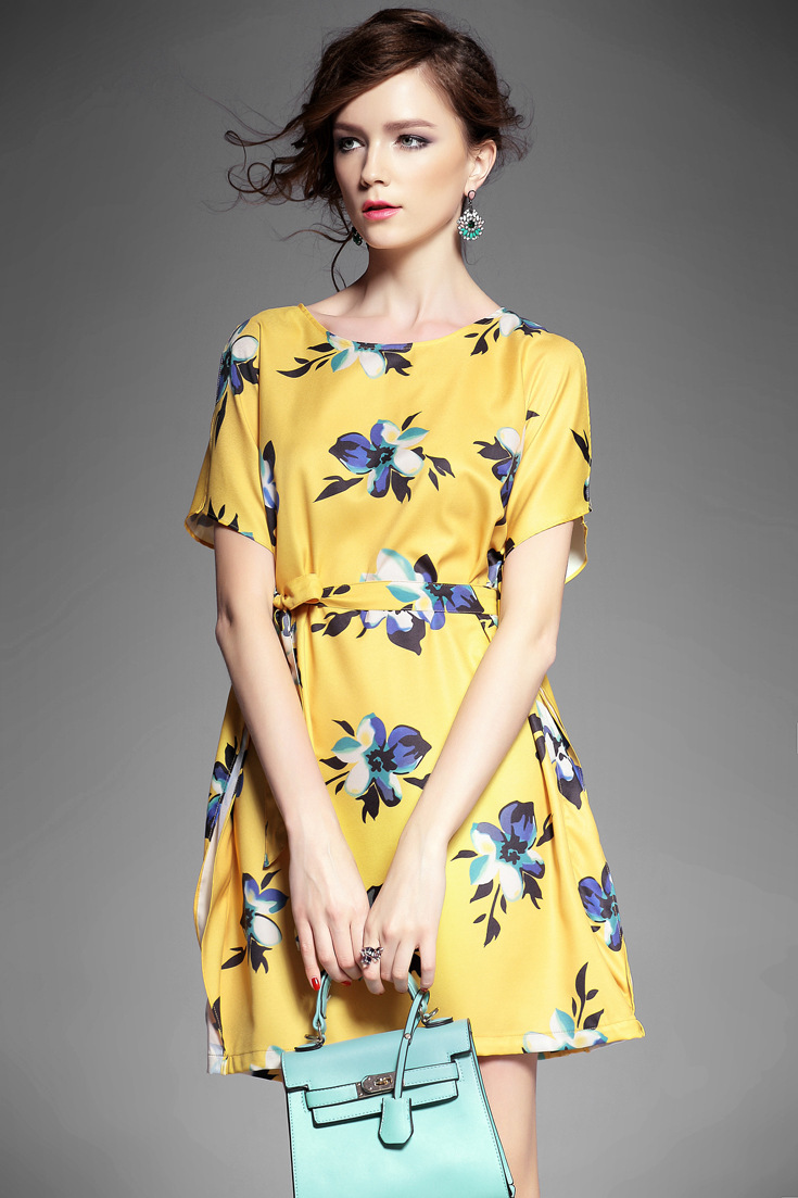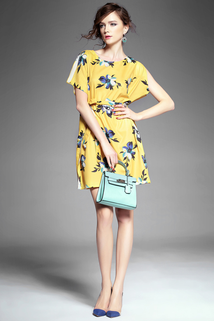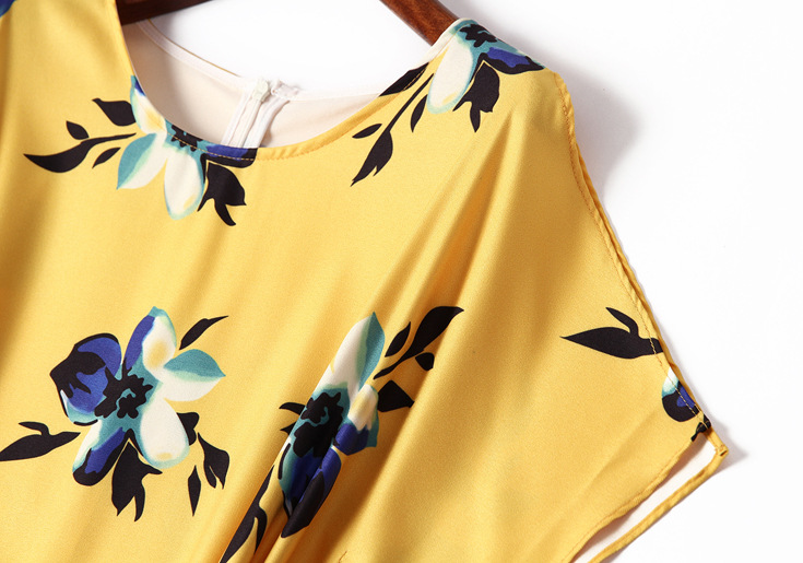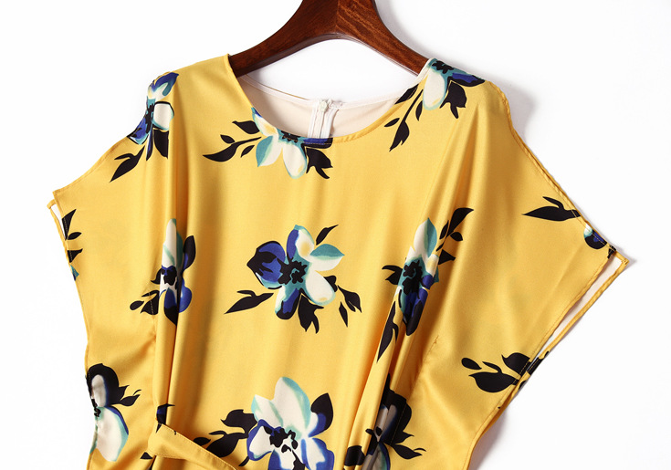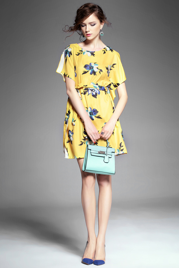 > 2015夏季新款 时尚圆领蝙蝠袖印花系带宽松连衣裙