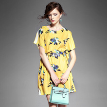2015春夏新款欧美风印花高档桑蚕丝七分袖A字裙真丝连衣裙