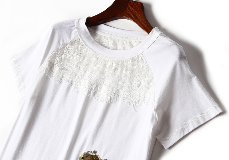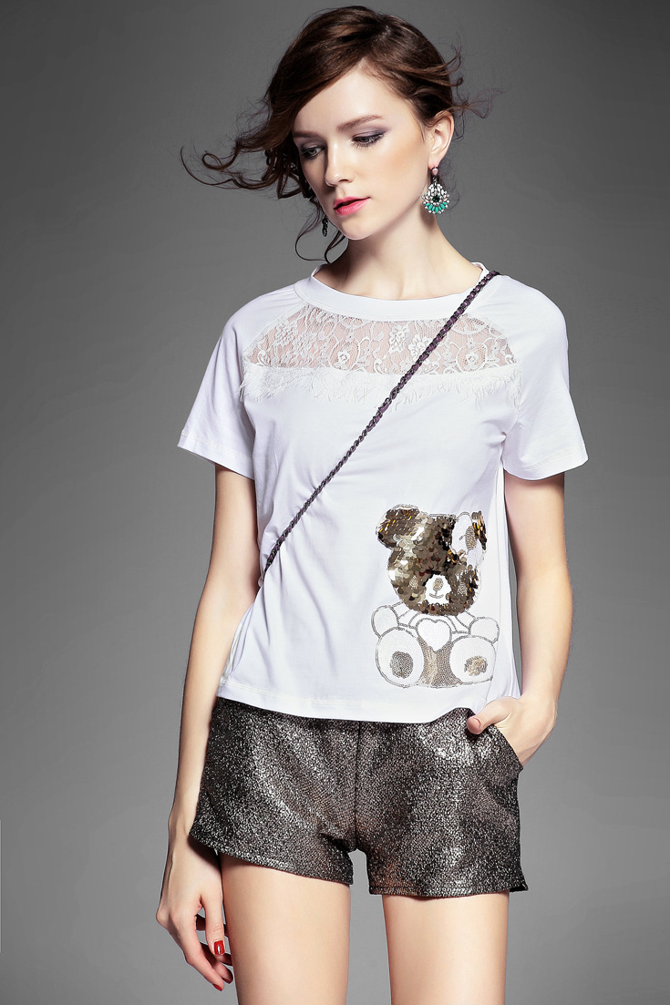 > 2015夏季女装新款 圆领蕾丝拼接小熊亮片绣花弹力棉T恤女