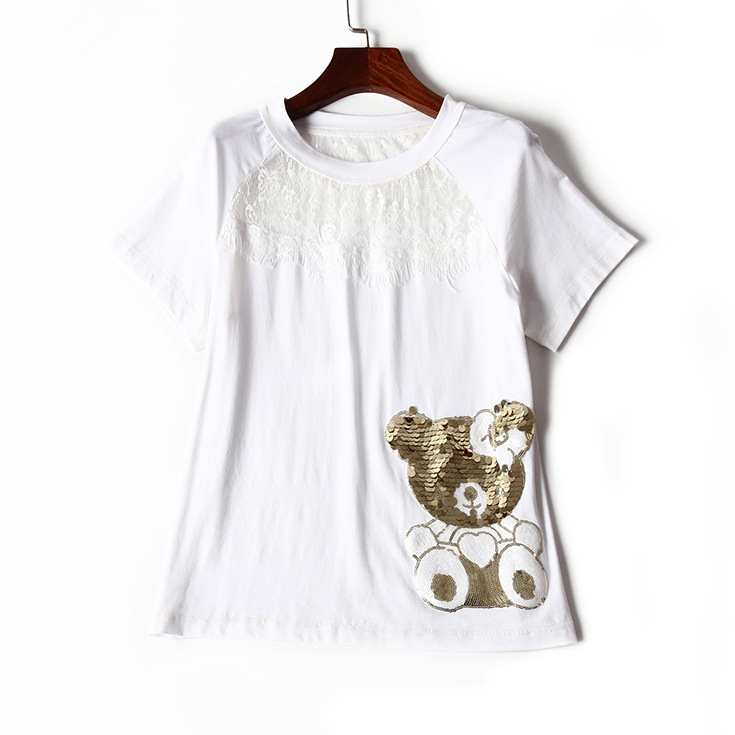 2015夏季女装新款 圆领蕾丝拼接小熊亮片绣花弹力棉T恤女