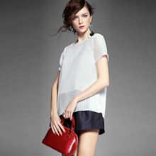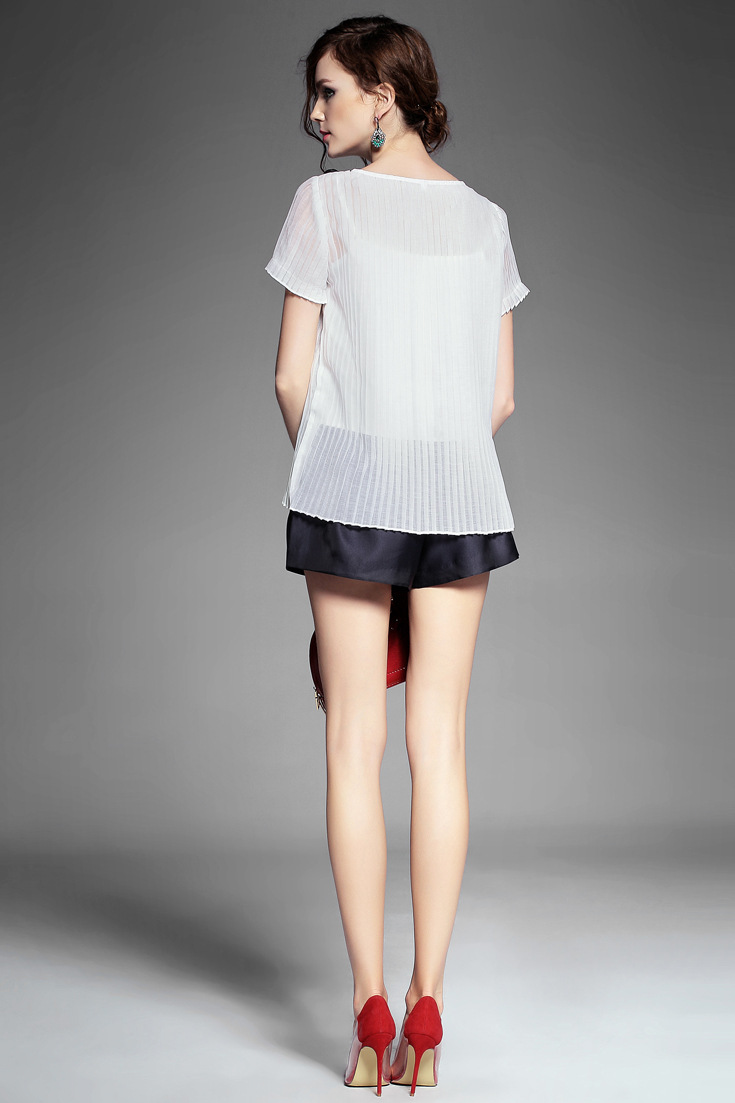 2015夏 欧美时尚不规则后背开叉真丝拼接条纹上衣+阔腿短裤套装