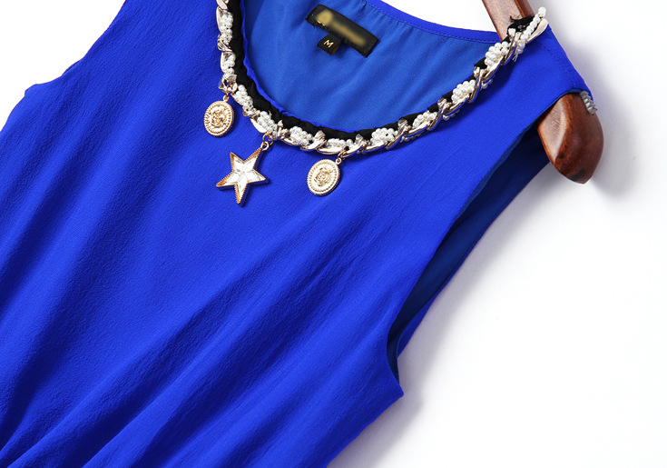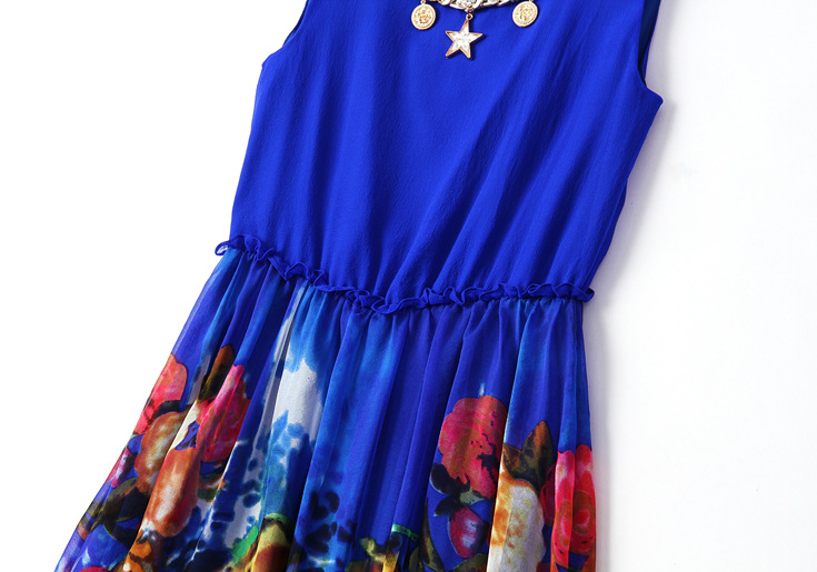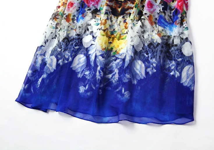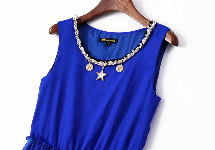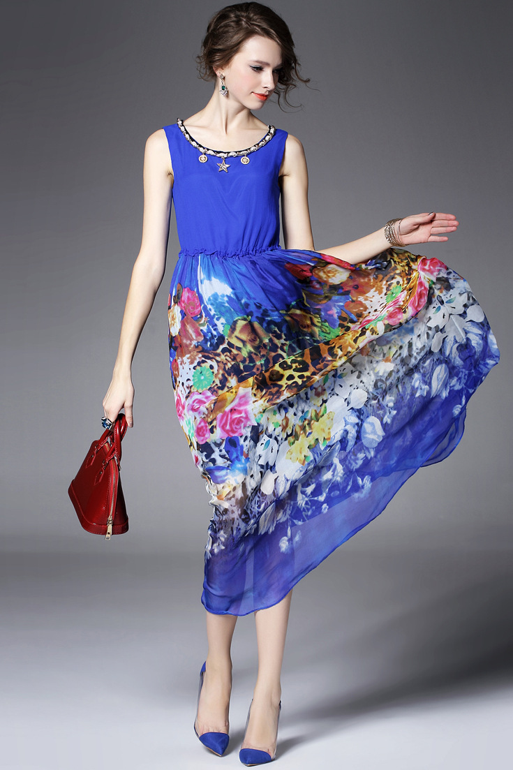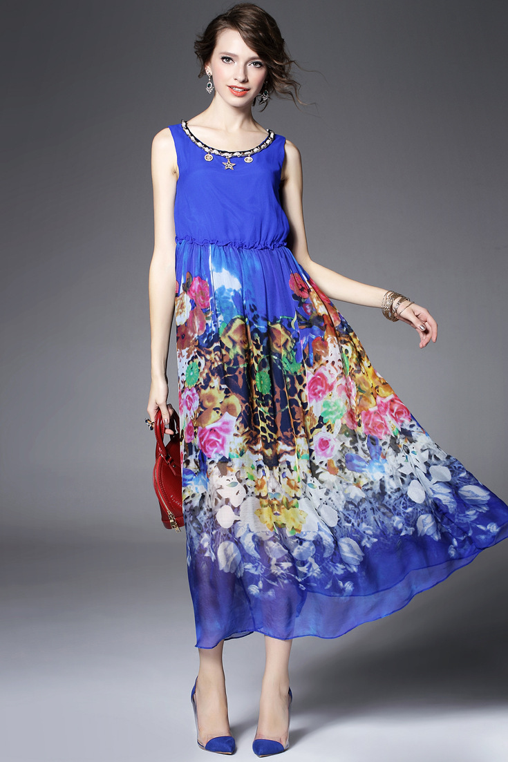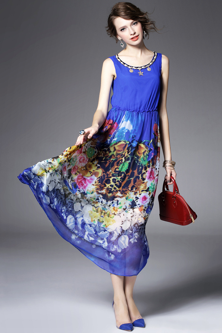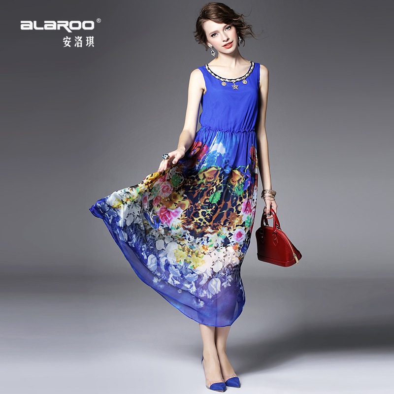 > 2015夏季新款 圆领无袖钉珠弹力收腰印花大摆真丝长裙
